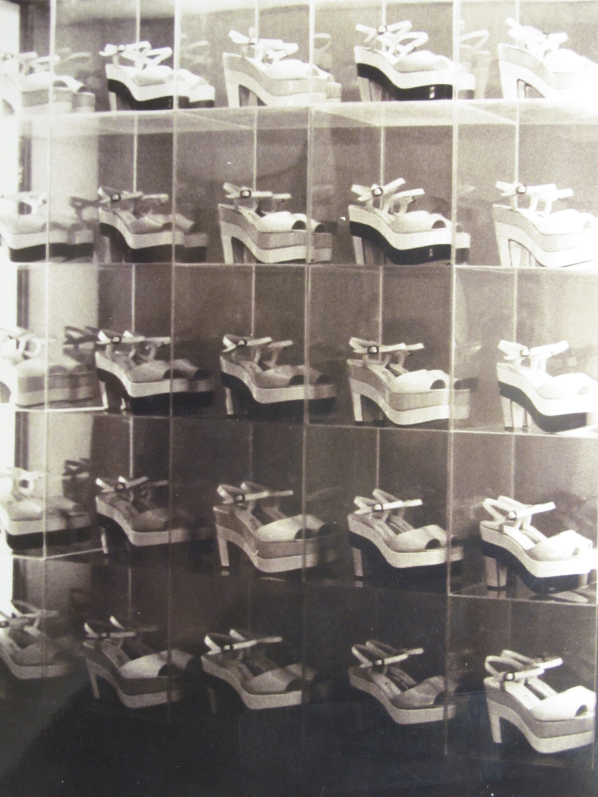 Doble Plataforma consiste en 16 pares de zapatos expuestos en cubos de acrílico dentro de un gran exhibidor de acero e iluminado en su interior. “Lo propuse como un work in progress porque el jurado internacional tuvo que ver, primero la obra en el Di Tella, y luego recorrer las sucursales de la zapatería Grimoldi de la calle Florida o de la Av. Santa Fe para ver el zapato como objeto de consumo. La idea era obra de arte-consumo / consumo-obra de arte”, recuerda Puzzovio.
