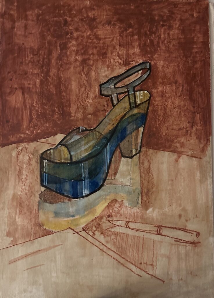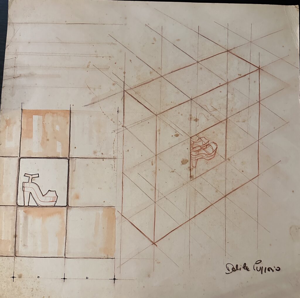 Doble Plataforma consiste en 16 pares de zapatos expuestos en cubos de acrílico dentro de un gran exhibidor de acero e iluminado en su interior. “Lo propuse como un work in progress porque el jurado internacional tuvo que ver, primero la obra en el Di Tella, y luego recorrer las sucursales de la zapatería Grimoldi de la calle Florida o de la Av. Santa Fe para ver el zapato como objeto de consumo. La idea era obra de arte-consumo / consumo-obra de arte”, recuerda Puzzovio.