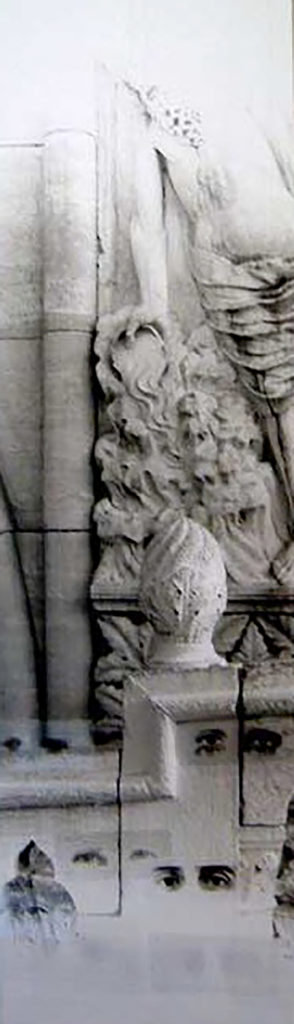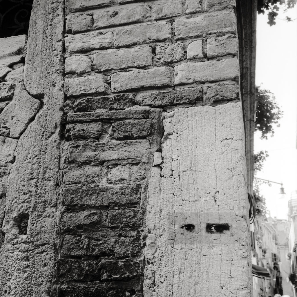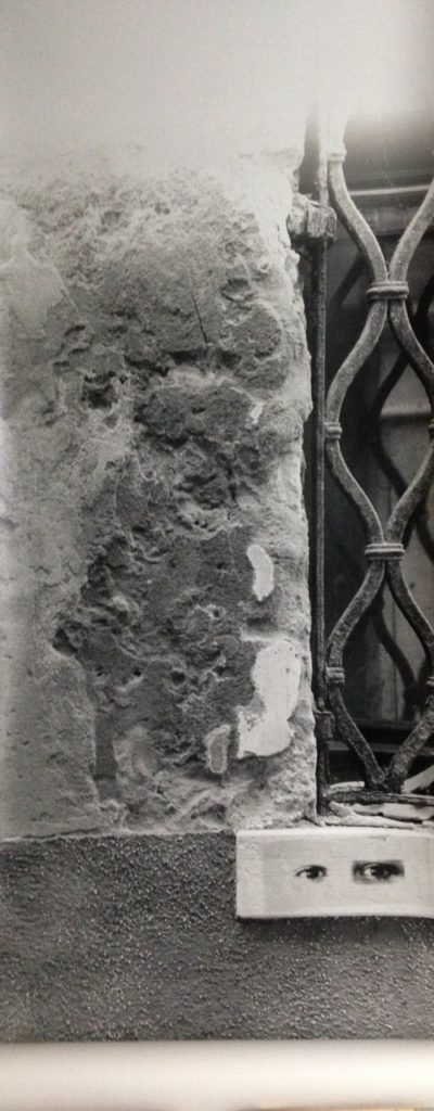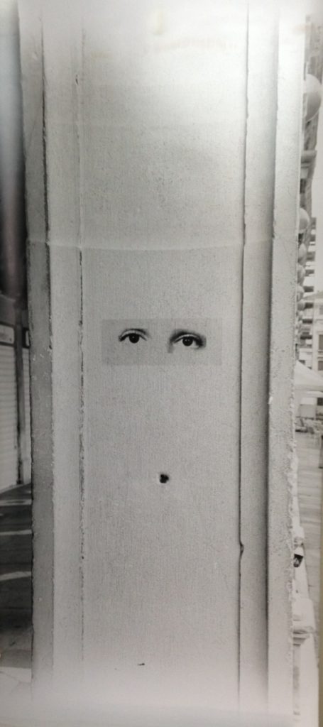 Ahora bien, como hemos señalado, Graciela Sacco ha evitado referir situaciones particulares. A diferencia del uso de fotografías provisto por Nirma Zárate en la serie señalada, al reordenar la información visual y documental para ofrecer un testimonio específico y contextual al observador, o los artistas argentinos en la muestra de Tucumán Arde, que expusieron las condiciones de miseria que vivía la población tucumana, las variaciones de Bocanada animan un uso no documental de la imagen fotográfica. Más bien, como lo hace Beatriz González, Sacco apela a imágenes que, al sustraerse de su contexto de circulación original, se tornan genéricas y se convierten en arquetipos o en imágenes con un valor atemporal y universal que cobra sentido de acuerdo con el nuevo contexto en el que se sitúan. Esto puede comprobarse en varias obras posteriores, como en Entre nosotros (2001/2014), de la serie Esperando a los bárbaros (1995/2014), donde tomó una sucesión de imágenes de ojos, dispuestos siempre en un reducido marco rectangular, y los ubicó, desde 2001, en muros y paredes de diversos lugares con valor histórico en el mundo. Si bien cada imagen es única e irrepetible, la doble descontextualización que procura Sacco —supresión del fondo y eliminación del rostro— acrecienta la imposibilidad de darle identidad o singularidad a esas imágenes. En consecuencia, aquella universalidad y atemporalidad que les caracteriza, posibilita que, de acuerdo con el lugar y el momento de la intervención, se active la imaginación y la memoria de los transeúntes, quienes terminan por otorgarles un nuevo sentido a las imágenes. La tranquilidad de los caminantes se ve perturbada por las miradas fantasmales de aquellos que parecen asomar sobre muros y paredes agrietados, y a cada quien recuerdan alguna coyuntura, conflicto o guerra que, en distintos niveles, ha vivido la humanidad desde hace siglos.