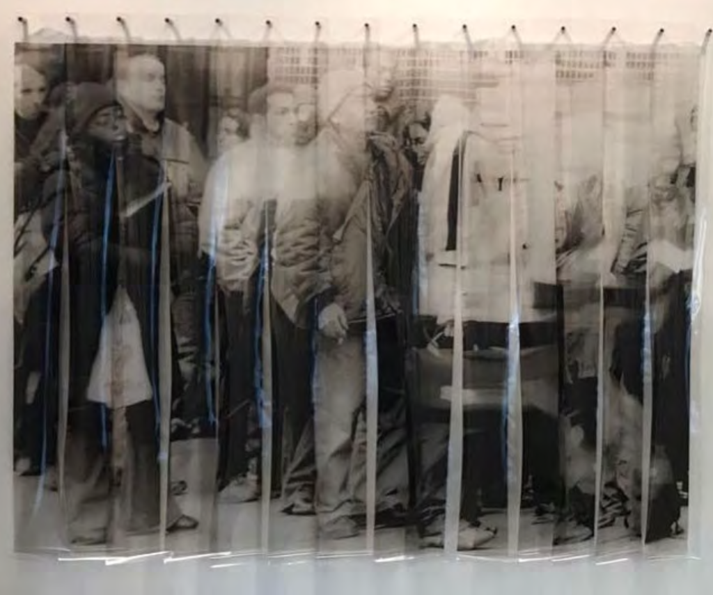 Sin embargo, la relación que Sacco establece con las imágenes es diferente, pues algunas de sus estrategias creativas, como apropiar imágenes de prensa o de dominio público y ponerlas nuevamente a circular sin hacer explícito el contexto original y los créditos de sus fuentes, generan preguntas sobre la vigencia de la noción de autoría en medio de una sociedad dominada por los medios de comunicación (Garavelli, 2002), de modo que el valor “documental” de la imagen de origen fotográfico (su especificidad contextual), que resultaba fundamental en el uso de fotografías para los antecedentes señalados atrás (Taller 4 Rojo y Tucumán Arde), es parcialmente desplazado. A diferencia de lo sucedido en el proceso de Tucumán Arde, Graciela Sacco no se interesa por componer un gran fondo documental de fuentes visuales que sirvan para registrar el transcurso de una situación particular; más bien, su uso de imágenes con origen fotográfico se limita a un pequeño conjunto de motivos reiterados en distintos formatos y materiales para componer diversas piezas, articuladas por la transferencia fotográfica de estas imágenes a otras superficies y dispuestas en salas o espacios públicos, donde, ante todo, procuran confrontar la experiencia del espectador.