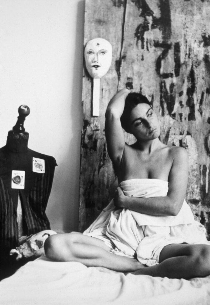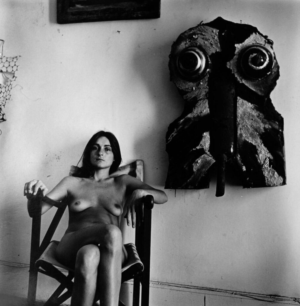 En la extensa serie tomada por Marcos López en 1983, donde se ve a la artista interactuando con sus objetos realizados con elementos reciclados, resulta evidente la idea de cargarlos con la impronta sensual y provocativa de su cuerpo desnudo, recorriendo una amplia gama de sugerencias emocionales desde el desenfado erótico, la actitud devota, la tensión, la fragilidad o la amenaza. Es como si Maresca hubiera querido llevar aquellas obras más allá de sus límites materiales, impulsándolas hacia nuevos significados al comprometerlas con una sintaxis de aristas teatrales que las activaran y las sustrajeran de la inercia de su condición inanimada. Su mirada había hecho que esos elementos descartados por la lógica del consumo, cobraran aspectos inéditos gracias a una gramática bien aprendida en el taller de creatividad de Emilio Renart (3). Con estas acciones destinadas a ser fotografiadas, su decisiva presencia traspasó la percepción meramente contemplativa a la que estas piezas podían aspirar, para protagonizar en virtud de un gesto, una actitud o una pose, narraciones abiertas sujetas al libre juego interpretativo, que en íntima y lúdica relación con su creadora, procuró a estas piezas nuevas capas de sentido. En un híbrido experimental, Maresca pergeñó su propio teatro de objetos (4) interpretado para la cámara.