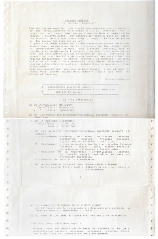 La obra El Dorado – Ecuación, fue una instalación performática, realizada en 1991 por Liliana Maresca en el Centro Cultural Recoleta. Basada en el famoso mito que remonta al año 1534 por el que se refiere a las regiones auríferas y diamantíferas de América a las que se creía proveedoras de inagotables riquezas. La instalación constaba de una pirámide truncada de color rojo –lingote de sangre, en vez de oro– que simbolizaba las consecuencias de la búsqueda de El Dorado. La cima estaba coronada por dos cuerpos geométricos antagónicos: una esfera y un cubo dorados, cuyas formas remitían a los procesos alquímicos. Esta construcción conectaba, por medio de un camino pintado en el piso, con un sillón colonial a modo de trono, que aludía al poder europeo. Dispuesta sobre un escritorio, una computadora con impresora, aportaba datos estadísticos que permitían componer una ecuación para calcular los kilos de oro expoliados en relación a los litros de sangre aborigen derramada. El informe contenía la cantidad de etnias existentes a la llegada de los españoles y el número de muertos en la explotación de las minas.