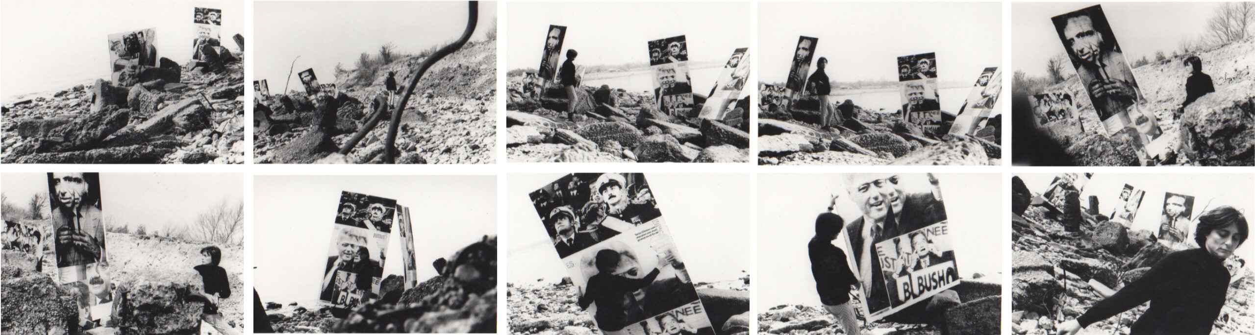La última serie es una derivación de la obra Imagen pública – Altas esferas. Con los paneles que la constituían la artista armó una nueva instalación en el extremo este de la Reserva Ecológica que se encuentra en la Costanera Sur de Buenos Aires. El video realizado por Adriana Miranda y sus fotografías, así como otros registros tomados en esa ocasión, muestran a Maresca acomodando, recorriendo y contemplando, taciturna, el resultado de su trabajo, la modificación de un paisaje en sí melancólico. Hay algo en este lugar de ruinoso. Son terrenos ganados al Río de la Plata por medio de rellenos realizados con materiales de demolición. Los paneles se sostenían entre los erosionados escombros por el agua y el viento, indicio del inexorable paso del tiempo. El río, tumba de muchos desaparecidos durante la último régimen militar, completa un panorama en el que no dejan de tener impacto las imágenes de los dictadores Videla y Massera, o de los presidentes Alfonsín y Menem, entre los demás personajes del acontecer nacional e internacional que pueden identificarse. El cuerpo de la artista actúa en este escenario como la condensación de una historia vivida que mueve a la reflexión social y existencial. La atmósfera brumosa que empalidece la visión de las imágenes parece confirmarlo.
