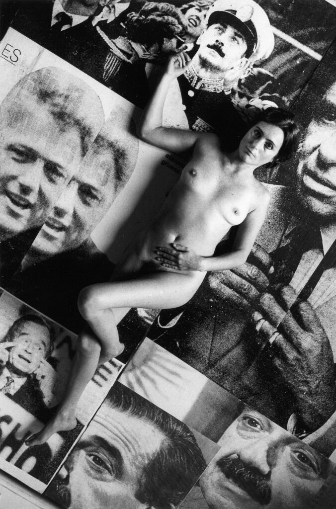 Retratada por Marcos López, Maresca posó desnuda sobre el collage de estas imágenes, condensando en su propio cuerpo la vulnerabilidad social embestida por la violencia y la corrupción, en un comprometido acto político.