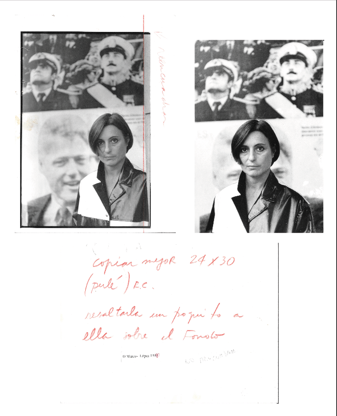 Prevalecen los rostros siniestros del escenario político, famosos por sus actos de terrorismo, traición, crímenes de lesa humanidad y desidia. Retratada por Marcos López, Maresca posó desnuda sobre el collage de estas imágenes, condensando en su propio cuerpo la vulnerabilidad social embestida por la violencia y la corrupción, en un comprometido acto político.