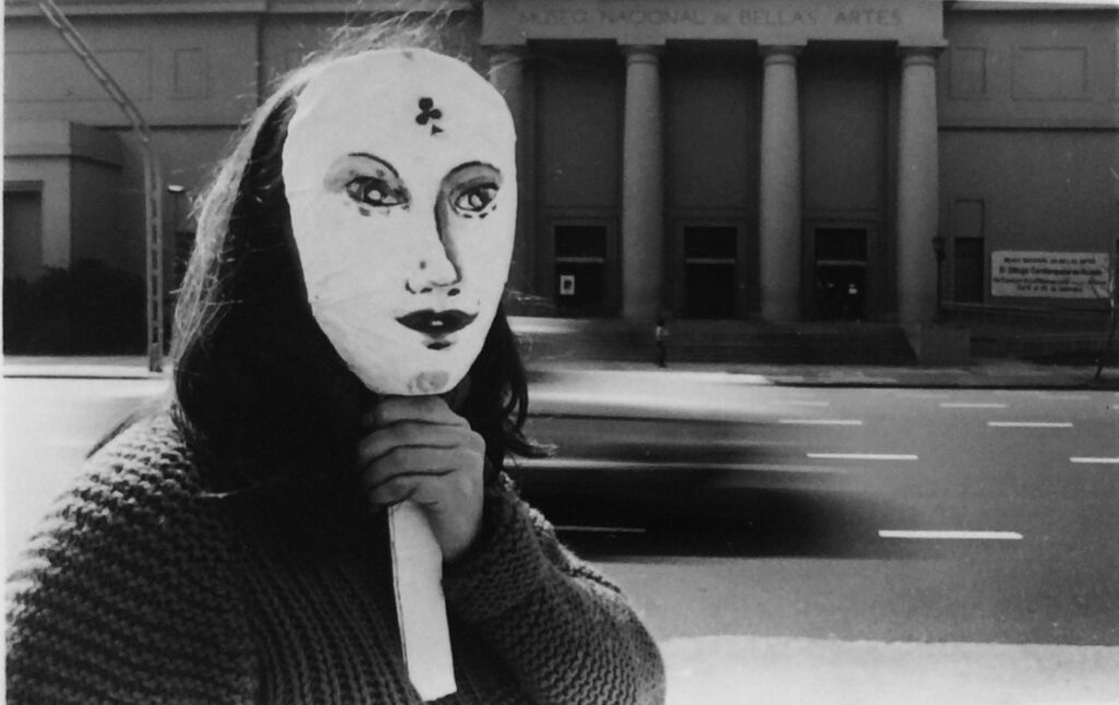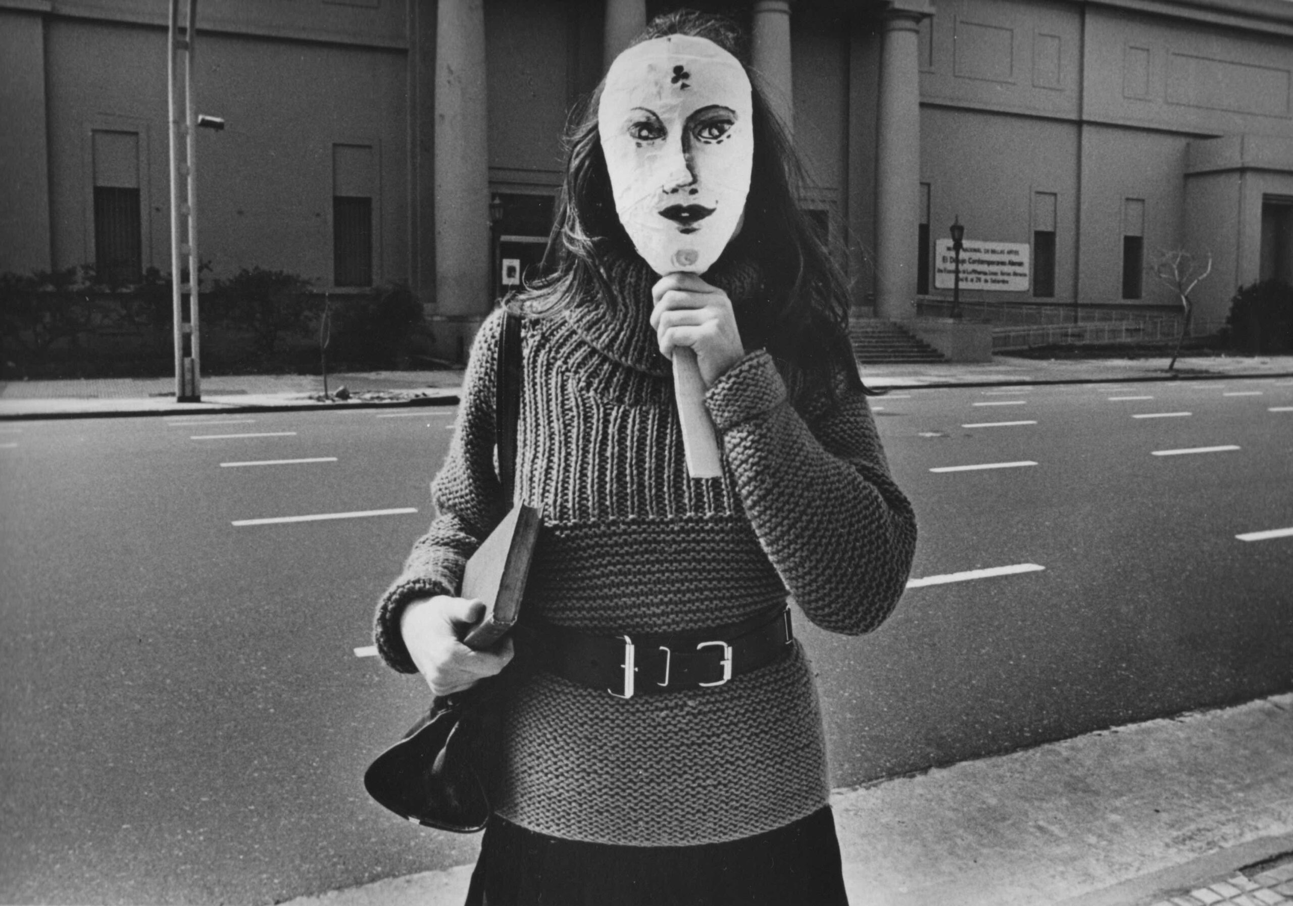 La actitud de tomarla por su soporte para ocultar el rostro evoca un antiguo baile de disfraces, una danza social que la artista estuvo dispuesta a poner en evidencia extrayéndola de su circunstancia común, con un gesto simple pero contundente. La crítica a las actitudes pretensiosas y falsas que el argot denomina como “caretas” –una expresión frecuente en Maresca y su entorno– se patentiza en esta serie y se vuelve monstruosa cuando se sirve de la máscara transparente que deforma su cara. En esta ocasión, en vez de ocultar el rostro recurrió a ella para revelar facetas disimuladas por la apariencia corriente. El lugar elegido, la fachada de la institución artística más importante del país, se puede leer como una declaración de principios acerca de cuáles pueden ser los requerimientos y prejuicios que condicionan el acceso, particularmente de los creadores jóvenes, a tales instancias consagratorias. De un modo más amplio, esta consideración puede extenderse a la seriedad impostada que casi por inercia imponen estos organismos a los sectores más populares de la sociedad, retaceándoles el sentido de pertenencia.