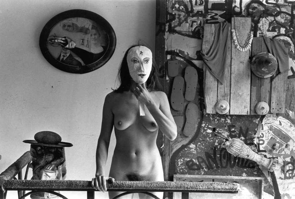 En la extensa serie tomada por Marcos López en 1983, donde se ve a la artista interactuando con sus objetos realizados con elementos reciclados, resulta evidente la idea de cargarlos con la impronta sensual y provocativa de su cuerpo desnudo, recorriendo una amplia gama de sugerencias emocionales desde el desenfado erótico, la actitud devota, la tensión, la fragilidad o la amenaza. Es como si Maresca hubiera querido llevar aquellas obras más allá de sus límites materiales, impulsándolas hacia nuevos significados al comprometerlas con una sintaxis de aristas teatrales que las activaran y las sustrajeran de la inercia de su condición inanimada. Su mirada había hecho que esos elementos descartados por la lógica del consumo, cobraran aspectos inéditos gracias a una gramática bien aprendida en el taller de creatividad de Emilio Renart (3). Con estas acciones destinadas a ser fotografiadas, su decisiva presencia traspasó la percepción meramente contemplativa a la que estas piezas podían aspirar, para protagonizar en virtud de un gesto, una actitud o una pose, narraciones abiertas sujetas al libre juego interpretativo, que en íntima y lúdica relación con su creadora, procuró a estas piezas nuevas capas de sentido. En un híbrido experimental, Maresca pergeñó su propio teatro de objetos (4) interpretado para la cámara.