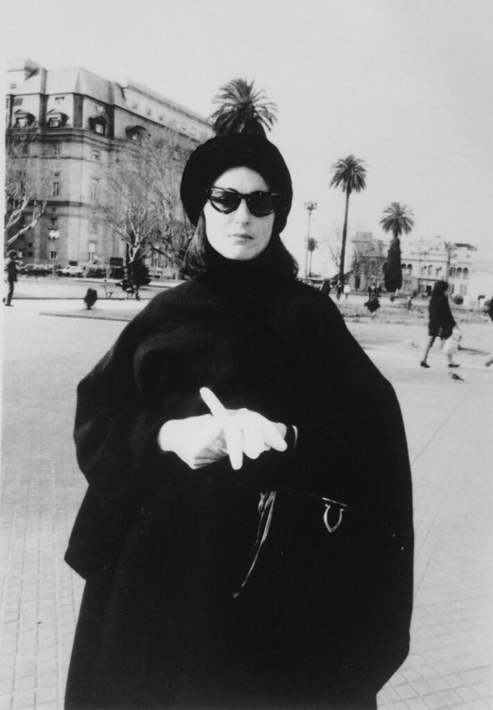 En ese mismo año pasó de la crítica cultural a la política, cuando organizó el ciclo frente a la Casa Rosada, sede del Gobierno Nacional argentino. Para esta ocasión Maresca seleccionó un vestuario más severo: capa, sombrero y lentes oscuros le otorgaron una circunspección, que los guantes y la cartera demodé reafirmaban. En las imágenes, la compostura corporal y el ceño adusto la muestran como una señora respetable, incapaz de despertar sospecha alguna al hacerse fotografiar cerca de la custodia del soldado del cuerpo de Granaderos. Al trasvestirse en un personaje que estaba en las antípodas de su personalidad, juego que le gustaba implementar por el placer de “ser otra”, Maresca desafió límites que aquí tienen que ver con apropiarse de la participación política recién reconquistada. Recordemos que a fines de 1983 asumió el primer presidente elegido democráticamente después de siete años de cruenta dictadura militar. Sin embargo, la artista tomó riesgos no solo estéticos: el poder del ejército aún gravitaba como lo probaron las diversas rebeliones de facciones denominadas “carapintadas” que el mandato de Raúl Alfonsín tuvo que soportar. Quizás la composición de este personaje formal fuera resultado, aún en medio de la euforia desatada por la “primavera democrática”, del discernimiento de esta realidad.