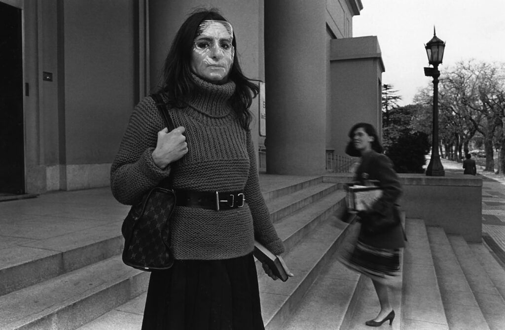 La actitud de tomarla por su soporte para ocultar el rostro evoca un antiguo baile de disfraces, una danza social que la artista estuvo dispuesta a poner en evidencia extrayéndola de su circunstancia común, con un gesto simple pero contundente. La crítica a las actitudes pretensiosas y falsas que el argot denomina como “caretas” –una expresión frecuente en Maresca y su entorno– se patentiza en esta serie y se vuelve monstruosa cuando se sirve de la máscara transparente que deforma su cara. En esta ocasión, en vez de ocultar el rostro recurrió a ella para revelar facetas disimuladas por la apariencia corriente. El lugar elegido, la fachada de la institución artística más importante del país, se puede leer como una declaración de principios acerca de cuáles pueden ser los requerimientos y prejuicios que condicionan el acceso, particularmente de los creadores jóvenes, a tales instancias consagratorias. De un modo más amplio, esta consideración puede extenderse a la seriedad impostada que casi por inercia imponen estos organismos a los sectores más populares de la sociedad, retaceándoles el sentido de pertenencia.