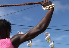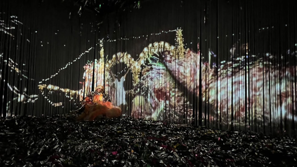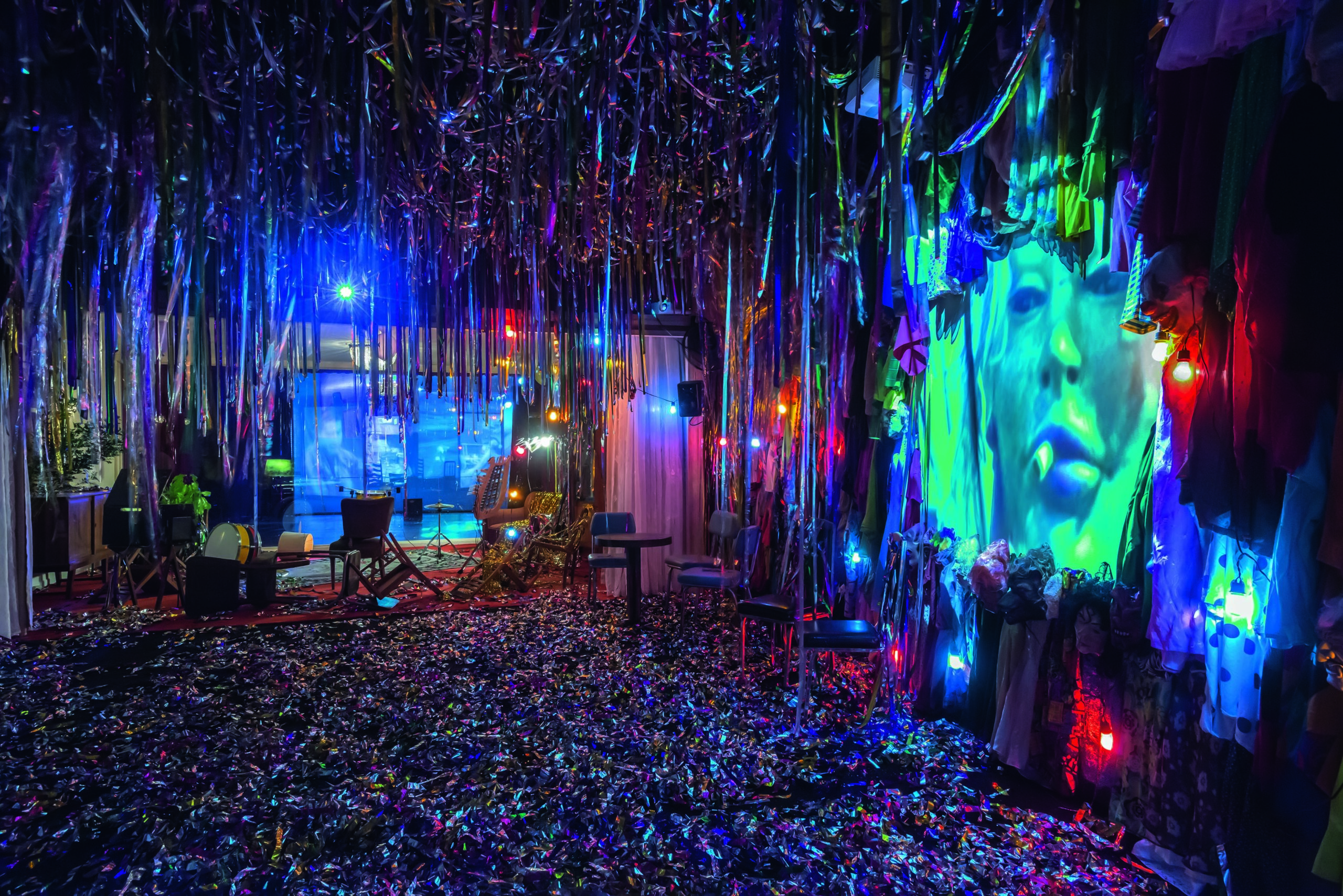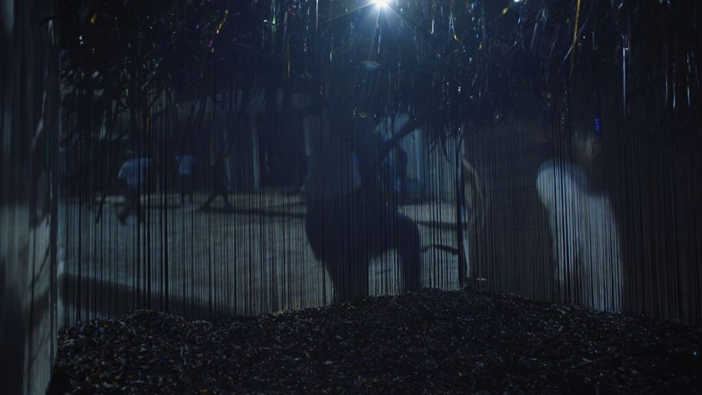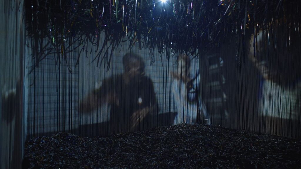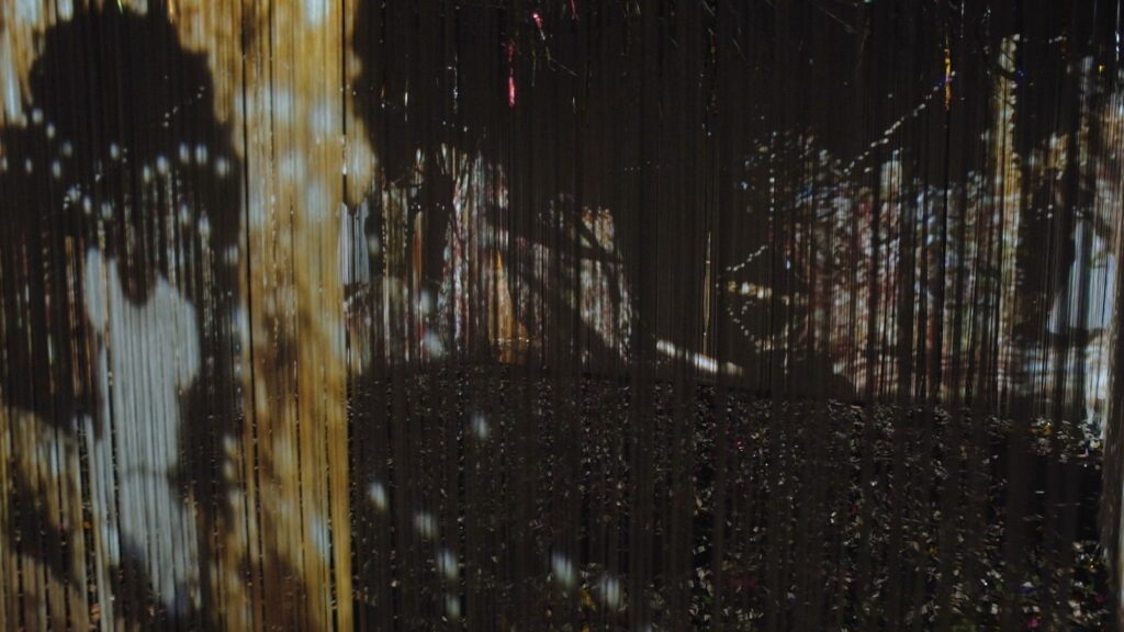 Se trata de un montaje fílmico que despliega en el espacio las imágenes y sonidos de esta singular fiesta, produciendo un efecto inmersivo sobre los cuerpos que lo atraviesan. Al interior del cubo, miles de serpentinas brillantes cuelgan del techo formando un denso volúmen que se mueve gracias al vaivén de varios ventiladores. El movimiento de las imágenes proyectadas y de las serpentinas que cuelgan y se mueven en el techo y piso detonan una danza frenética que proyecta su sombra tras las finas cortinas de hilo sobre la pared interna del contenedor por donde ingresan y transitan lxs visitantes.