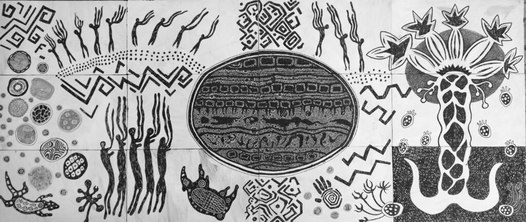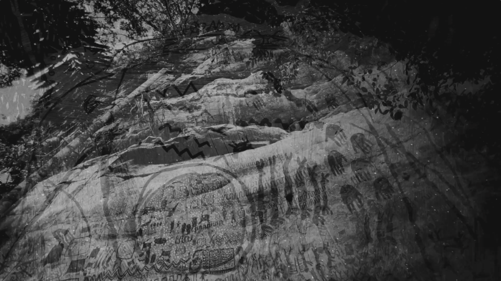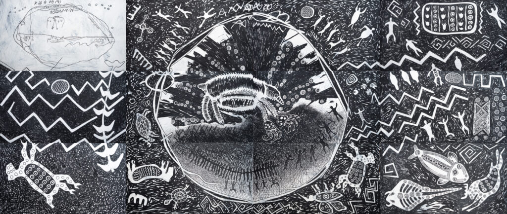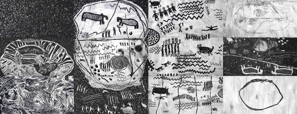 Realizados durante los laboratorios de la imaginación social de La vorágine más allá con la comunidad experimental Nukak, estos grabados son el resultado de varios encuentros entorno al mito de Macharoko, mito de fundación del pueblo Nukak, que inician con la visita a los pictogramas de la Serranía de la Lindosa. Impresos sobre inmensas paredes de roca que datan de más de diez mil años, los pictogramas constituyen una suerte de archivo vivo sagrado de los pueblos indígenas del Amazonas colombiano.