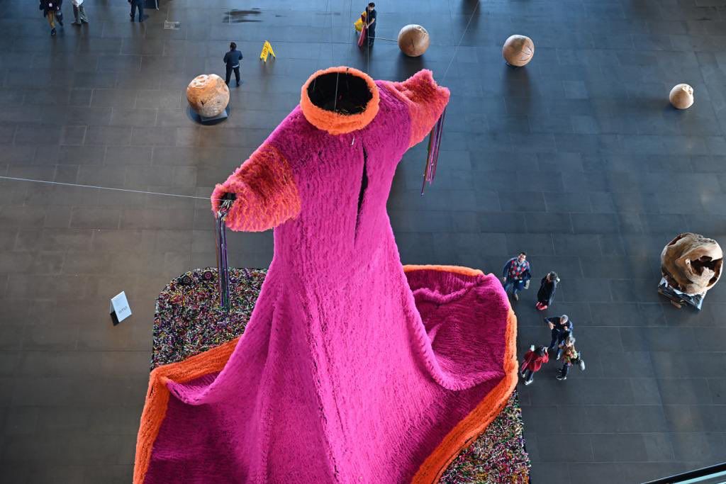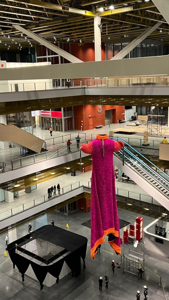 Vestido bordado en tul sobre seda con estructura metálica, ventiladores y serpentinas