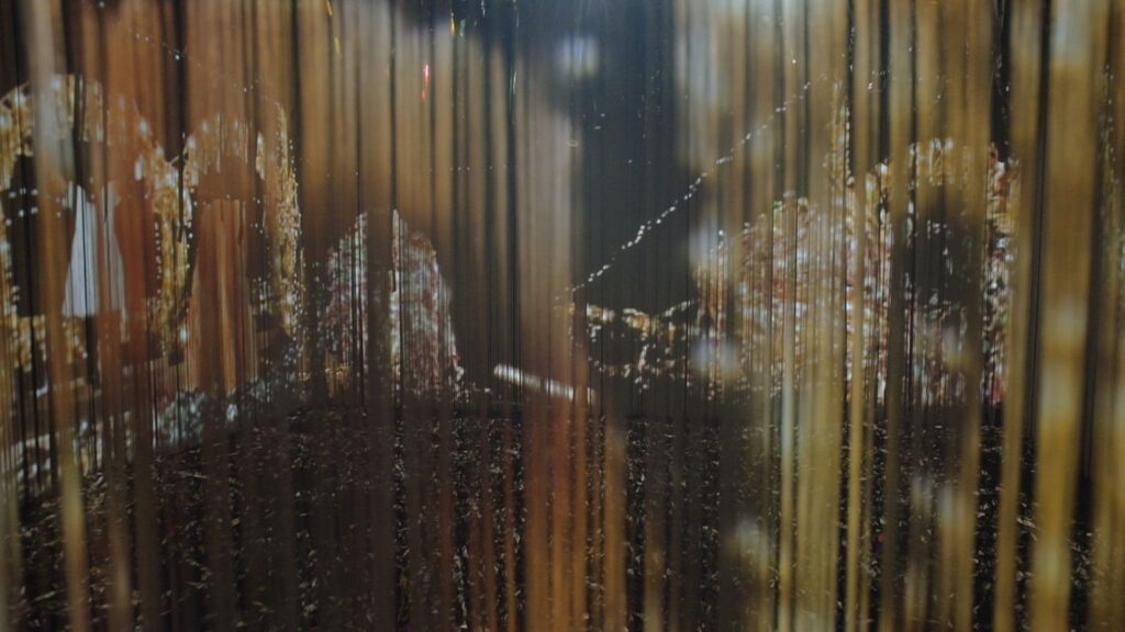 La instalación consiste en un contenedor escultórico donde cuelgan del interior del techo cuatro cortinas de hilos que conforman un espacio cúbico al que se puede ingresar atravesando esta materia translúcida. Sobre las cuatro cortinas son proyectadas cuatro secuencias de Los Santos Inocentes, montaje a partir del registro audio-visual realizado por Mapa Teatro-Laboratorio de artistas durante la celebración del mismo nombre en un municipio del Pacífico colombiano.