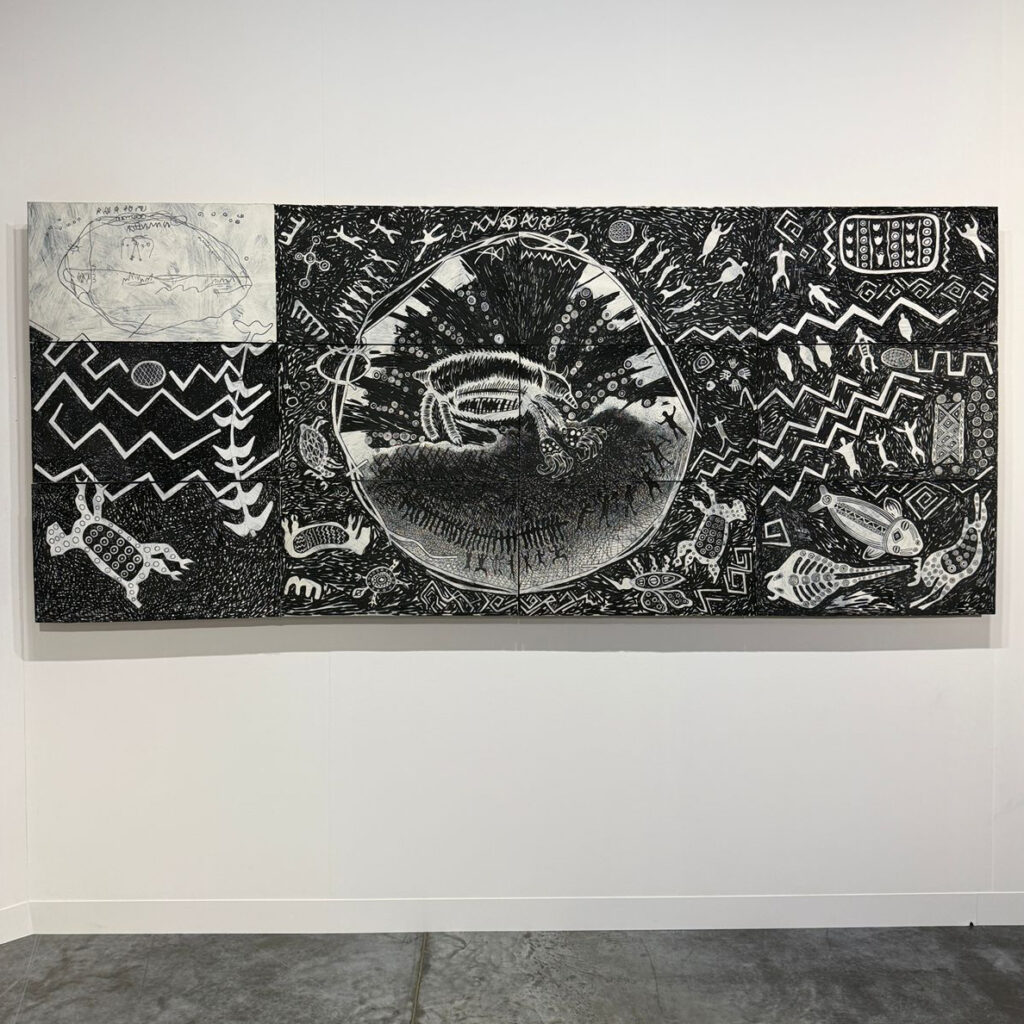 Realizados durante los laboratorios de la imaginación social de La vorágine más allá con la comunidad experimental Nukak, estos grabados son el resultado de varios encuentros entorno al mito de Macharoko, mito de fundación del pueblo Nukak, que inician con la visita a los pictogramas de la Serranía de la Lindosa. Impresos sobre inmensas paredes de roca que datan de más de diez mil años, los pictogramas constituyen una suerte de archivo vivo sagrado de los pueblos indígenas del Amazonas colombiano.