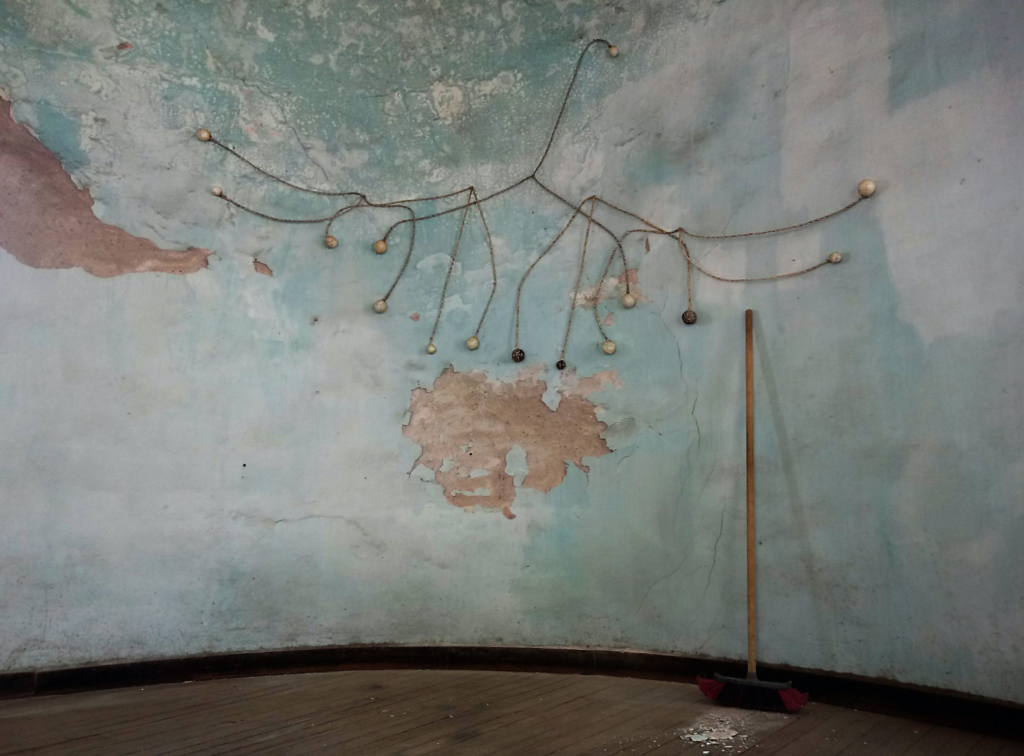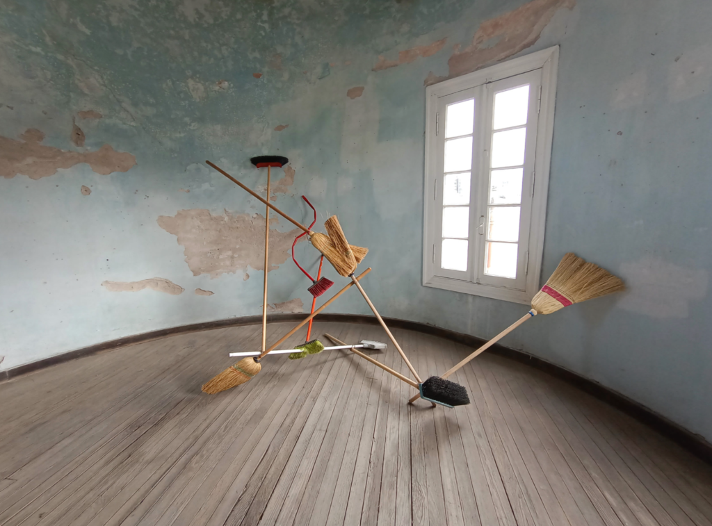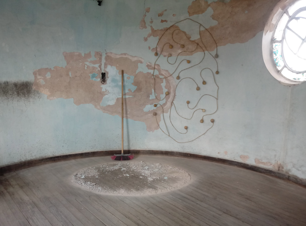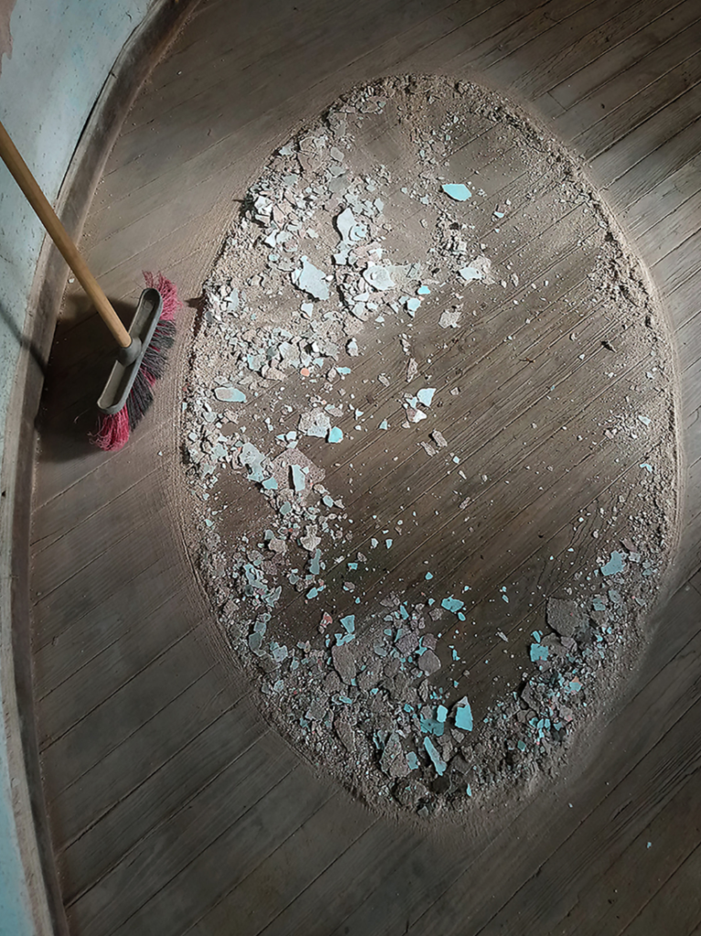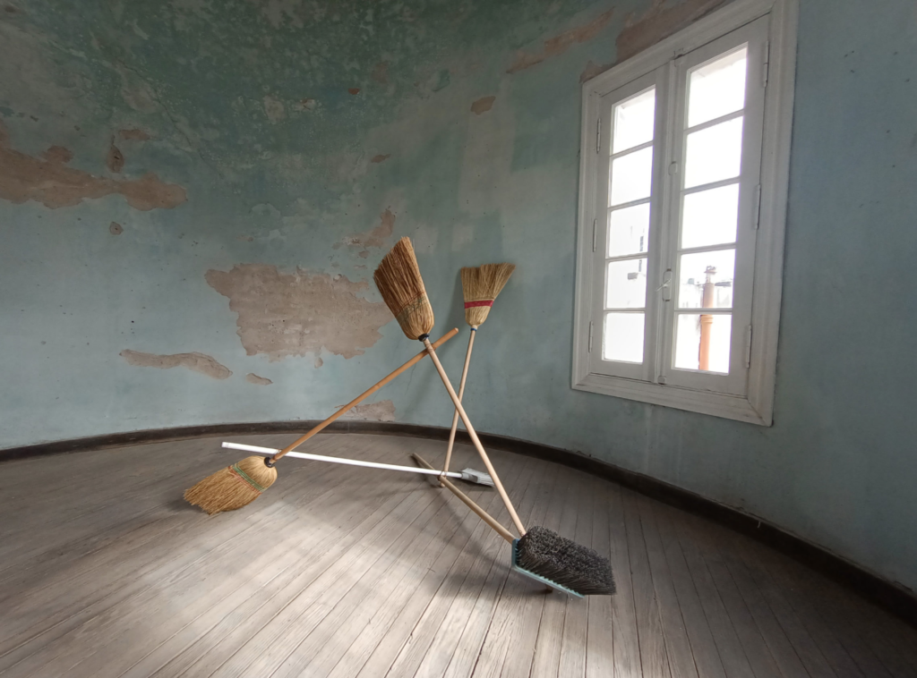 A mediados del 2020, en medio de la pandemia del COVID-19, Verónica Meloni transformó el encierro en laboratorio. En una vieja cúpula en el edificio donde renta su vivienda en Córdoba, Argentina —un habitáculo abandonado donde la conserje guardaba sus instrumentos de limpieza— Meloni volcó su energía de artista del performance e intervención social, en una hechicería y psicología de las cosas. En esa su “cueva de la impermanencia” (como la artista la designó) Meloni montó comedias con el caliche, el polvo y las escobas, evocaciones de La creación de la Sixtina con guantes percudidos, homenajes a Kasimir Malévich con esteros y galaxias efímeras derivadas de acciones para el Instagram.