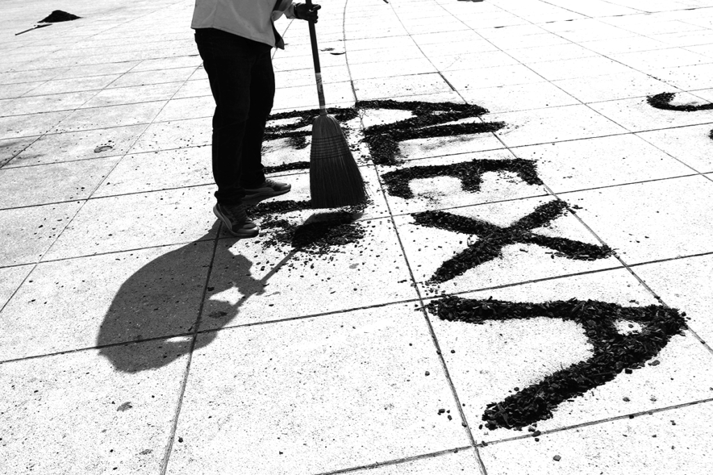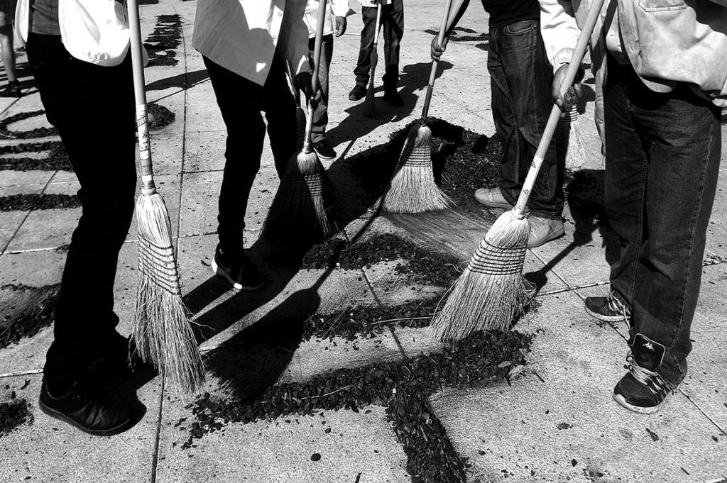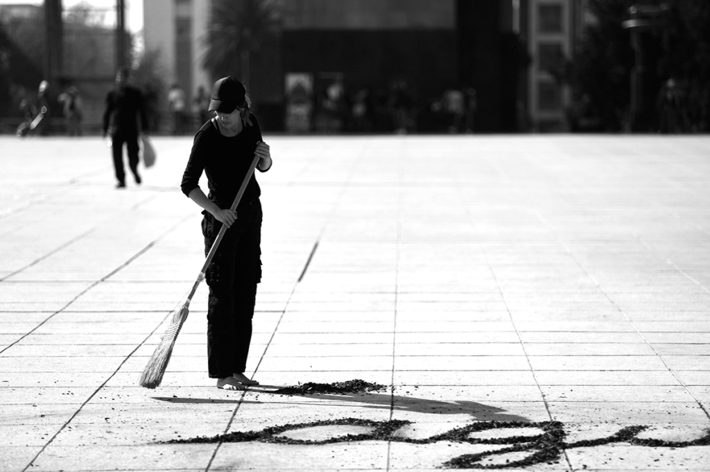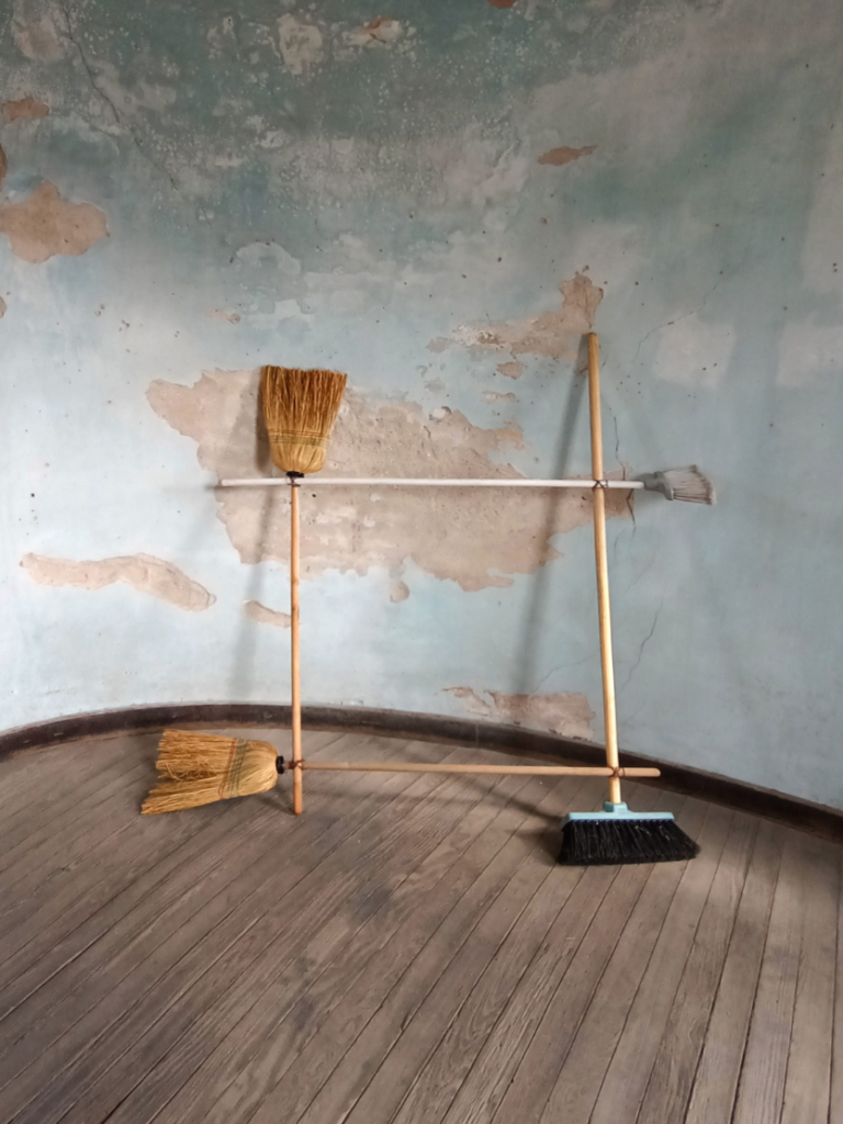Set de 4 fotografías y objeto (escoba utilizada en la performace)