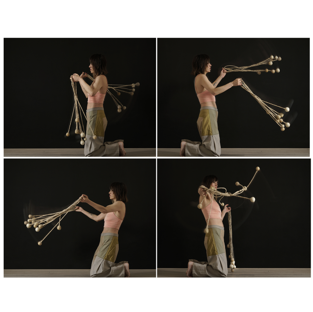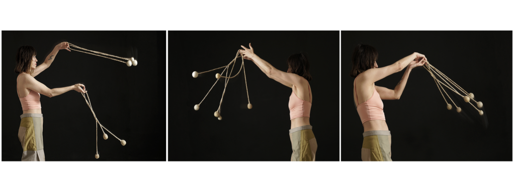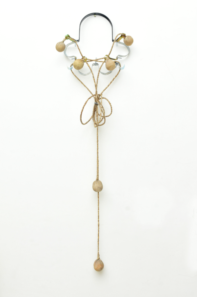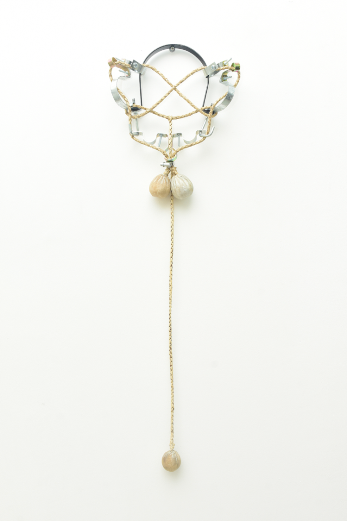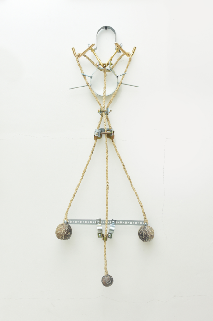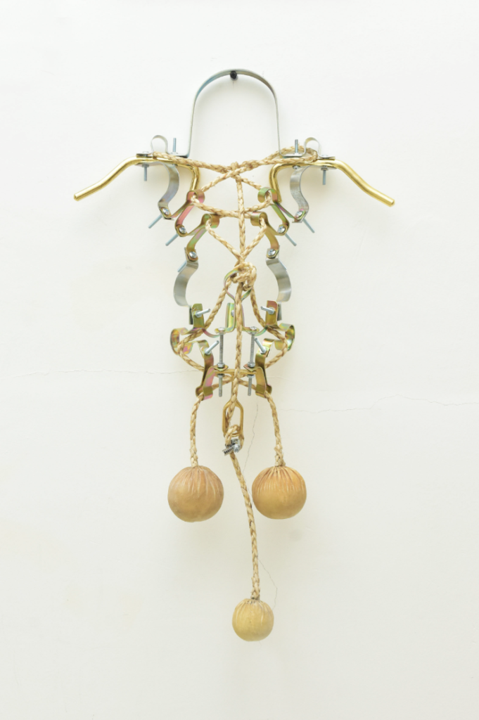 Estas esculturas son a la vez cuerpos y nudos en tensión. Formalizan a la vez el enredo de la boleadora al tropezar al animal del enemigo, tanto como la fuerza de control del jinete sobre su montura. Son, al mismo tiempo, objetos-cuerpo, dotados de simetría, y testigos de tortura. Péndulos lo mismo que caretas; prótesis y monstruos; maquinarias y fantasmas. Vástagos de un encierro que va más allá de la pandemia pues es continente e historia. Estos son nuestros nudos, y nuestro enredo, y una batalla eternizada.