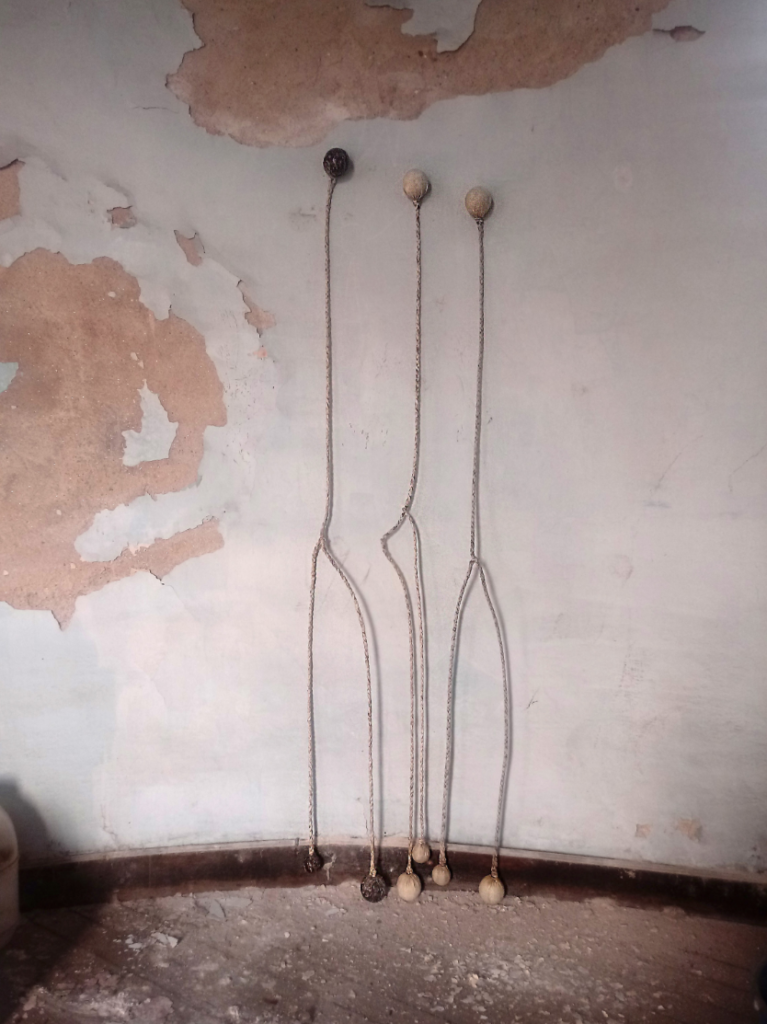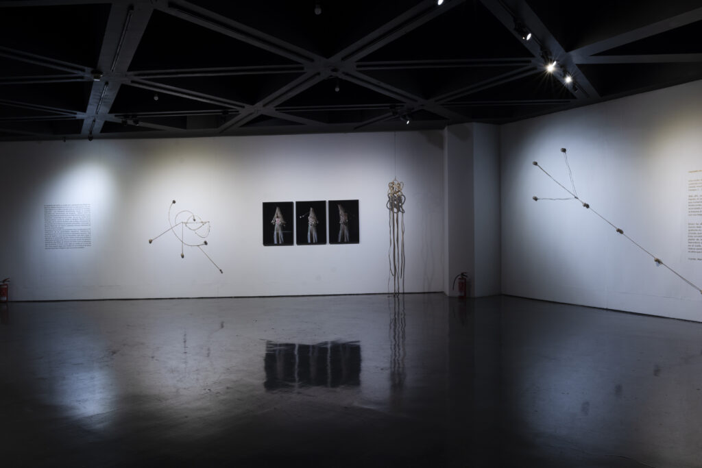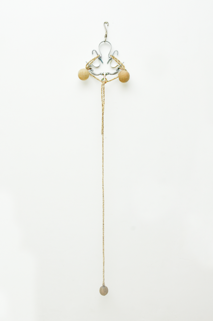 Estas esculturas son a la vez cuerpos y nudos en tensión. Formalizan a la vez el enredo de la boleadora al tropezar al animal del enemigo, tanto como la fuerza de control del jinete sobre su montura. Son, al mismo tiempo, objetos-cuerpo, dotados de simetría, y testigos de tortura. Péndulos lo mismo que caretas; prótesis y monstruos; maquinarias y fantasmas. Vástagos de un encierro que va más allá de la pandemia pues es continente e historia. Estos son nuestros nudos, y nuestro enredo, y una batalla eternizada.