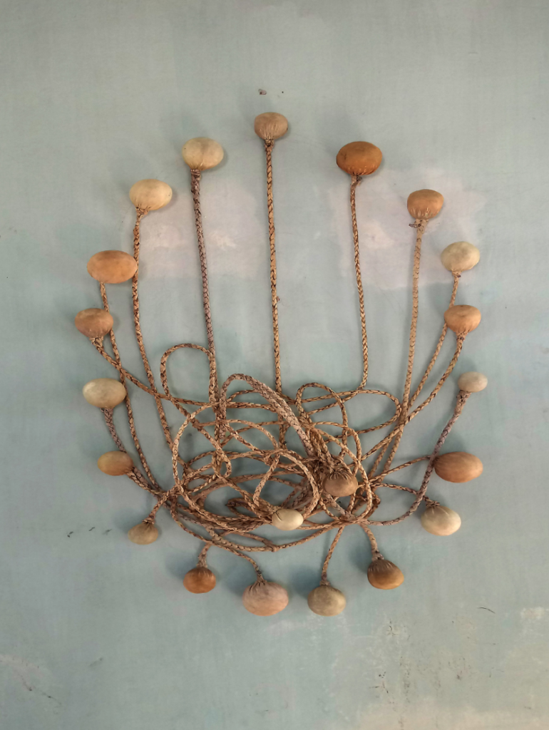Las obras que Verónica Meloni generó a partir del complejo boleadora-embocadura, dejaron de estar presididas por la figuración de la boleadora girando en el espacio, para interrogar el nudo de su violencia. En estos tejidos de utillaje, hay una ambición de crear una objetualidad americana: a la vez cargada de utopías decoloniales, que de pesadillas postcoloniales, y de aprendizajes transculturales. Por un lado, son una evocación de la resistencia anti-imperial de los pueblos australes contra los imperios que, en tiempos precolombinos y coloniales, identificaron la “causa de la civilización” con el “anatema de la desaparición” de los aborígenes5. A la vez, y sin que eso encarne contradicción, son una evocación de la violencia constitutiva de la experiencia cultural argentina. El par de boleadora y embocadura, aparecen como una especie de “contrapunteo” que caracteriza, como señaló Fernando Ortiz, el “trance doloroso de transculturación a un nuevo ambiente cultural”. Son el “instrumentario” que expresa el desajuste y conflicto entre etnias y culturas, mediante las cuales se fragua un nuevo mundo a partir de un “ambiente de terror y de fuerza”.