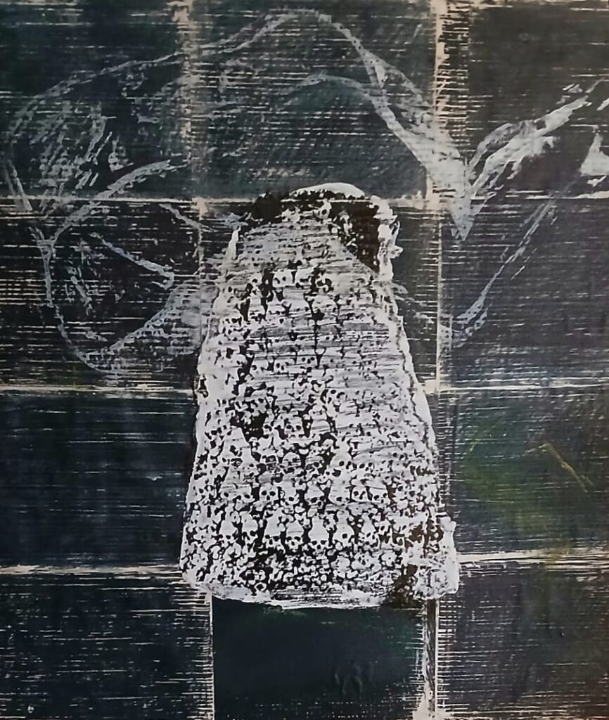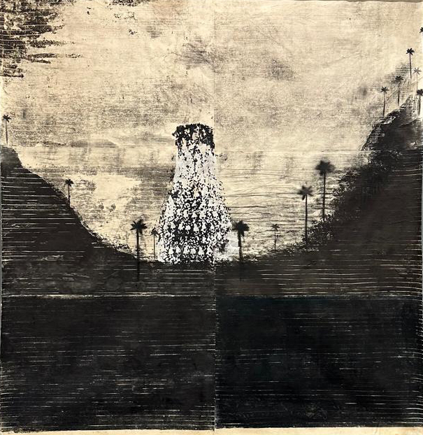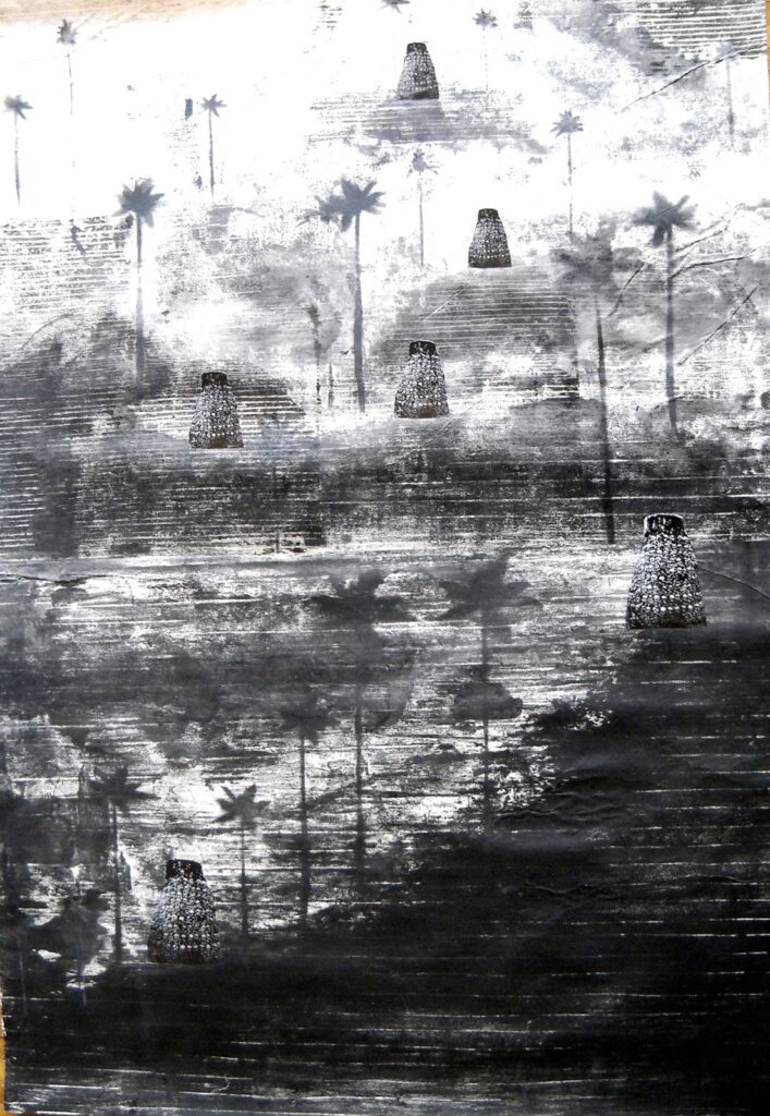 Restrepo se apropia de una imagen icónica de la guerra en Colombia: la fotografia de una pirámide de calaveras tomada durante la Guerra de los Mil Días (1899-1902). Restrepo la reproduce y reitera, y la vuelve parte de un paisaje lúgubre signado por la violencia: el paisaje escogido es el de Quindío (Colombia), un territorio antes retratado por científicos y viajeros europeos del XIX como Alexander von Humboldt y Albert Berg. La textura del paisaje invoca la estática de los televisores de los años 80, haciendo referencia a la mediatización exacerbada de la violencia: un televisor que lo único que enfoca son los montículos de cráneos esparcidos por el territorio que alternan su espacio con el árbol nacional, la palma de cera.