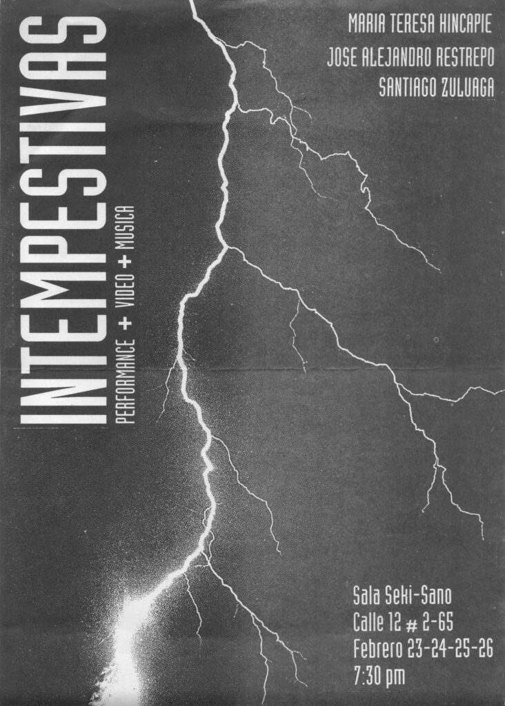 Intempestivas. Videoacción concebida por José Alejandro Restrepo para ser interpretada por María Teresa Hincapié con música de Santiago Zuluaga. Se trata de uno los primeros ejercicios experimentales de video y performance de larga duración en Colombia, guiada por conceptos de no representación, además de la noción de tiempo expandido como presencia completa, que guiará el trabajo posterior de ambos artistas.