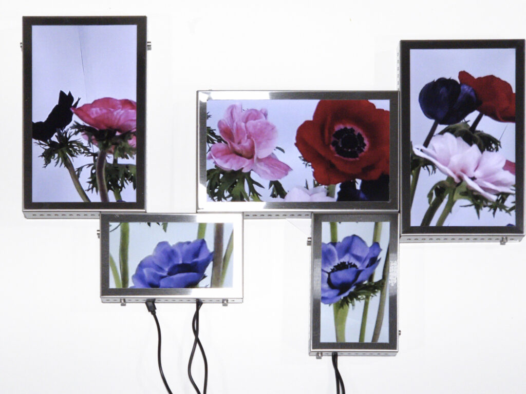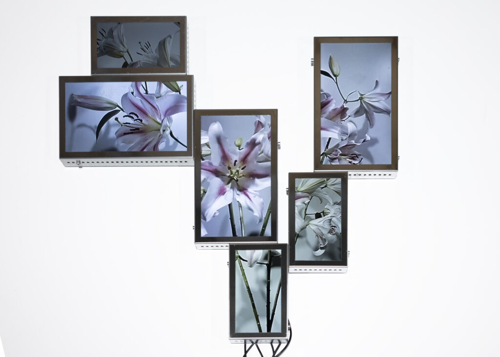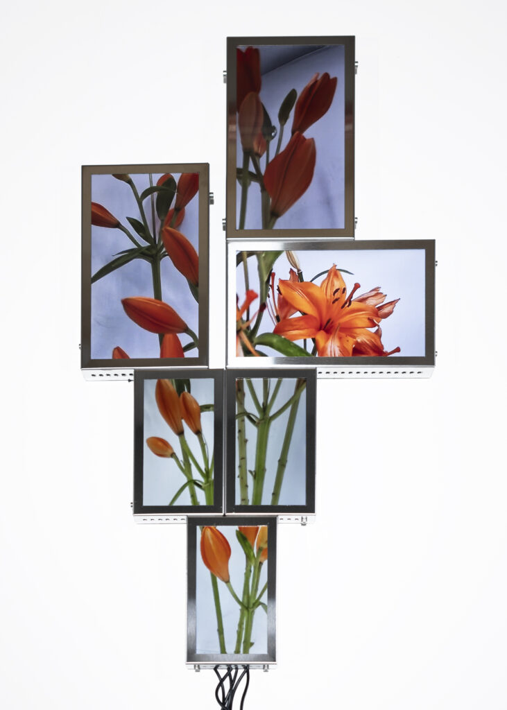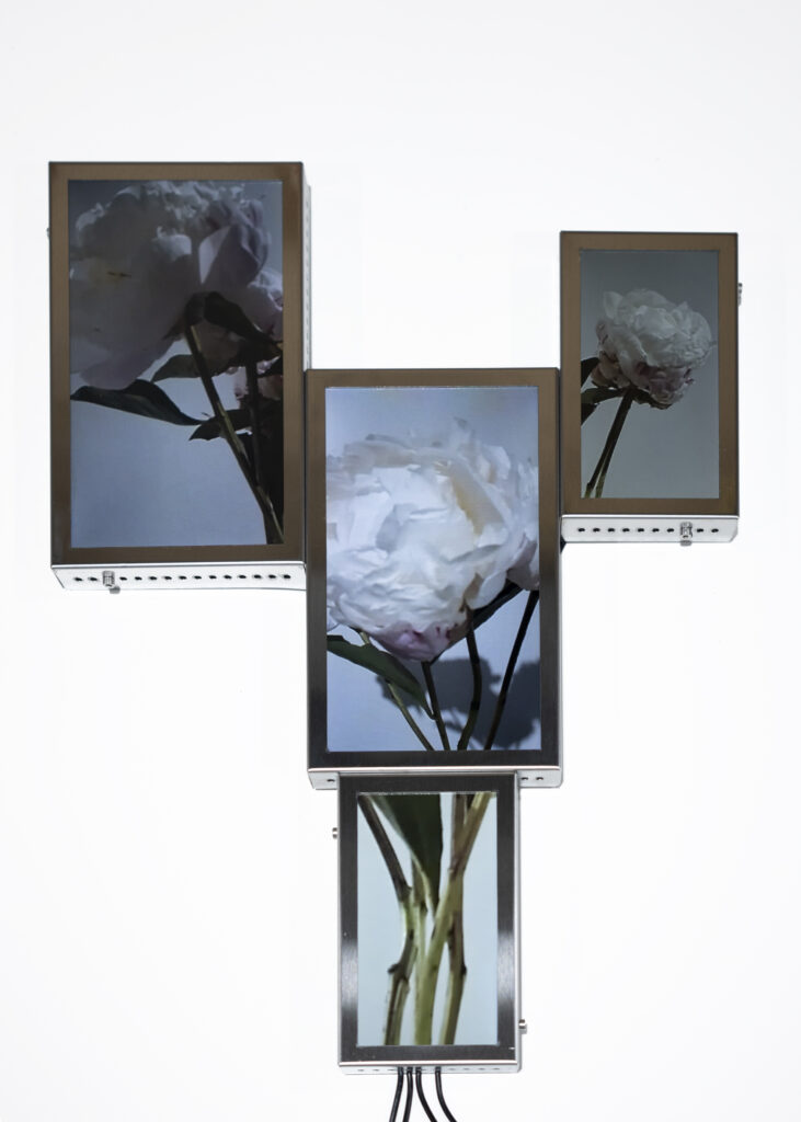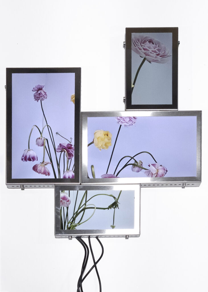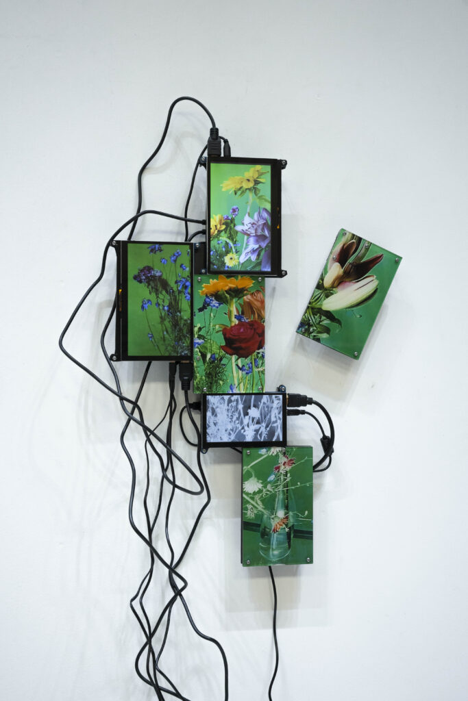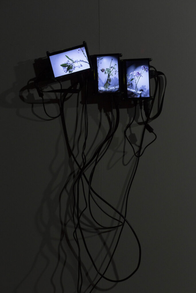 The Secret Life of Flowers consists of three interconnected elements. The first element is based on a closed camera system that continuously recorded the plant throughout her life cycle, now presented as flatscreens whose visible cabling forms a soft, almost organic extension of the flower. The second element is the living flower herself, observed in real time by cameras until her decline. The third element unfolds as a cyborg garden in which the mediated plants are recombined into a hybrid ecology of fragments that becomes more than the sum of its parts through their renewed relationality.