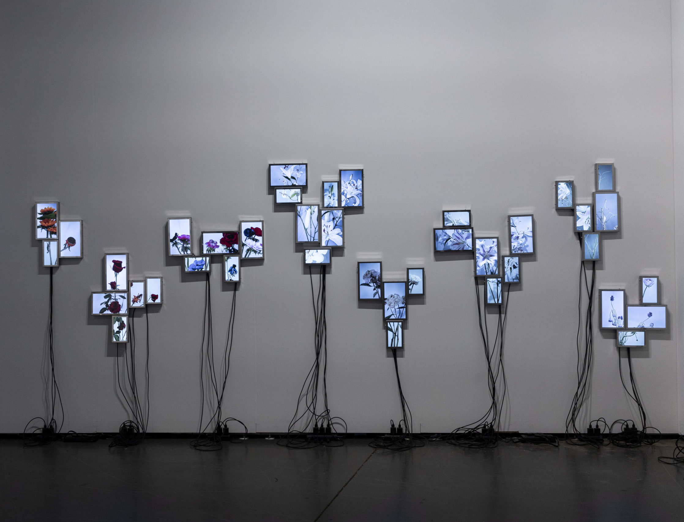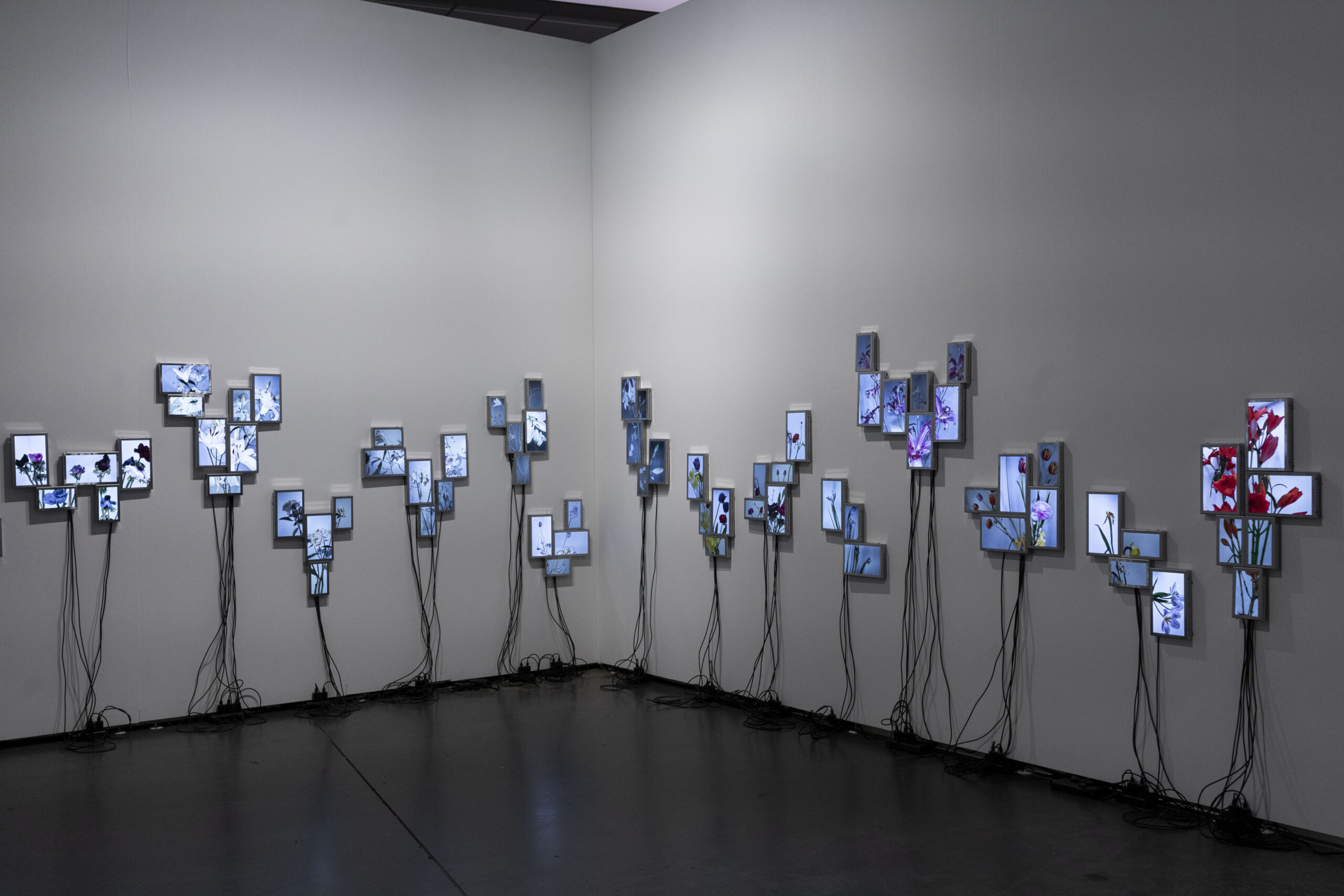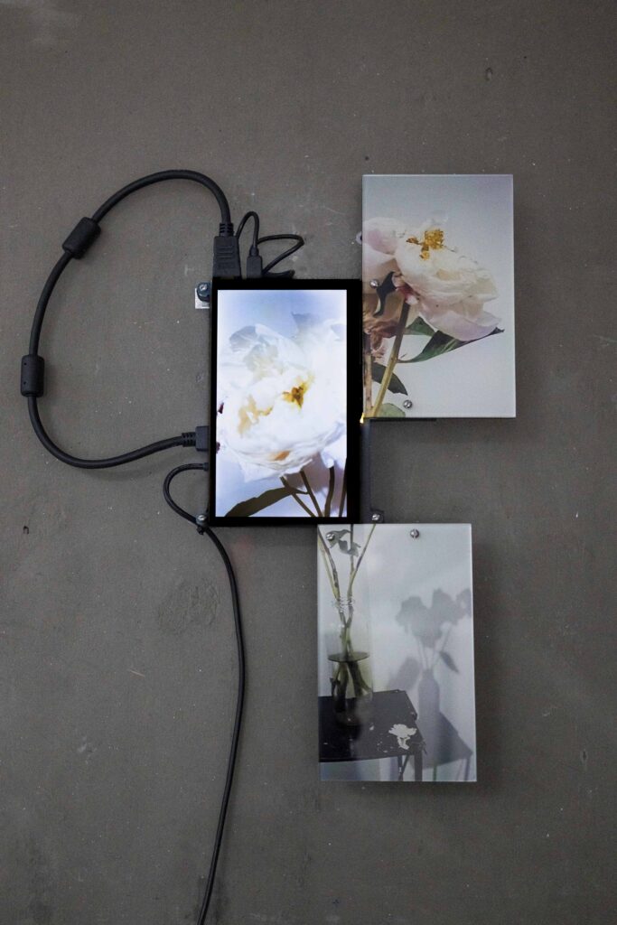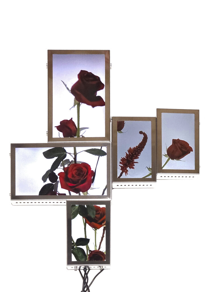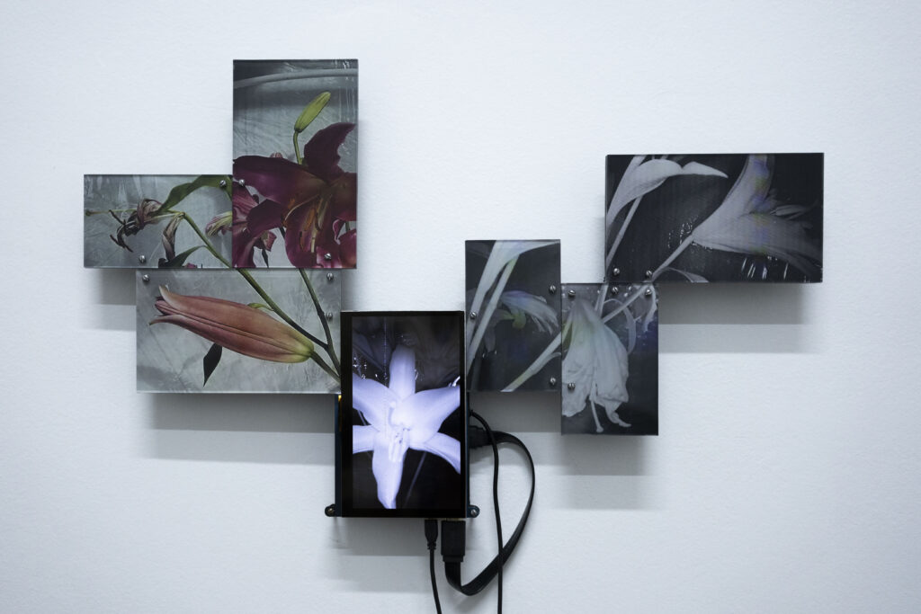 The Secret Life of Flowers consists of three interconnected elements. The first element is based on a closed camera system that continuously recorded the plant throughout her life cycle, now presented as flatscreens whose visible cabling forms a soft, almost organic extension of the flower. The second element is the living flower herself, observed in real time by cameras until her decline. The third element unfolds as a cyborg garden in which the mediated plants are recombined into a hybrid ecology of fragments that becomes more than the sum of its parts through their renewed relationality.