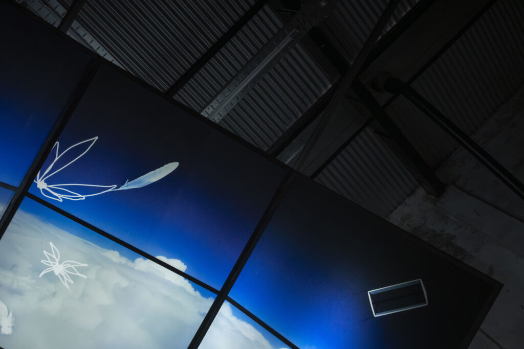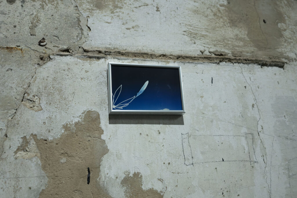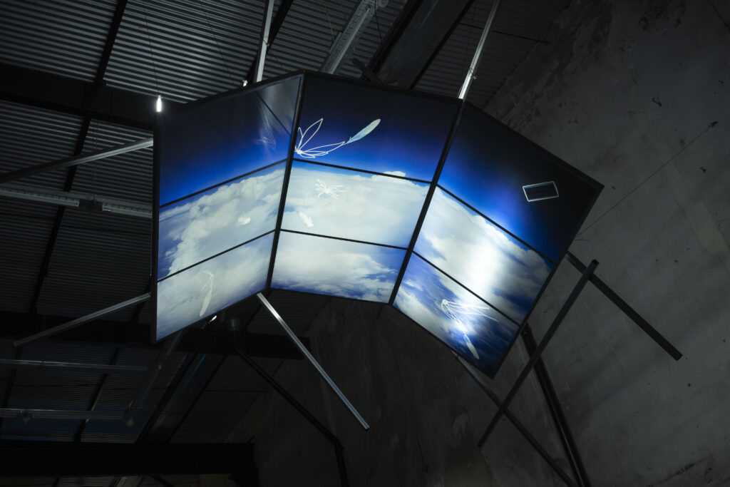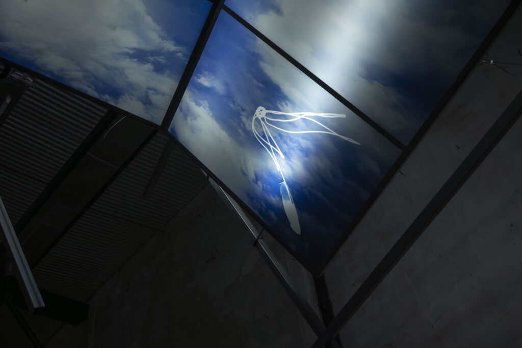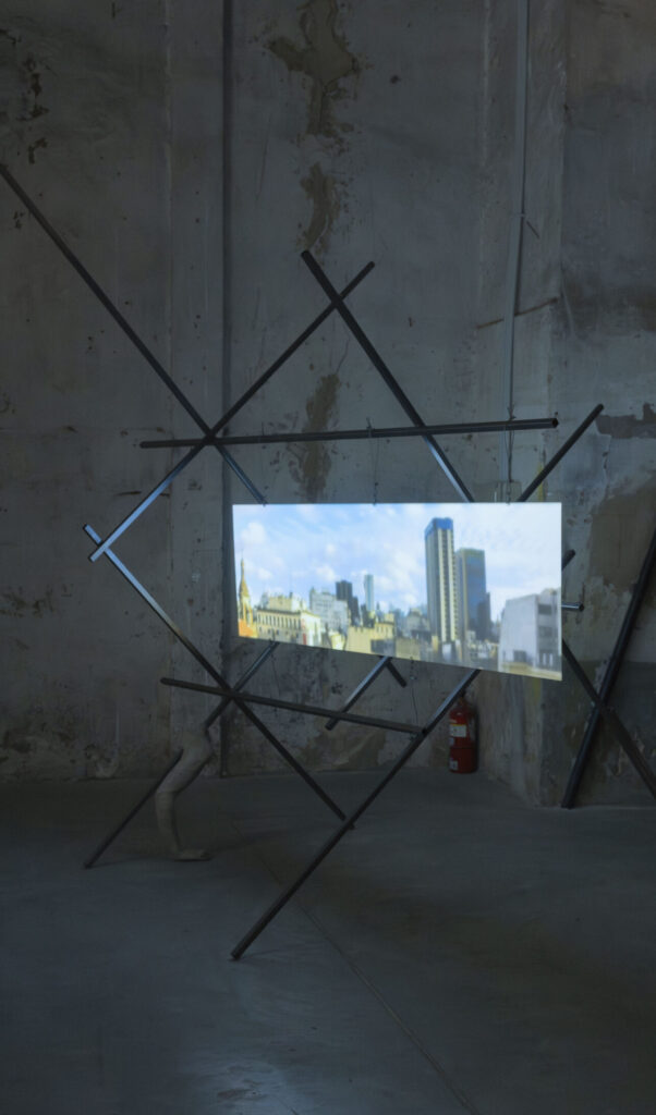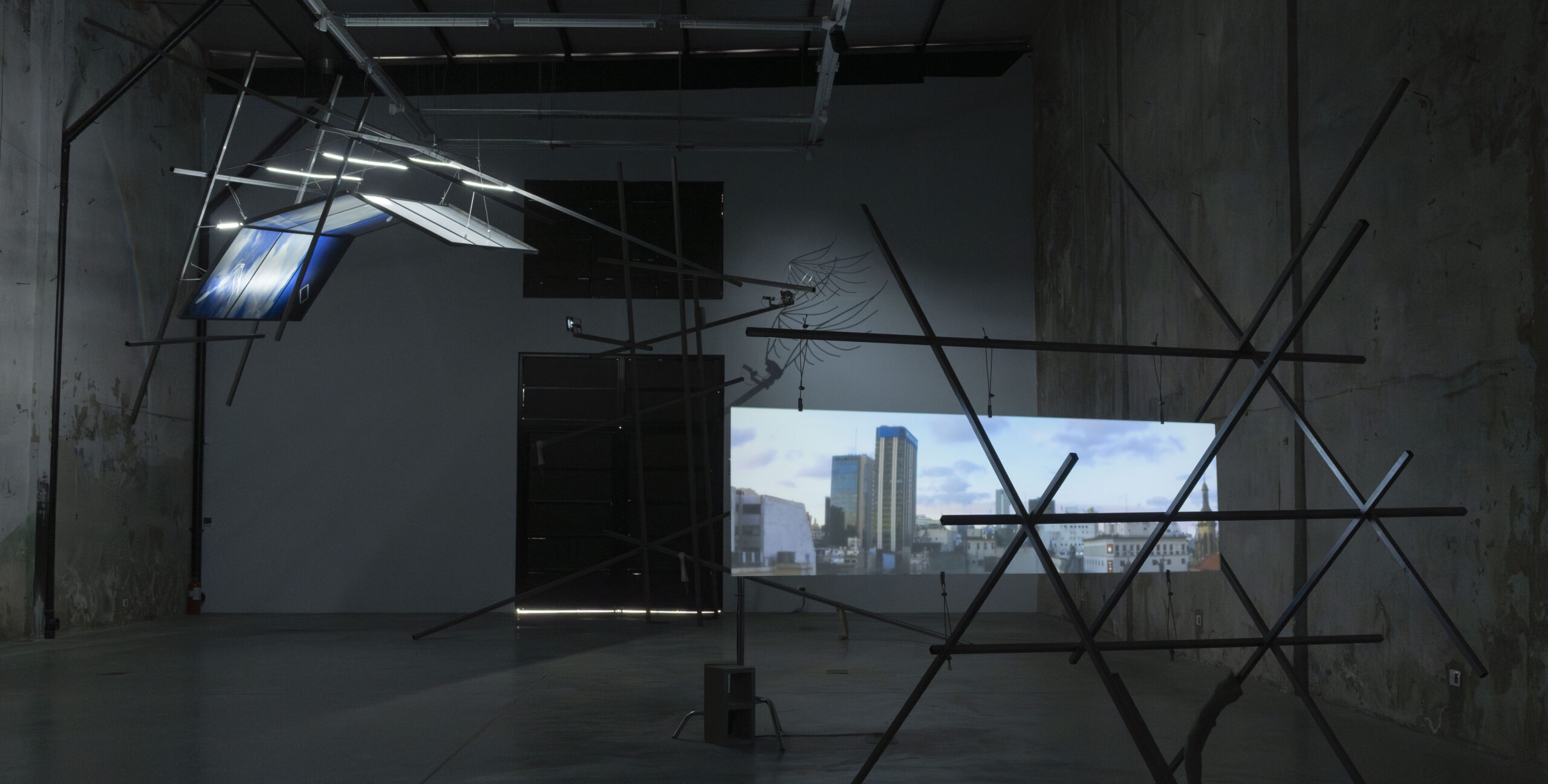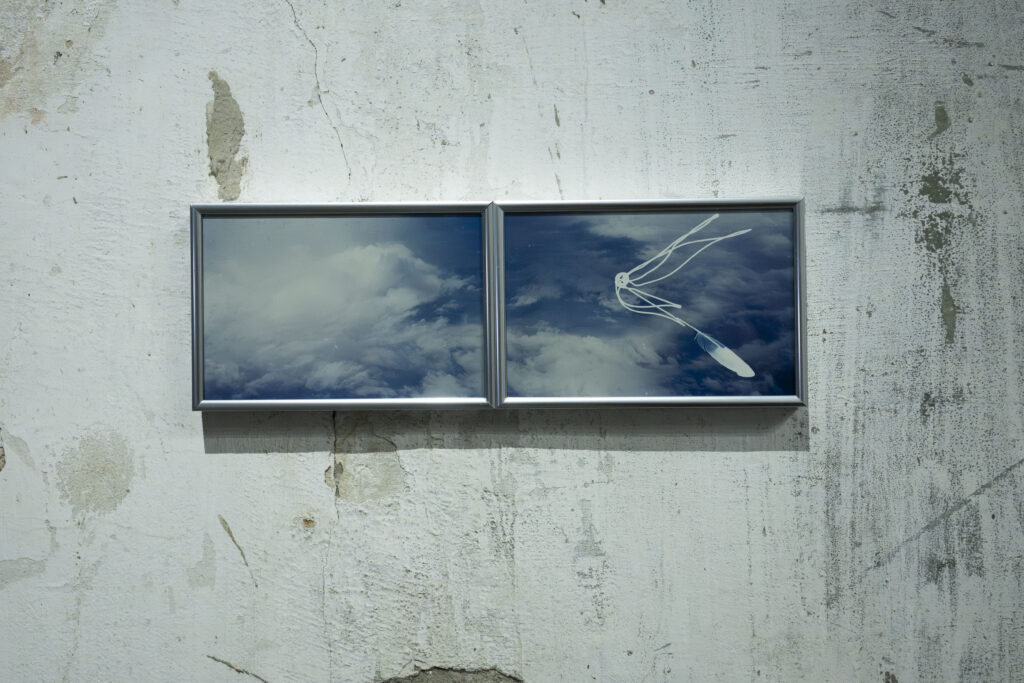 The exhibition proposal consists of a spectrometry of the sky, composed of a series of works that delve into the intersection of the sky, spirituality, and urban life. The scientific term “spectrum”* conjures a fragmented view of invisible phenomena: a perspective that unveils the dissection of light, of energy. The works comprising this exhibition, utilizing various mediums (sculpture, photography, video installation), depict diverse manifestations of the sky in the urban environment: the flow of clouds through narrow streets, the yearning to soar, the projection of dreams upon gazing at the sky, structures reaching for heights, a movement of ascent.