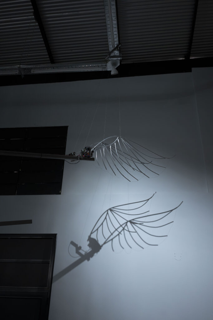 La ocupación de mi cielo, proyecto atravesado por las condiciones de confinamiento durante la pandemia de covid-19, consistió en un video en el que se lee un relato de la artista -en relación con dicha experiencia de aislamiento durante 2020-, sobre imágenes de cielos y nubes, junto con fotografías en las que porta sobre su cuerpo unas alas robóticas, escultura mecatrónica y tecno-prótesis cuya estructura de costillas metálicas sugiere, por momentos, las nervaduras de hojas o las venas en alas de libélulas que pueblan las fotografías y objetos de Elementales y Fantasía existe.7 Tarraubella prolonga las investigaciones iniciadas con este proyecto en su segunda exposición individual, La gravedad de un cuerpo que asciende, en la que exhibe fotografías de cielos surcadas por formas lineales de alas y plumas, impresas por contacto mediante la técnica del fotograma.8 En Lucernario, una estructura de hierro sostiene un montaje de fotografías que perfora el espacio, exhibiendo un cielo impreso en film backlight, iluminado con tubos led.9 Tarraubella caracteriza este cuerpo de obras como una “espectrometría del cielo”, de sus estados o apariciones en el contexto de la ciudad, y agrega que el término espectro “evoca una visión fragmentada de los fenómenos invisibles: una mirada que desvela el desmembramiento de la luz, de la energía”.10 En La máquina de hacer arcoíris la luz emitida por una linterna se descompone al pasar por un prisma dispersivo, formando un espectro de colores. En el campo de la ciencia, se denomina “espectro visible” a la región del espectro electromagnético que el ojo humano es capaz de percibir.11 Pero en la obra de Tarraubella, el sentido del término espectro no se agota en la dimensión de lo visible; refiere, sobre todo, a un modo de pensar la imagen como “fantasmagoría”, como “aparición”, consideraciones sin duda atribuibles a la fotografía, que la artista extiende asimismo a las formas en las que el video y las artes electrónicas construyen la imagen y modulan el tiempo, lo ralentizan, lo vuelven poroso. El “hacer aparecer” de la imagen no se reduce para Tarraubella al registro de lo verificable, pero tampoco consiste en un mero hacer visible lo oculto o lo que ha sido invisibilizado. La fotografía es una médium que conjura y encarna fantasmas, un pasadizo mágico a otros mundos por construir. Para la artista, la fantasía y la imaginación no constituyen territorios inexistentes o dominios opuestos a la realidad. Por el contrario, contribuyen a dar forma a los universos que habitamos y las imágenes son una manera de abrir intervalos en los tejidos sensibles dominantes para conjurar y materializar otras realidades y posibilidades de existencia.