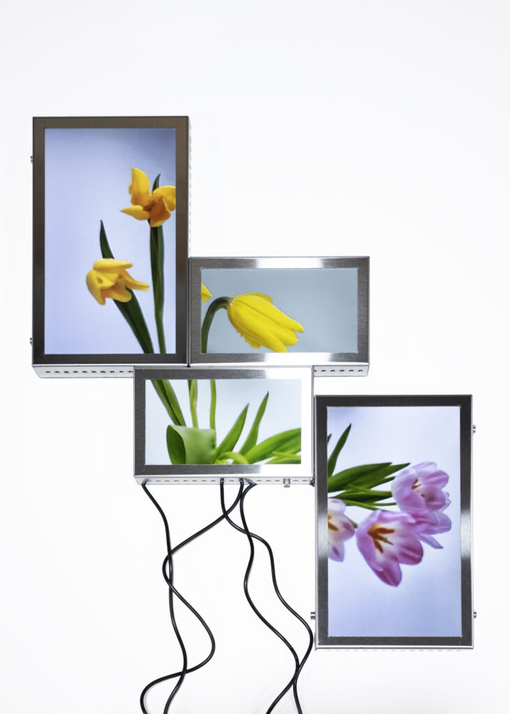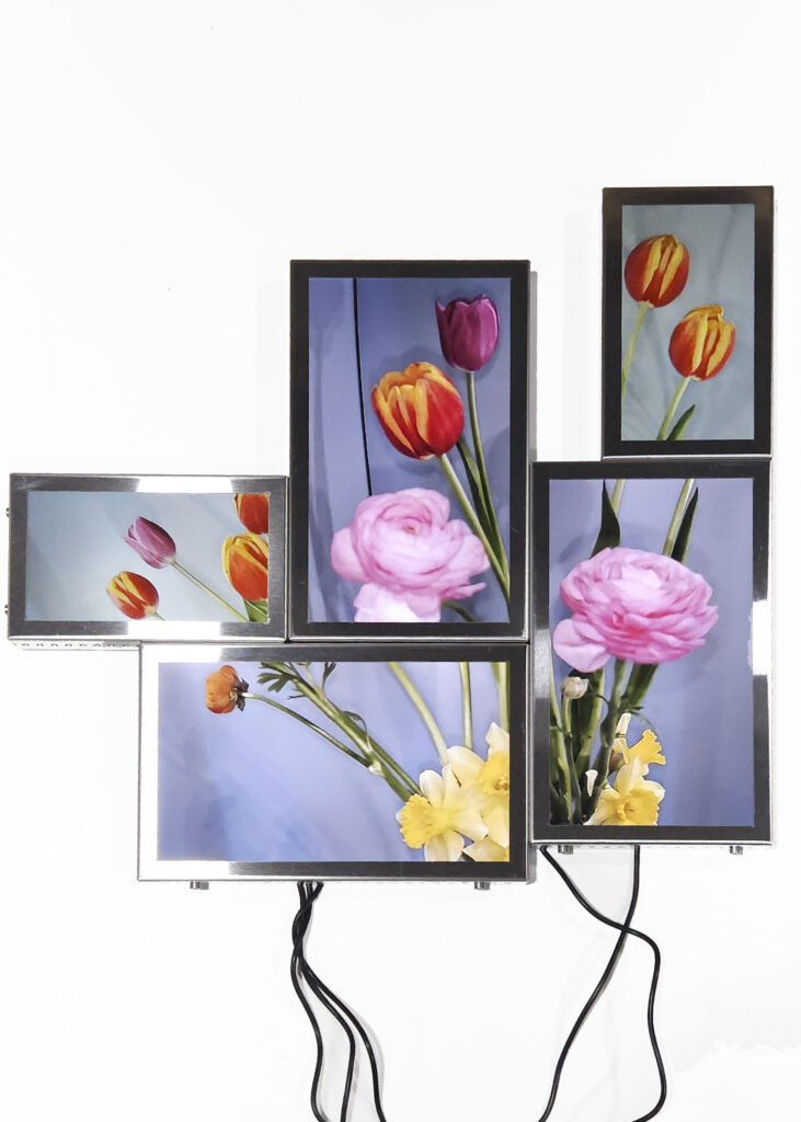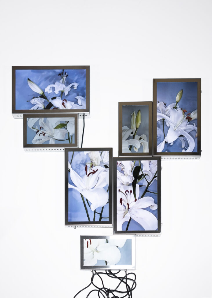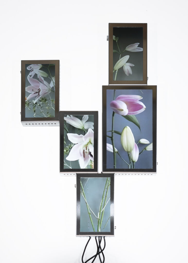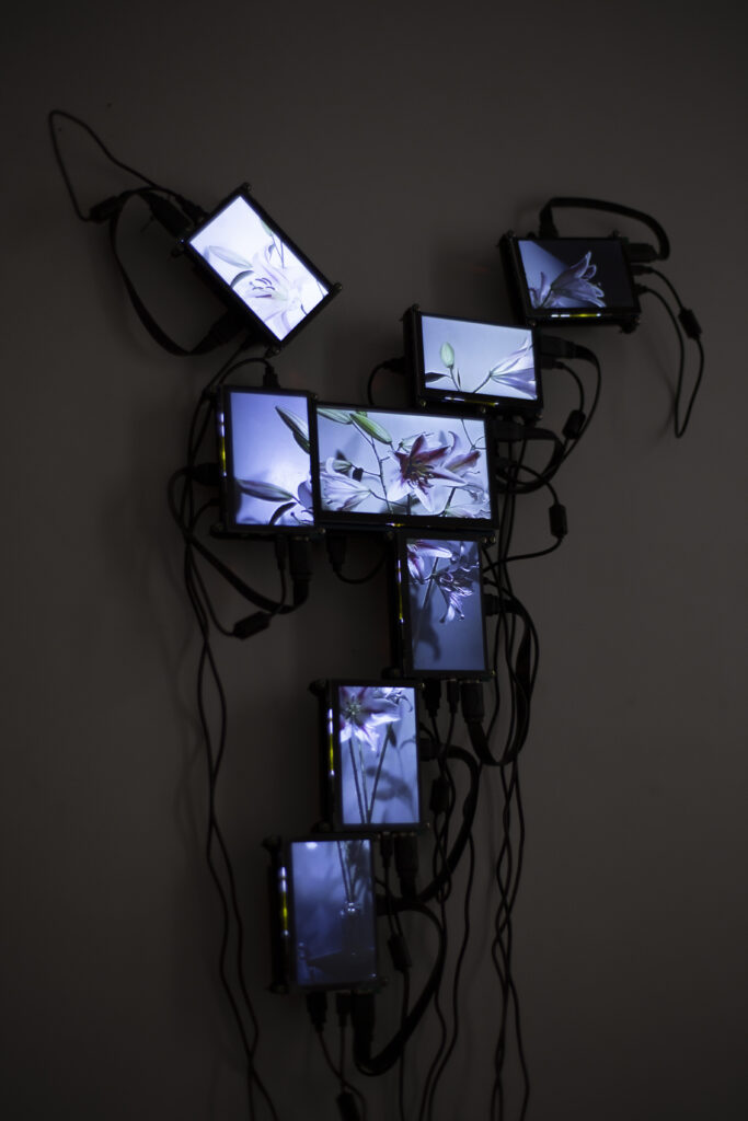 La vida secreta de las flores, proyecto iniciado en 2018, presenta un “jardín-cyborg”, un “vivero-transmedia” de videoesculturas que ensamblan fotografías y pantallas con fragmentos de videos procedentes de cámaras de seguridad. Se trata del registro audiovisual, realizado por la artista, del ciclo vital de lirios, azucenas y peonías -provenientes del mercado de floricultores de Buenos Aires-, desde su florecimiento hasta su muerte, dentro de paneles aislados y en condiciones de observación y vigilancia mediadas por un circuito cerrado de cámaras. Vanitas “infotecnológica”1, el tecno-jardín de Tarraubella articula una serie de problemáticas en torno a los modos en que los procesos de informatización contemporáneos, las imágenes audiovisuales y los dispositivos de vigilancia operan en el control y administración biopolíticos y en la configuración de subjetividades y posibilidades de existencia en el presente, al tiempo que organizan la mirada y los contornos de lo visible, dan forma a economías de aparición, modulaciones del deseo, órdenes sensibles y regímenes escópicos dominantes. A través de yuxtapuestas “imágenes-pantalla” de la vida registrada y trasmitida en loop, ofrecida al consumo en su puesta en escena audiovisual -desde sus momentos de plenitud hasta su decrepitud-, el deseo escópico es incitado y moldeado. Pero las imágenes -así lo entiende Tarraubella- no se reducen a lo visible representado. En su funcionamiento performativo, constituyen relaciones, operaciones sobre lo sensible, configuran contra- escenas que interrumpen o perforan la estabilidad de los órdenes sensoriales hegemónicos.