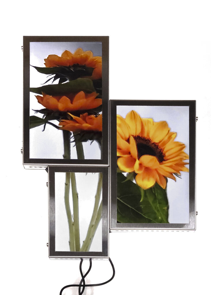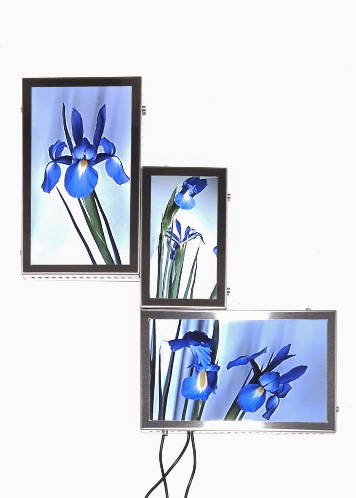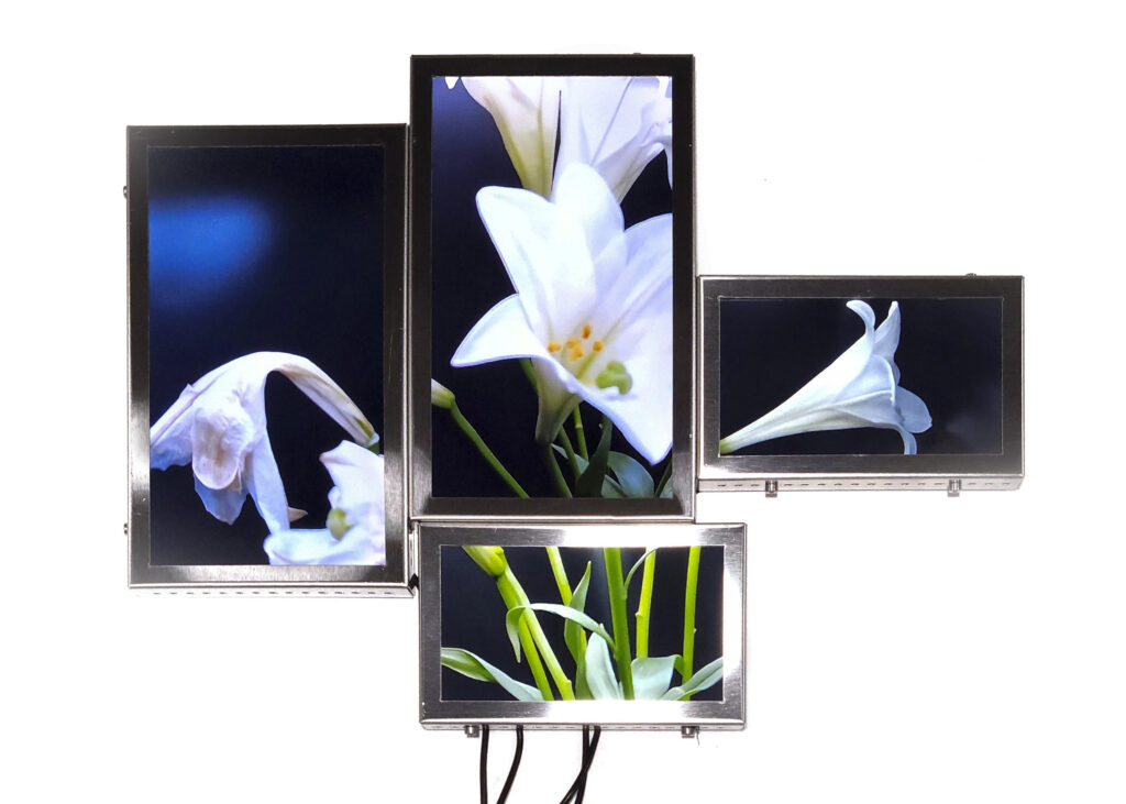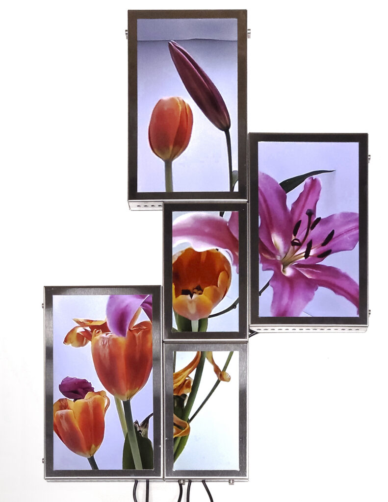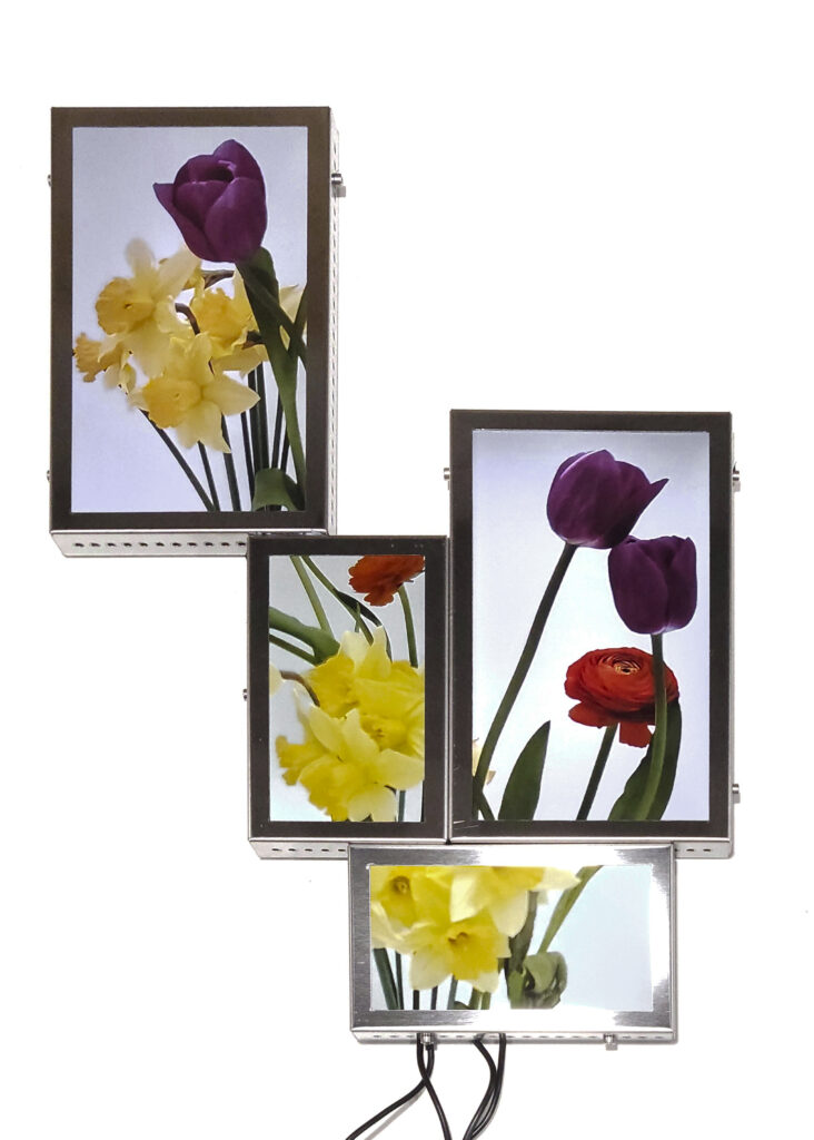 La vida secreta de las flores, proyecto iniciado en 2018, presenta un “jardín-cyborg”, un “vivero-transmedia” de videoesculturas que ensamblan fotografías y pantallas con fragmentos de videos procedentes de cámaras de seguridad. Se trata del registro audiovisual, realizado por la artista, del ciclo vital de lirios, azucenas y peonías -provenientes del mercado de floricultores de Buenos Aires-, desde su florecimiento hasta su muerte, dentro de paneles aislados y en condiciones de observación y vigilancia mediadas por un circuito cerrado de cámaras. Vanitas “infotecnológica”1, el tecno-jardín de Tarraubella articula una serie de problemáticas en torno a los modos en que los procesos de informatización contemporáneos, las imágenes audiovisuales y los dispositivos de vigilancia operan en el control y administración biopolíticos y en la configuración de subjetividades y posibilidades de existencia en el presente, al tiempo que organizan la mirada y los contornos de lo visible, dan forma a economías de aparición, modulaciones del deseo, órdenes sensibles y regímenes escópicos dominantes. A través de yuxtapuestas “imágenes-pantalla” de la vida registrada y trasmitida en loop, ofrecida al consumo en su puesta en escena audiovisual -desde sus momentos de plenitud hasta su decrepitud-, el deseo escópico es incitado y moldeado. Pero las imágenes -así lo entiende Tarraubella- no se reducen a lo visible representado. En su funcionamiento performativo, constituyen relaciones, operaciones sobre lo sensible, configuran contra- escenas que interrumpen o perforan la estabilidad de los órdenes sensoriales hegemónicos.