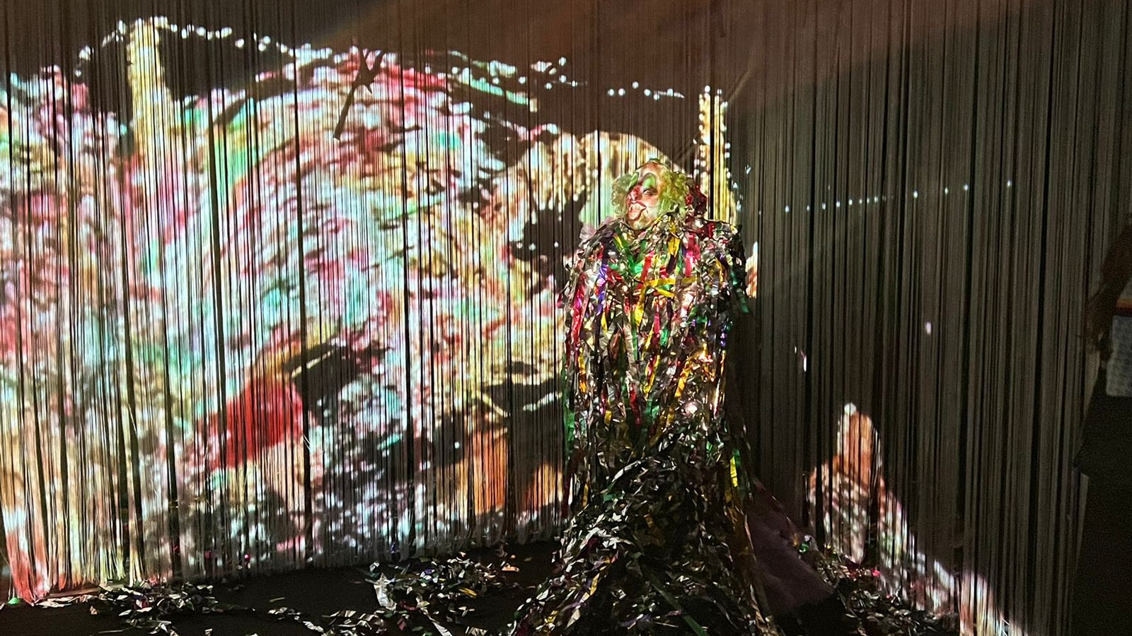 Installation. Metal estructure, 4 videos secuence (La balsada #1, #2, #3 & #4) reproduced on 4 channel videos on 4 thread curtains/screen projection (HD colour video. Stereo-sound. Duration 6’ 30’’) quadraphonic sound, 6 fans, colored metallic streamers.