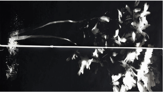 Un fotograma es la imagen obtenida sin la cámara fotográfica, por medio de un proceso que consiste en superponer el objeto a registrar sobre el material fotosensible y exponerlo a la luz directa, en este caso papel fotográfico fotosensible con un flash de mano, de modo que el fotograma es la huella, la sombra de la propia selva impresa de modo químico sobre el rollo de papel fotográfico.