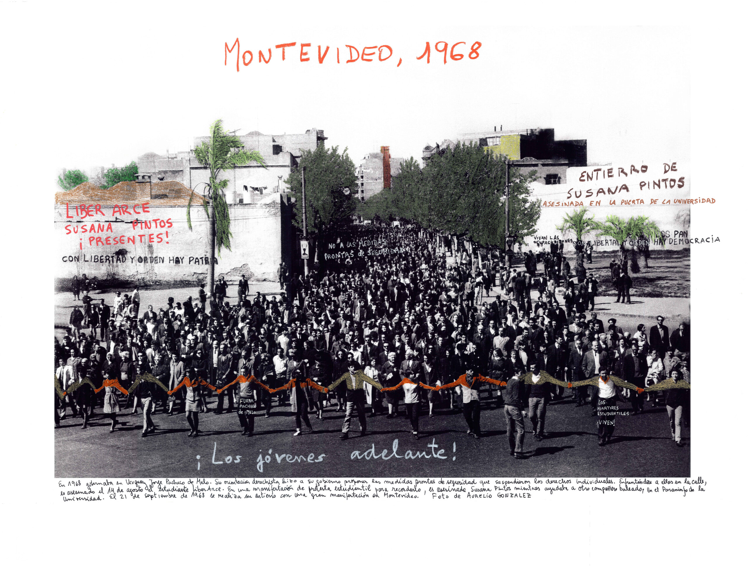 Fotografía de archivo blanco y negro © Manuel Bidermanas,1968, intervenida con textos a mano por Marcelo Brodsky, 2014