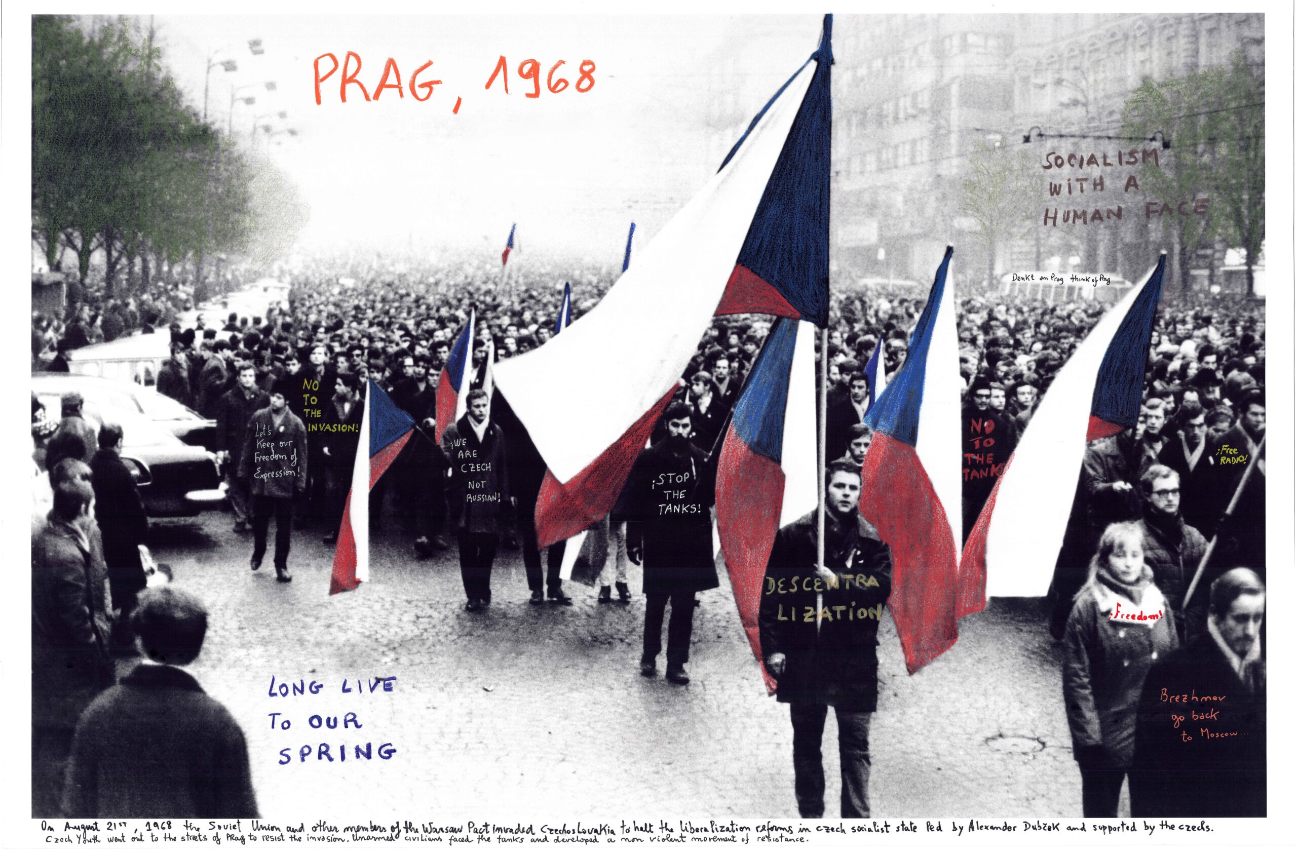 Esta muestra representa el punto de llegada a nuestro país, luego de su itinerancia por Boston y Nueva York, de un conjunto de imágenes de archivo de diferentes manifestaciones públicas y políticas que tuvieron lugar en el año 1968, de diferentes focos de conflicto que marcaron el devenir y se constituyeron como puntos de inflexión de la historia. Sobre este material de archivo el artista interviene las imágenes releyendo y sobreescribiendo, con su propia caligrafía, frases emblemáticas propias de cada lugar y en su propia lengua que reactualiza en el conjunto tejiendo un nuevo campo de sentido. Estas fotografías alteradas son a su vez, en el espacio, conectadas por marcas e inscripciones construyendo así una red, una cartografía política alternativa. En este gesto de actualización del suceso histórico, en un proceso de reformulación de materiales visuales existentes, Brodsky se apropia de ellos para presionar el pasado contra el presente ofreciendo al espectador la oportunidad para identificarse y conmoverse, permitiendo la comprensión de sucesos lejanos y la reactivación de la memoria. Su intervención actúa como Zeitgeist y se resuelve en una instalación comprendida por imágenes, piezas sonoras y marcas en los muros. 1968: El fuego de las ideas ofrece una narrativa subjetiva en la que la fotografía actúa como memoria.