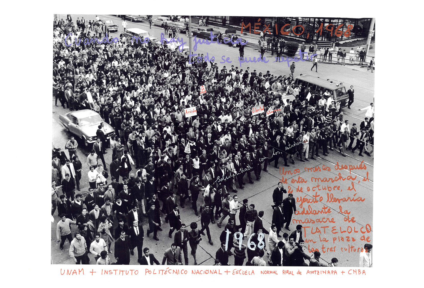 Marcelo Brodsky, artista y activista de los derechos humanos, trabaja a partir de imágenes y documentos de eventos específicos para investigar problemáticas sociales, políticas e históricas mas amplias. A través de su obra busca concientizar a los espectadores sobre momentos históricos, algunos de los cuales lo forjaron, a él a su familia así como a muchos de sus amigos. Más específicamente, y como muchos de los de su generación en Argentina, Brodsky fue perseguido durante la dictadura militar, que durante siete años de reinado del terror, fue responsable de la tortura y muerte de entre 10.000 y 30.000 argentinos, incluyendo al hermano menor del artista, Fernando. Brodsky logra escapar de esa situación y vive en el exilio hasta que la dictadura finaliza en el año 1983. Aunque las experiencias personales instigan y dan forma a sus impulsos artísticos, concientizar y educar a las audiencias con la esperanza de prevenir a otros de tal terror es una de sus más fuertes motivaciones. Para hacer que los momentos elegidos y sus consecuencias sean accesibles al espectador, Brodsky aborda el medio fotográfico desde múltiples entradas. Constantemente su obra da cuenta de un profundo entendimiento del potencial poder de las fotografías, tanto algunas de ellas al momento de su creación como registros de noticas, como otras provenientes de subsecuentes publicaciones y memorias. Por décadas, Brodsky fue dueño y director de una importante agencia de fotografías en Latinoamérica. Su éxito radicó parte en su conciencia sobre qué fotografías atraerían a un mayor público internacional, y parte porque comprendió cómo utilizar secuencias de imágenes en que la percepción de una simple imagen podía cambiar al ser emparentada o secuenciada junto a otras. También entendió cómo orquestar a los textos con las imágenes de manera de dirigir la percepción de los espectadores incluso cuando las palabras parecieran ser aparentemente neutrales. Apasionado y determinado, Brodsky no tiene intenciones de ser neutral. (…) En “1968: el fuego de las ideas” Brodsky presenta las moviizaciones estudiantiles y relaciona eventos sucedidos en Argentina con la turbulencia social en todo el mundo a finales de los años sesenta. Los manifestantes estadounidenses que participaron de la Marcha de los Pobres en Washington liderada por Martin Luther King unos meses antes de su asesinato; los manifestantes en Londres en contra de la Guerra de Vietnam; en Bogotá, México, Córdoba, Río de Janeiro y San Pablo, trabajadores y estudiantes haciendo campaña juntos, en contra de los regímenes militares y otros tipos de estructuras de gobierno. Se los muestra con brazos estrechados, con banderas ondulantes y pancartas, ejerciendo una acción urbana masiva para reclamar por sus demandas. Las obras también incluyen extractos de discursos de Martin Luther King, el Che Guevara, Daniel Cohn Bendit, Herbert Marcuse y Agustín Tosco, cuyas ideas y acciones nutrieron a muchos de los manifestantes. En una pancarta de la manifestación del Mayo Francés de 1968 se muestra, el grito de “L’imagination au pouvoir” (la imaginación al poder). Más que un llamado a “decir la verdad al poder” que sonaba en otras manifestaciones de la época, los parisinos pedían por el fin de todos los límites, incluso en la imaginación. Brodsky es pragmático y directo. No pretende liberar la imaginación de toda restricción, sino potenciar su uso contra el poder corrupto y brutal. Tanto si nos invita a aprender, y a no olvidar jamás las atrocidades del pasado, a honrar a los líderes justos o, como en su más reciente campaña, a mantener la presión sobre las autoridades para resolver y enjuiciar a los responsables de los más recientes asesinatos en masa, aún impunes. Anne Tucker