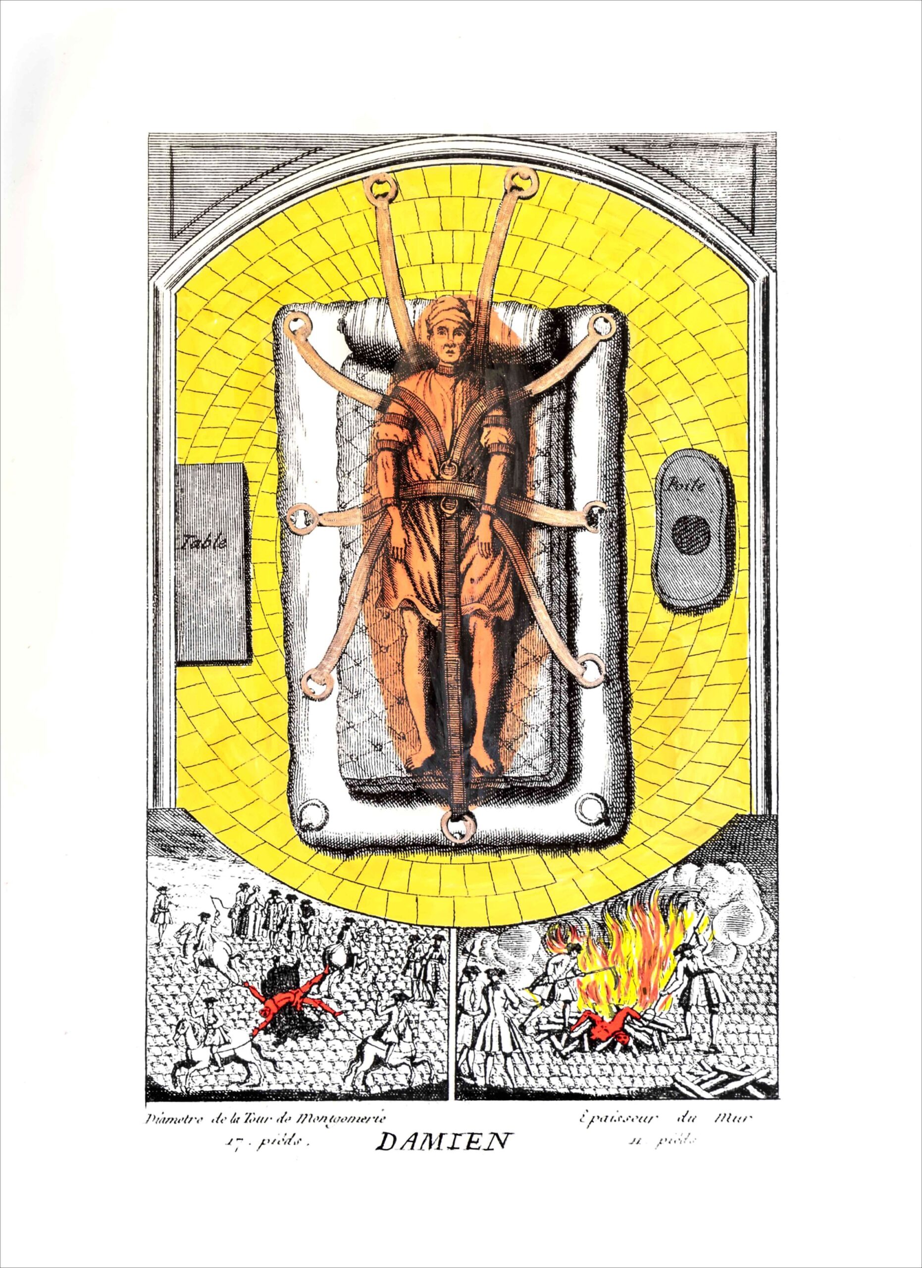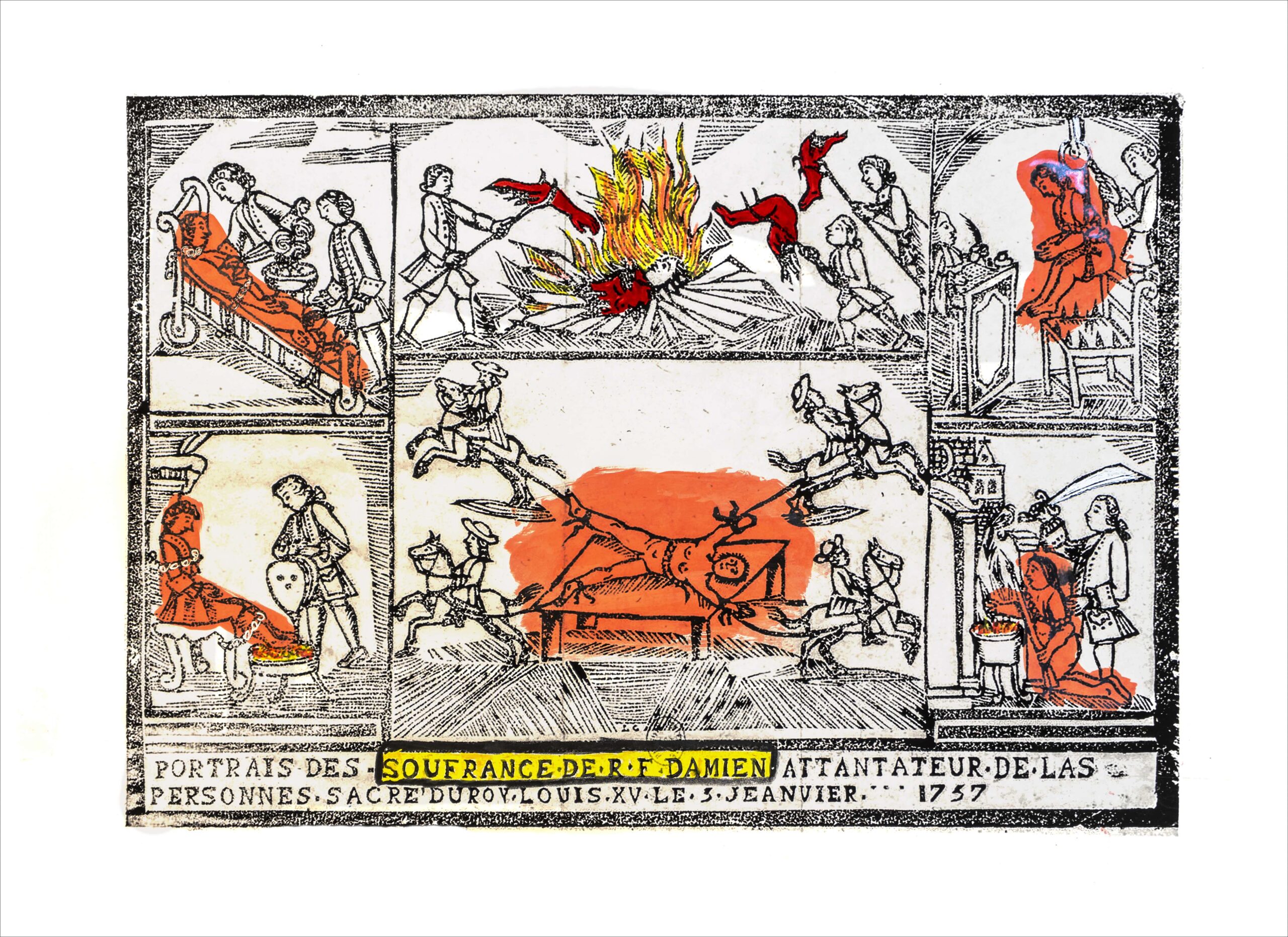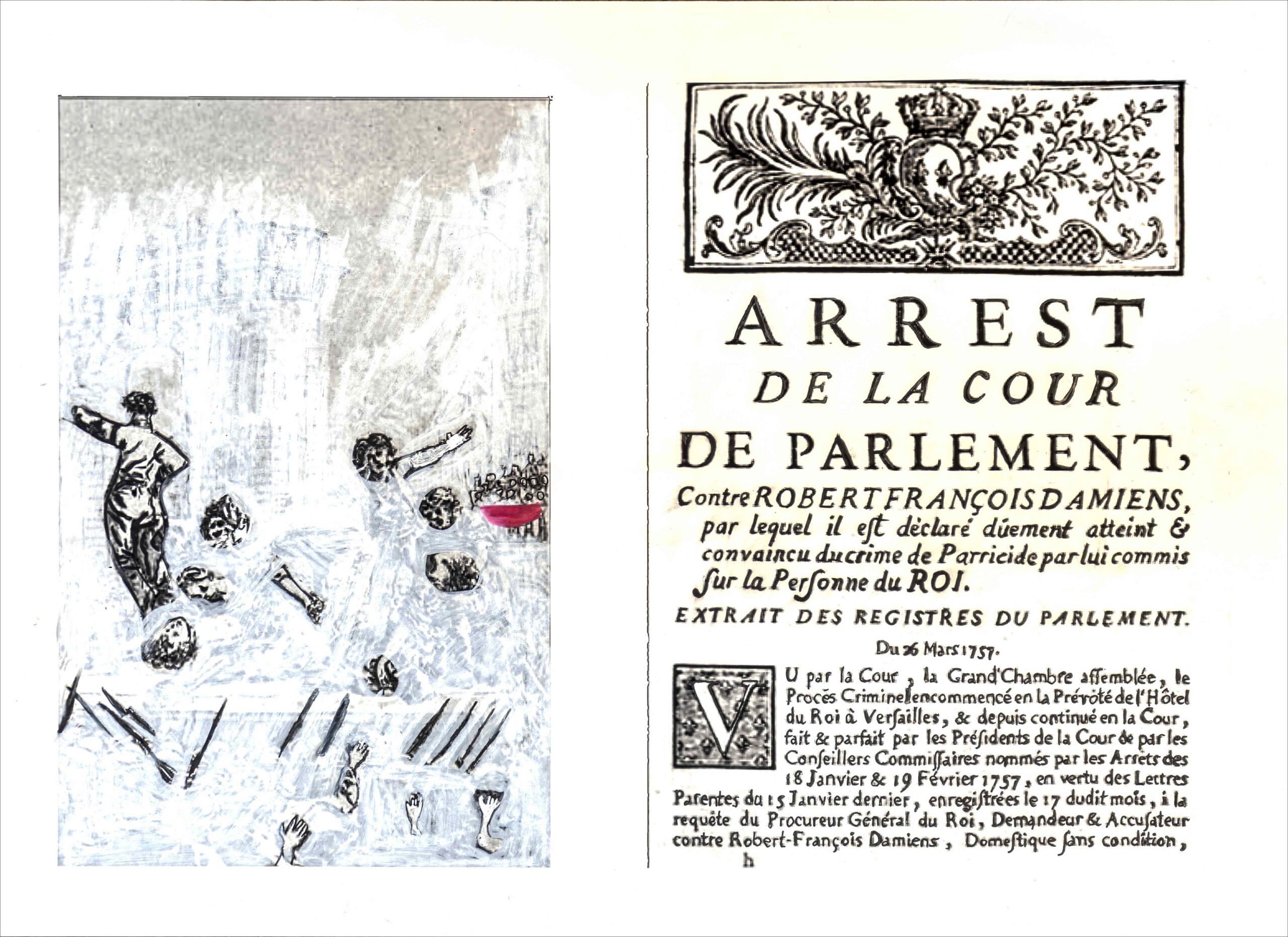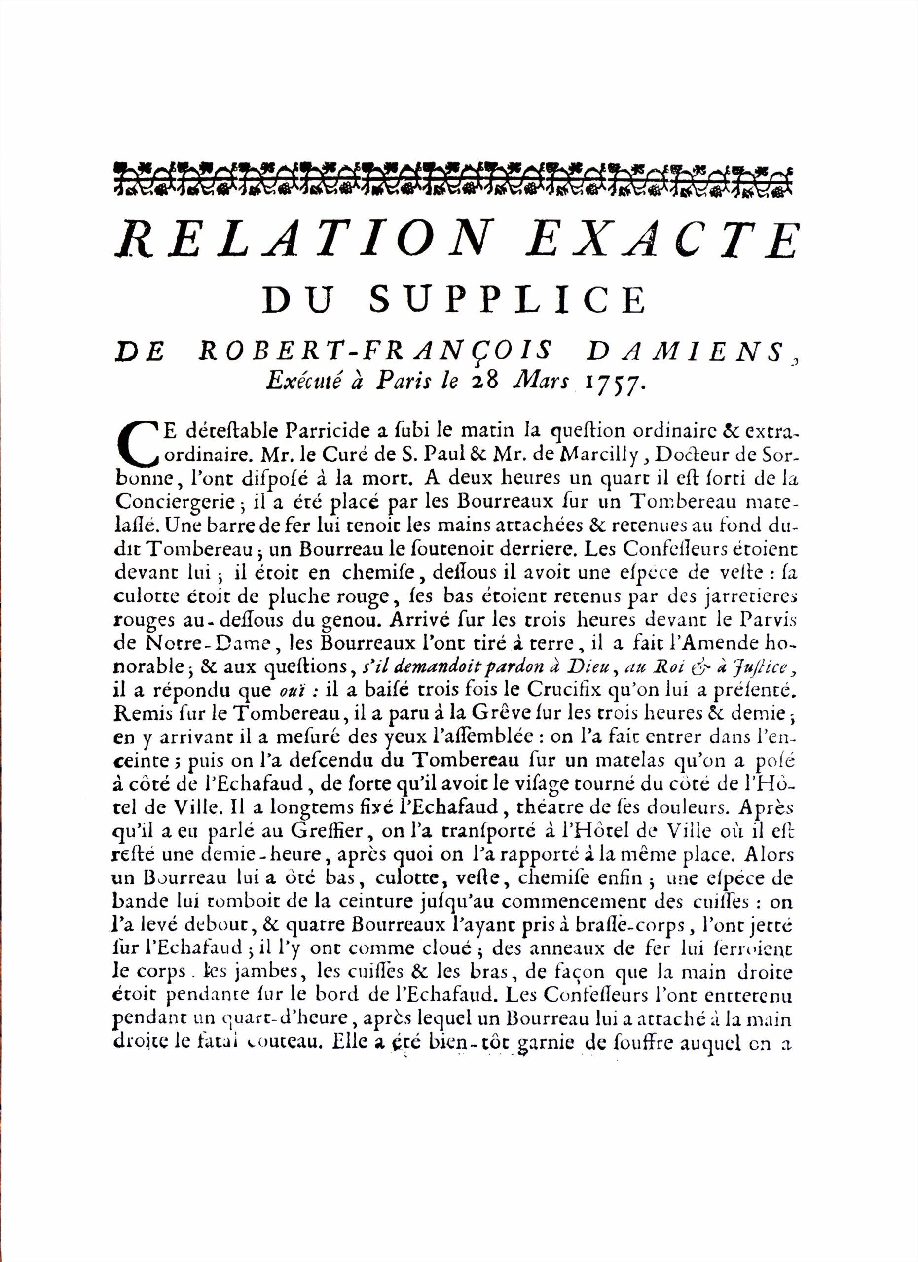 Damiens intentó matar a  Luis XV en 1757 y sufrió idéntica pena que la de Ravaillac. De ambas atrocidades se conservan los grabados que  las representaron y se hicieron circular por toda Francia.