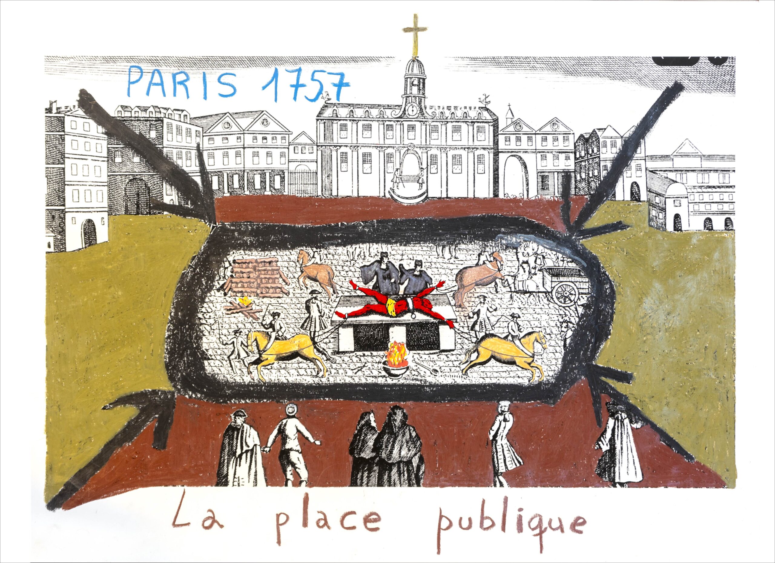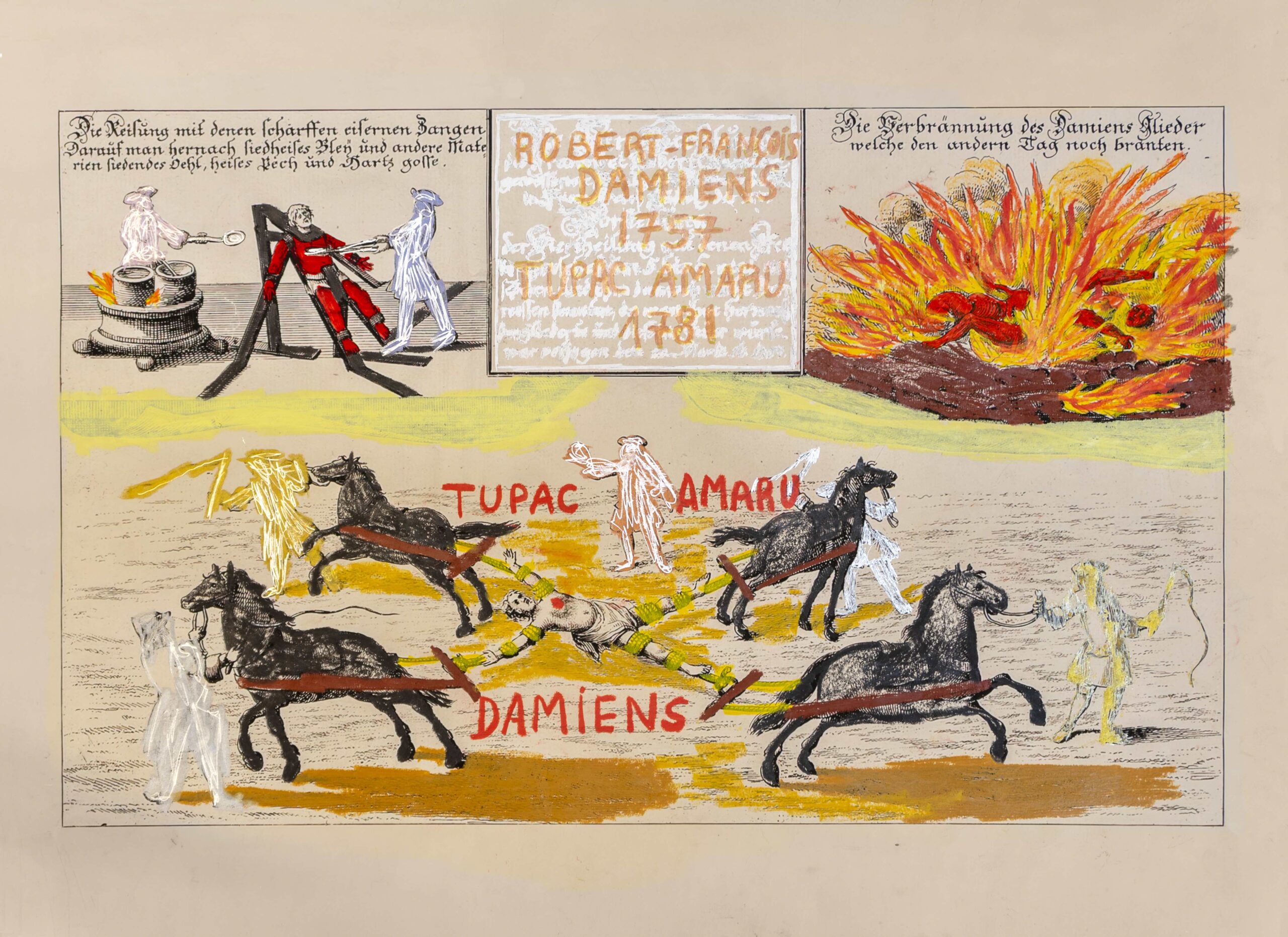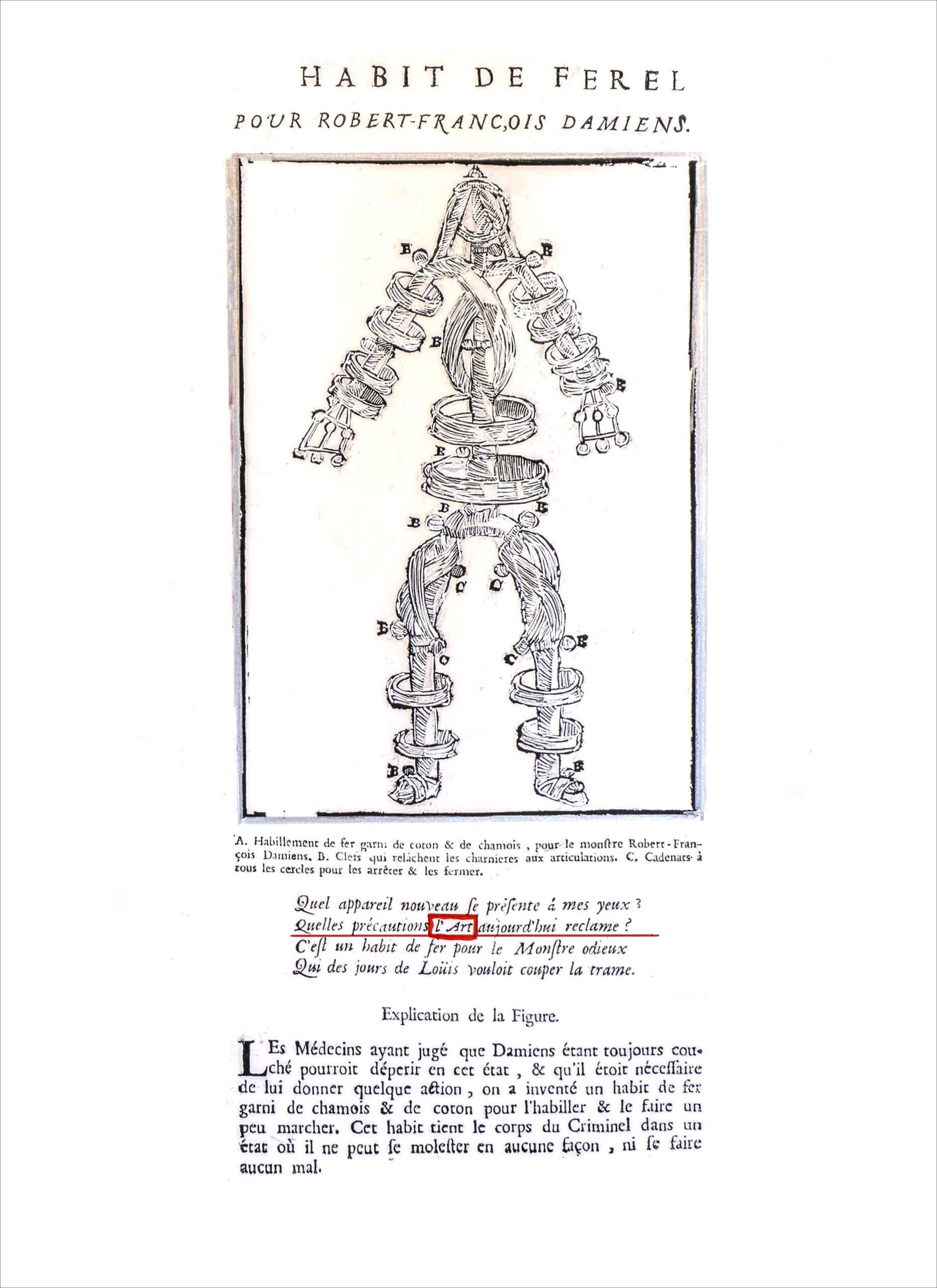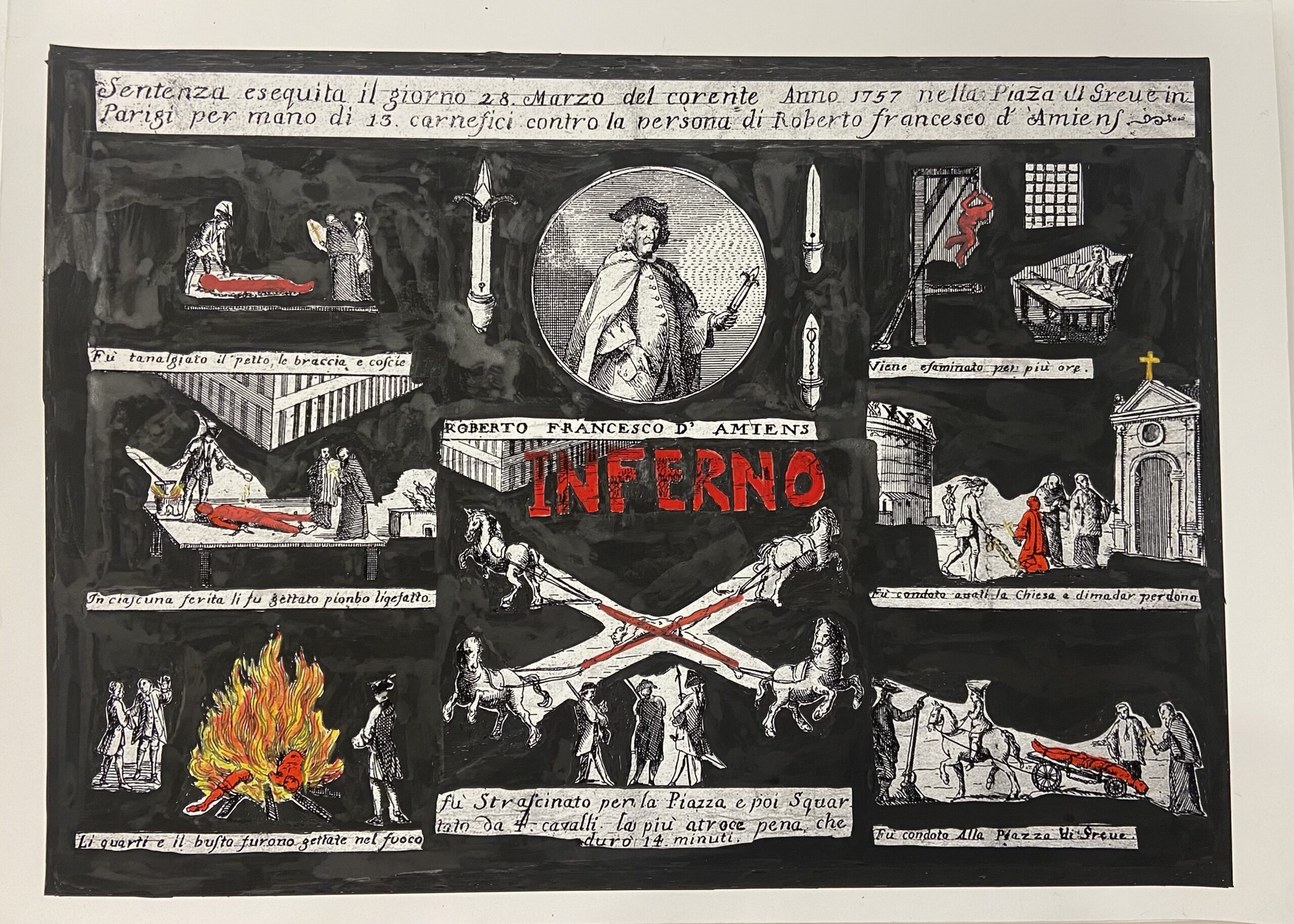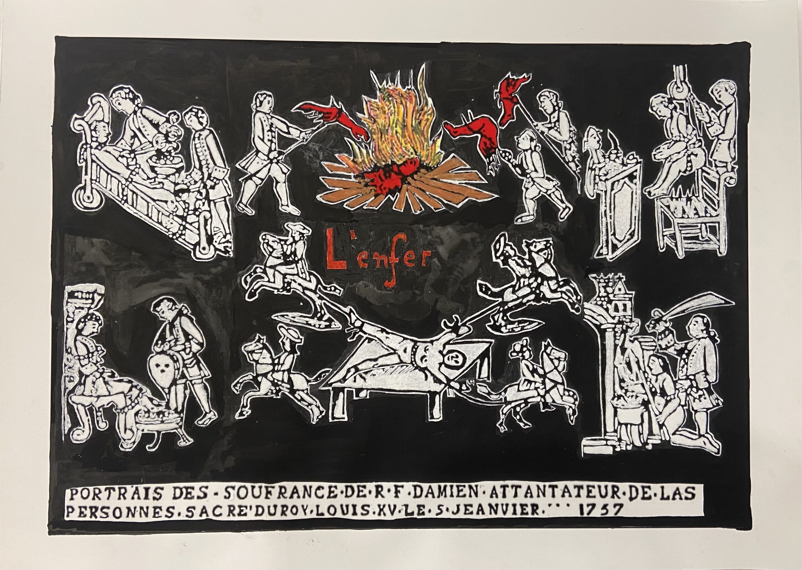 Damiens intentó matar a  Luis XV en 1757 y sufrió idéntica pena que la de Ravaillac. De ambas atrocidades se conservan los grabados que  las representaron y se hicieron circular por toda Francia.