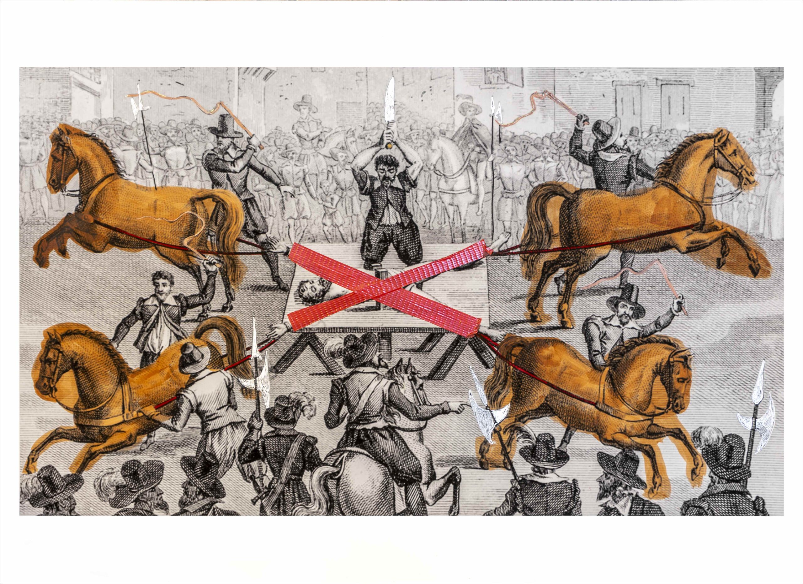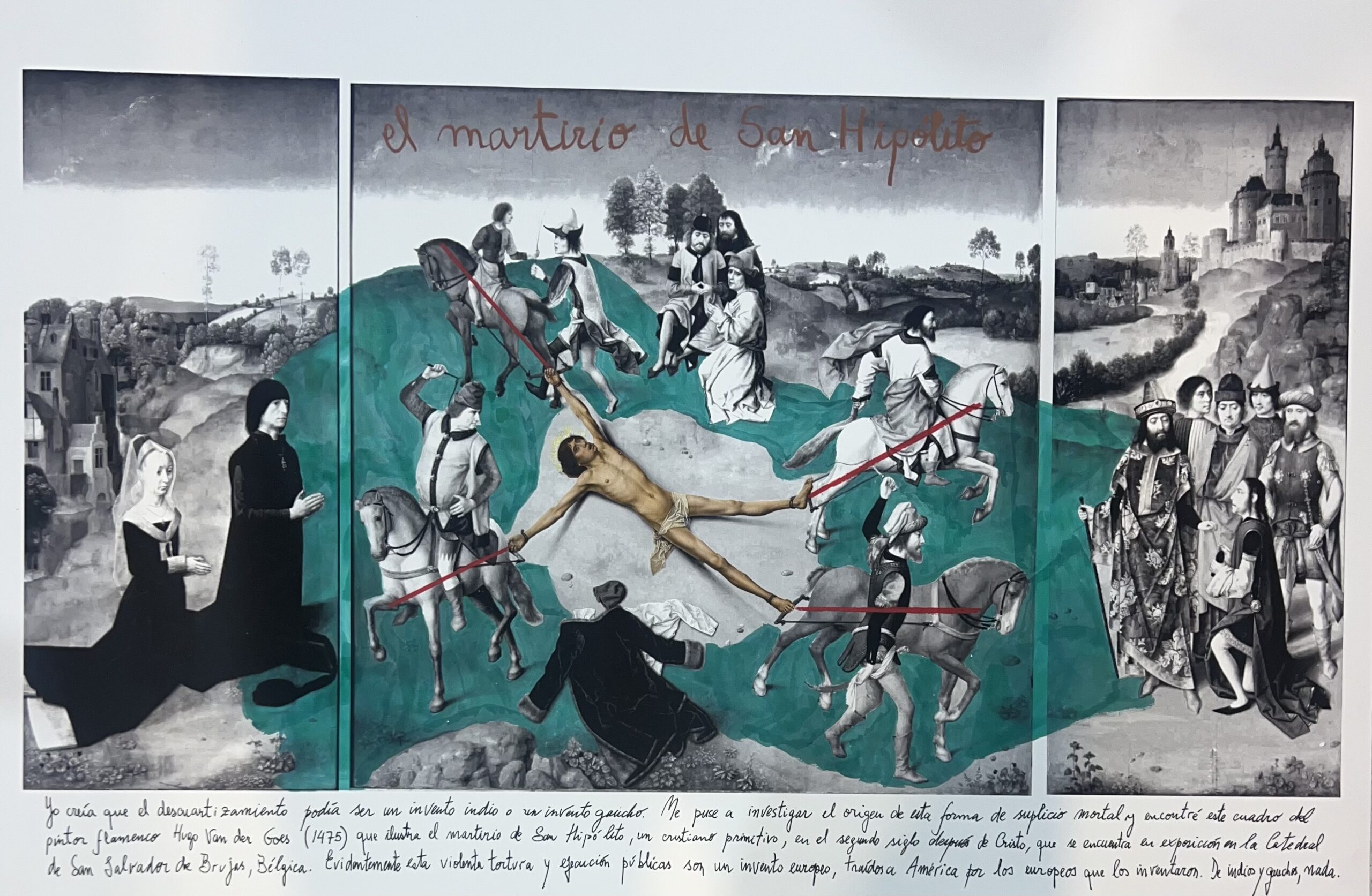 El descuartizamiento de un ser humano fue un método para ajusticiar condenados desde la Antigüedad. A veces  podía ejecutarse sobre el cadáver de un reo ya muerto, como forma de desprecio y de profanación del cadáver. En  tales casos, se suponía que el alma del descuartizado sufriría los tormentos aplicados a sus despojos y se sentiría  desgarrada hasta desaparecer o bien sentiría dolores terribles (psíquicos, imaginarios si bien devastadores) por  toda la eternidad. Una forma muy difundida del suplicio era la aplicada al ser humano vivo cuyas extremidades  se ataban a caballos u otras bestias de tiro. En el sudeste asiático, solía usarse un elefante amaestrado que  pisaba al condenado sin matarlo, para arrancarle luego, uno a uno, los cuatro miembros y aplastarle la cabeza  o directamente decapitarlo. En China, el descuartizamiento o, mejor dicho, el corte minucioso del cuerpo en  rebanadas recibía el nombre de ling-chi y su aplicación se reservaba para quienes hubiesen atentado gravemente  contra el orden social, que se identificaba asimismo con el orden cósmico; el ling-chi fue abolido por decreto  imperial en 1905. Pero, insisto, la forma más ordinaria fue la del tironeo de brazos y piernas con caballos a los  que se castigaba y azuzaba hasta separar los miembros del tronco. Un mártir cristiano, san Hipólito, padeció  probablemente el descuartizamiento durante la persecución del emperador Maximino el Tracio en el año 235.  La representación del hecho se propagó en la Europa de la baja edad media, desde el retablo en mármol de  1225-1250 que lleva su nombre y está ahora en el Museo del Louvre o la miniatura que representa su martirio en  el manuscrito iluminado de la Vie des Saints, obra de Richard de Montbaston del siglo XIV, hasta el magnífico  tríptico pintado por Hugo van der Goes y Dieric Bouts en Flandes en 1468 (Brujas, Museo de la Catedral).