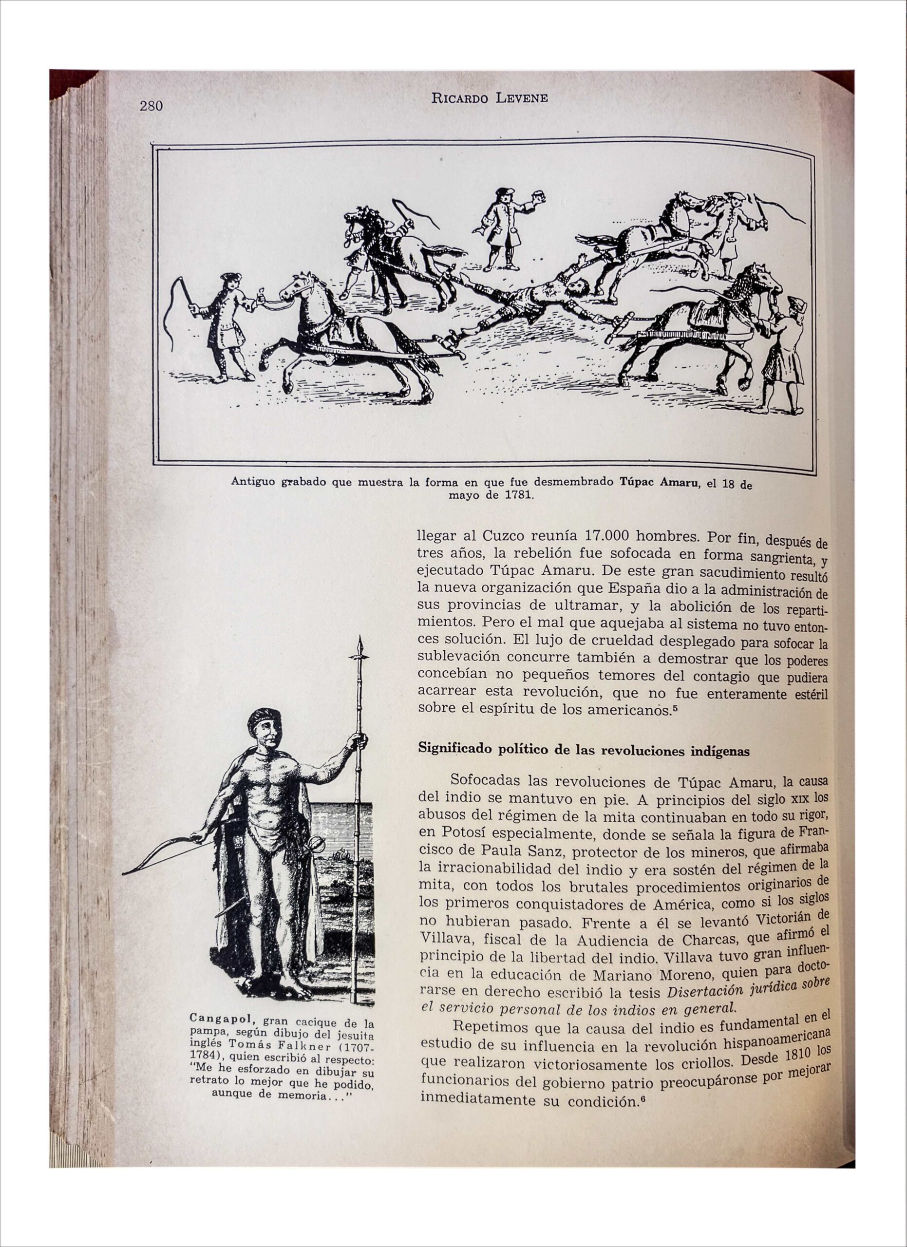 Por último, la sublevación de José Gabriel Condorcanqui Noguera contra el poder español en el sureste del Perú  culminó de forma semejante. Se ve que los Borbones (Enrique IV, Luis XV y Carlos III de España, rey cuando se  produjo la rebelión de Condorcanqui) tenían una cierta propensión a blandir el descuartizamiento en los casos  de rebeliones antimonárquicas. José Gabriel era descendiente del último rey del Tahuantisuyu, Túpac Amaru I,  de ahí que fuese llamado Túpac Amaru II por los nuevos quechuas insurrectos. Lo cierto es que, tras la derrota de  Túpac Amaru II en 1781, el heredero de los incas fue ajusticiado en la plaza mayor de Cusco. Hubo de presenciar  la ejecución de toda su familia por ahorcamiento y garrote antes de padecer, él mismo, el descuartizamiento. La  corpulencia y la resistencia de Túpac Amaru II impidieron que los caballos pudiesen desmembrar su cuerpo con  vida. José Antonio de Areche, visitador enviado por el rey Carlos III, ordenó entonces que el insigne rebelde,  héroe de la libertad y protomártir de la emancipación americana, fuese decapitado. Los cuerpos muertos de  Túpac Amaru, su esposa Micaela Bastidas y otros siete parientes fueron descuartizados. Los restos se enviaron  a sitios cercanos y remotos y se exhibieron durante meses a través de todo el virreinato del Perú.