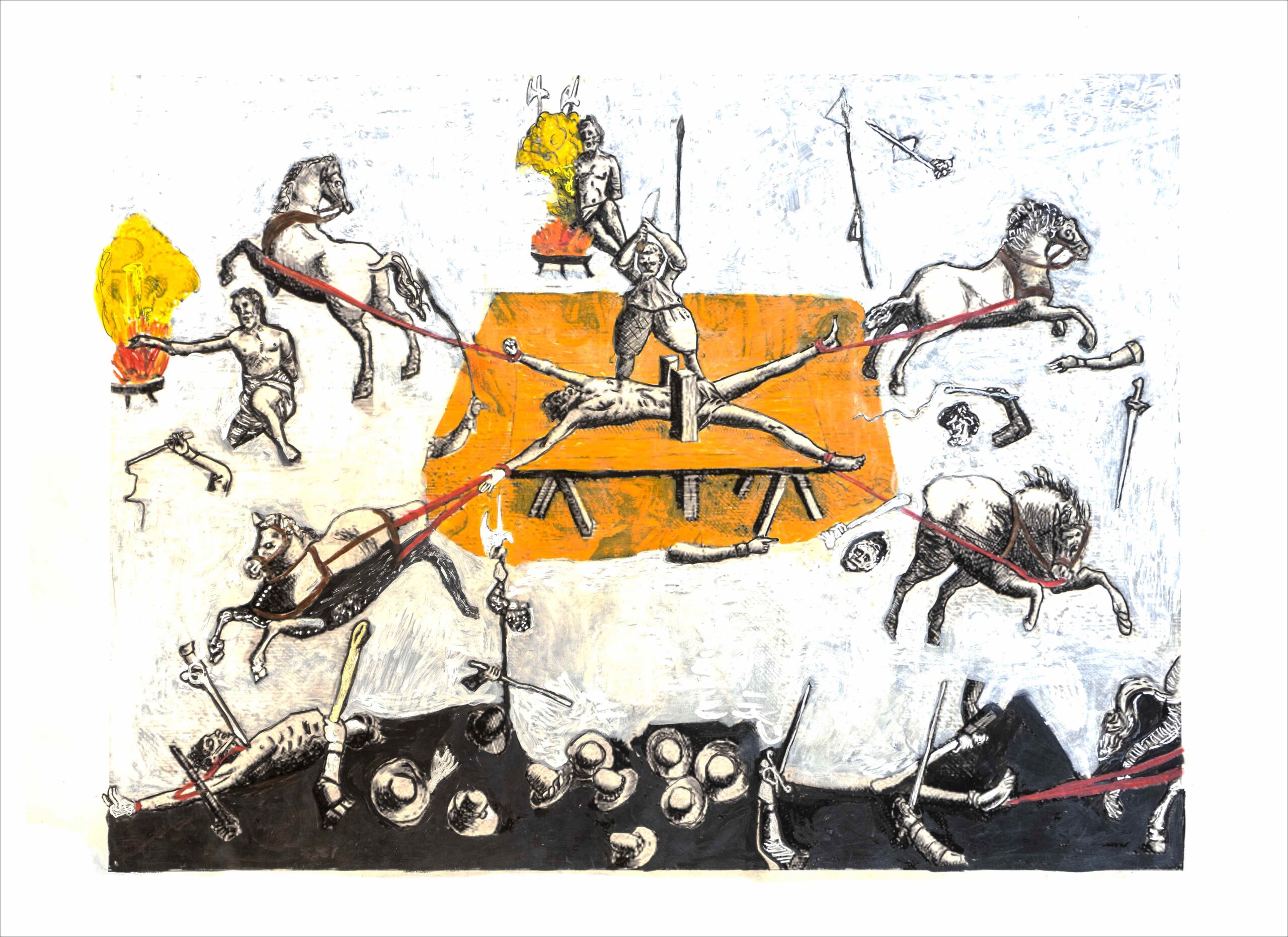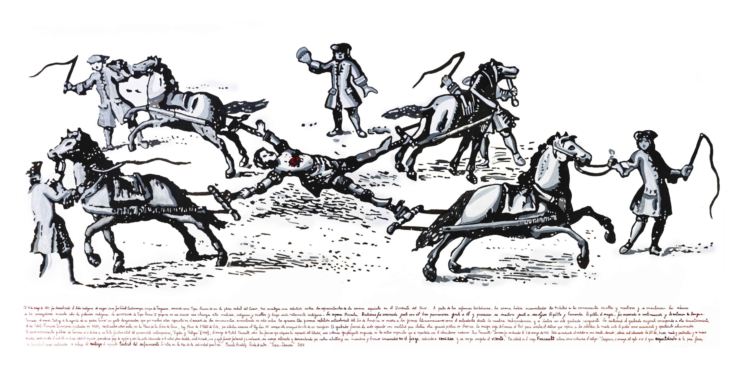 La representación del mártir desató una investigación sobre la colonización epistemológica en América Latina, que  configura los fundamentos de la exposición MARTIRIO. Las obras buscan esclarecer la génesis de las imágenes del  desmembramiento de Túpac Amaru, su pregnancia en el imaginario colectivo de la sublevación, resonando con las  dinámicas de vigilancia y control articuladas por Michel Foucault.