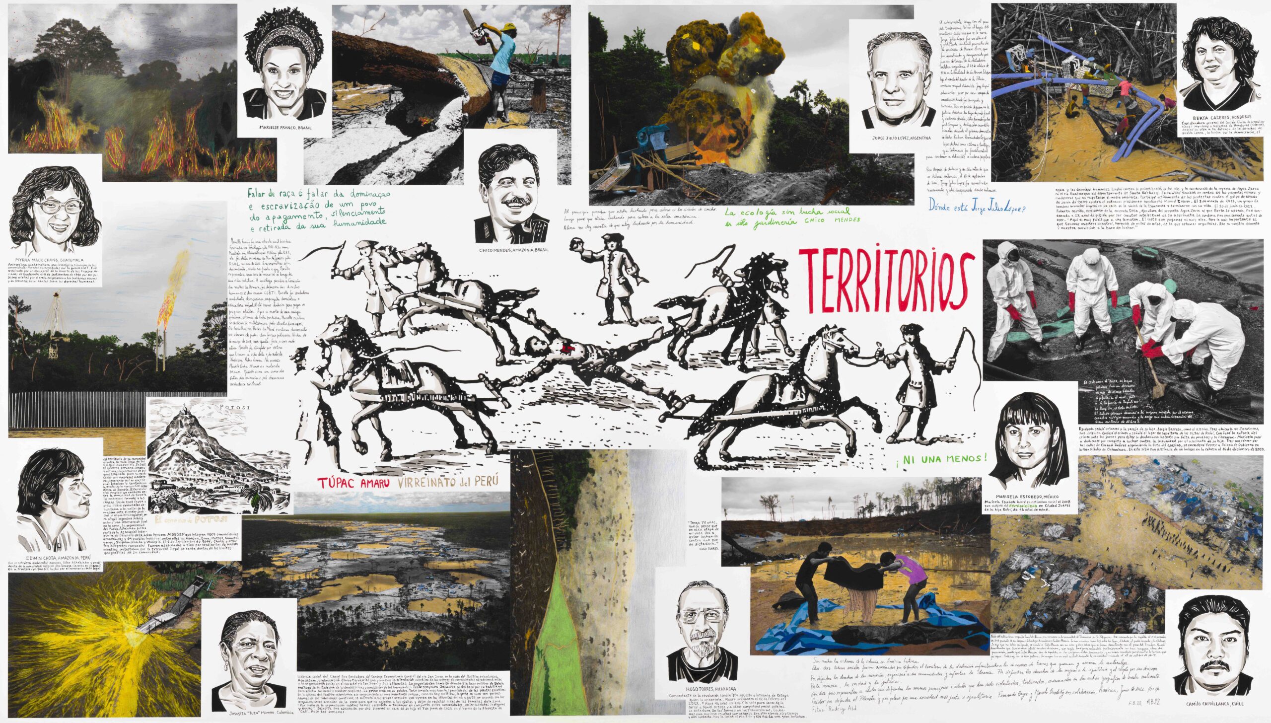 En su interés vital por preservar la memoria, y asintiendo la inminente crisis medioambiental, reconociendo a la naturaleza  como sujeto de derechos humanos, Marcelo Brodsky en colaboración con Fernando Bryce concibieron TERRITORIOS (2022) en su residencia artística compartida en el Espacio 23, Colección de Jorge Pérez en Miami, USA. La obra rinde  tributo a diez dirigentes latinoamericanos asesinados por defender la naturaleza, sus comunidades locales y los derechos  humanos. En el centro de la pieza se ensancha la figura de Túpac Amaru descuartizado, que en una correspondencia  entre el cuerpo del mártir y el territorio latinoamericano, conceptualiza la sensación colectiva de fragmentación física  despuntada por la degradación de los ecosistemas y la impotencia de toda ideología o perspectiva política para  remediarlo.