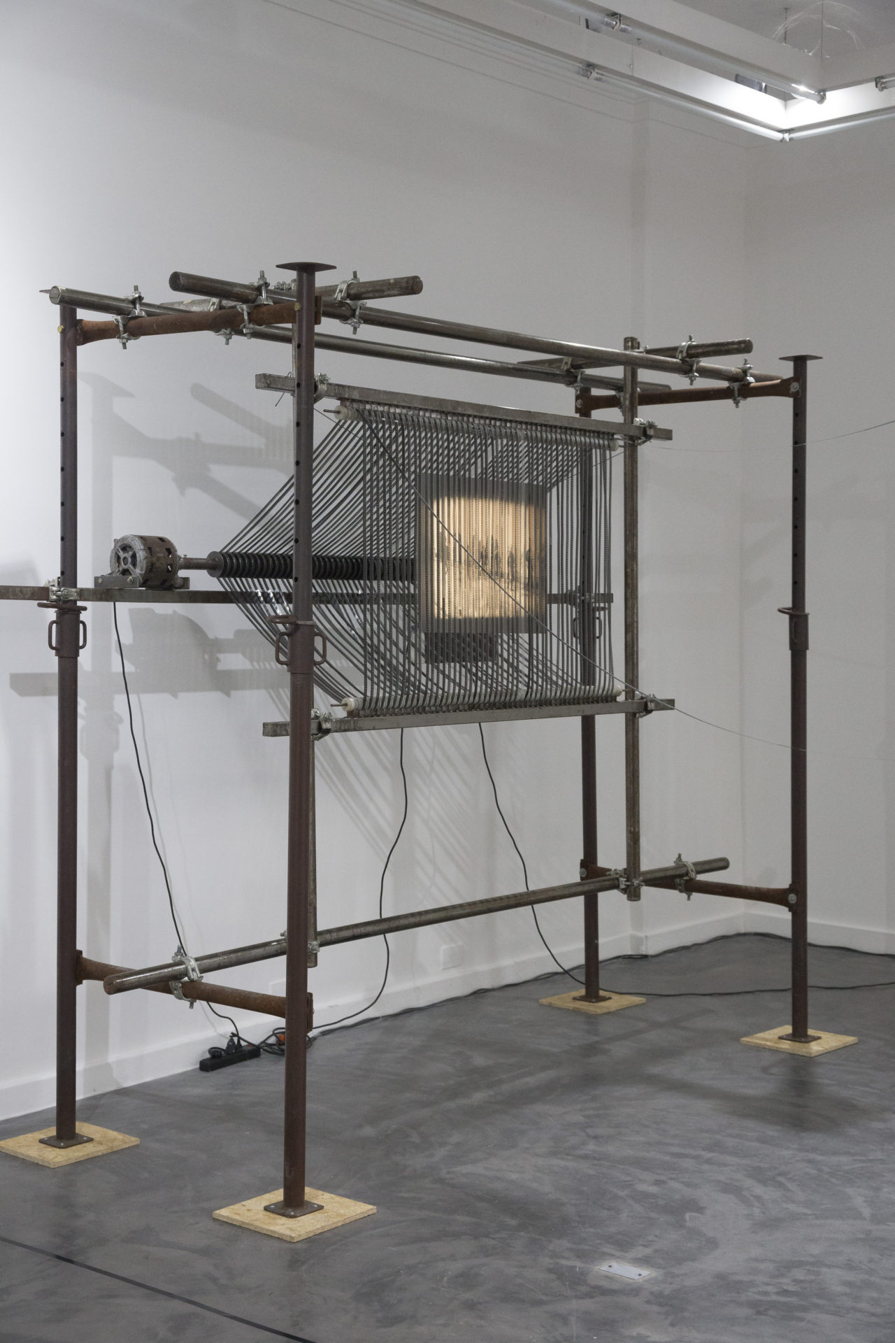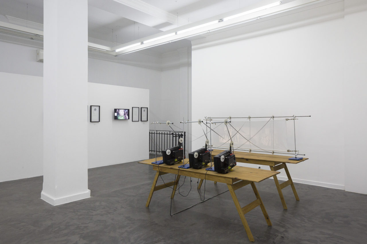 This exhibition seeks to highlight this cross between visual art expressions (installation, sculpture) and contemporary audiovisuals (expanded cinema, experimental film), through a complex of home movie format film installations, which highlight the craft trade, the film machinery and the electro/mechanical/photochemical -conformed mainly by the Super 8 and 16mm projectors- that the artist operates in the image production process. The film projectors that compose the works have alterations in their traditional use, and this is due to the fact that part of their form and operation system have been modified. Universal supports and film drag systems, result in Projesculptures. They allow the film to circulate through space, while allowing the film to be projected on different surfaces.