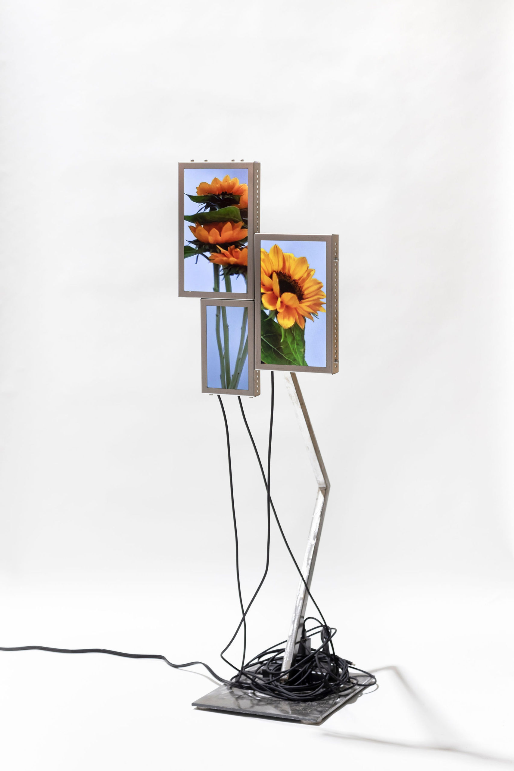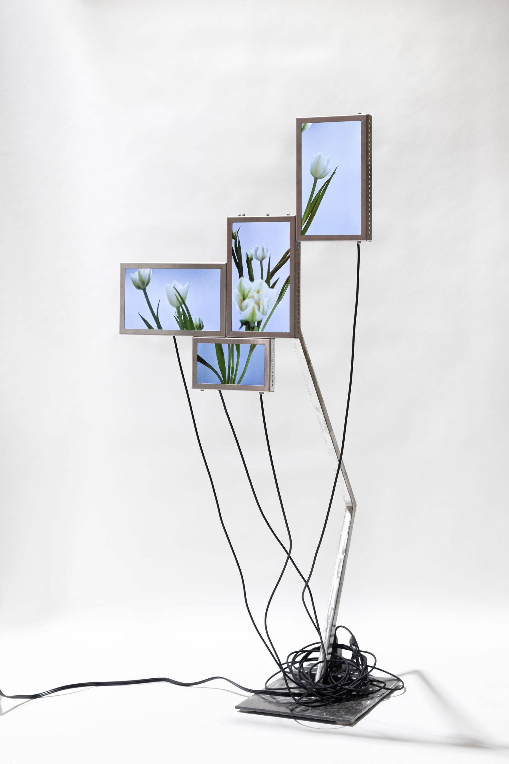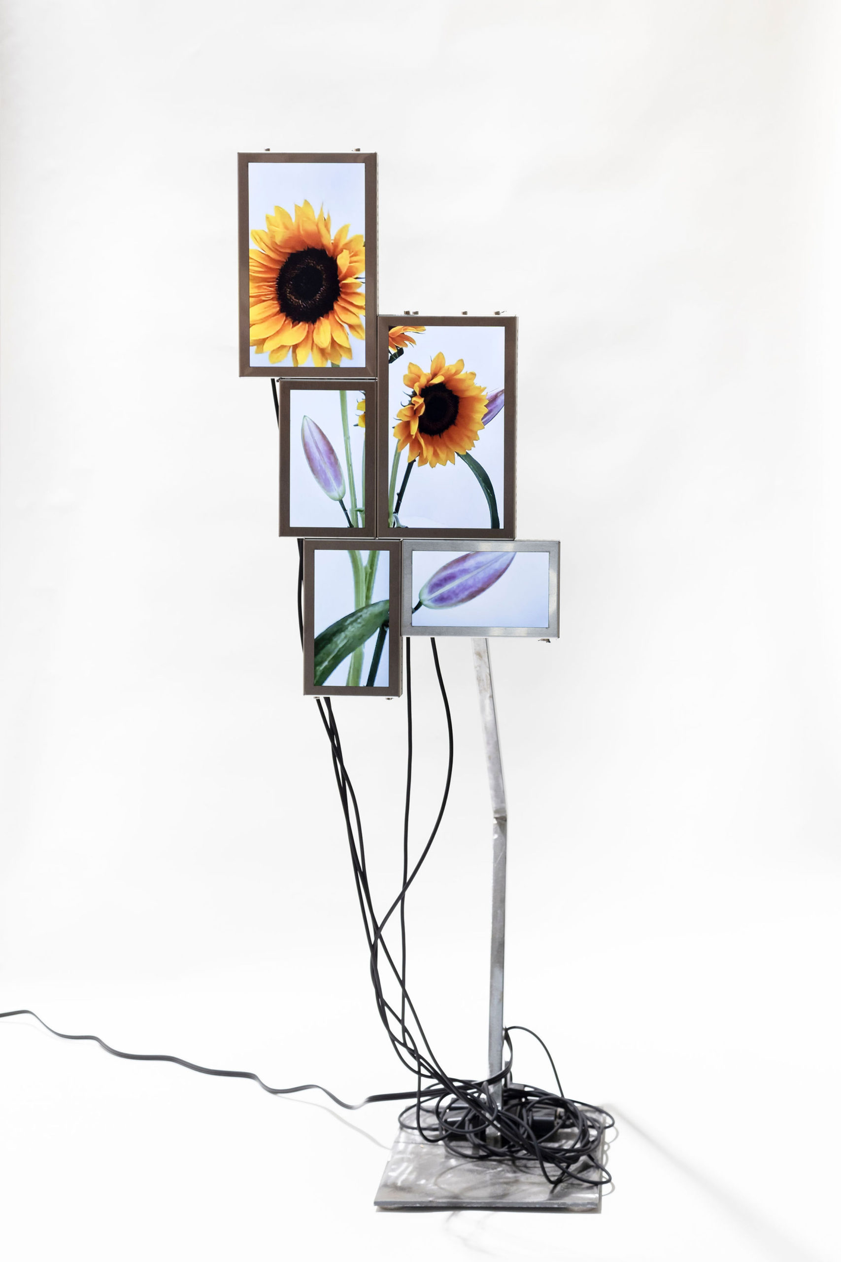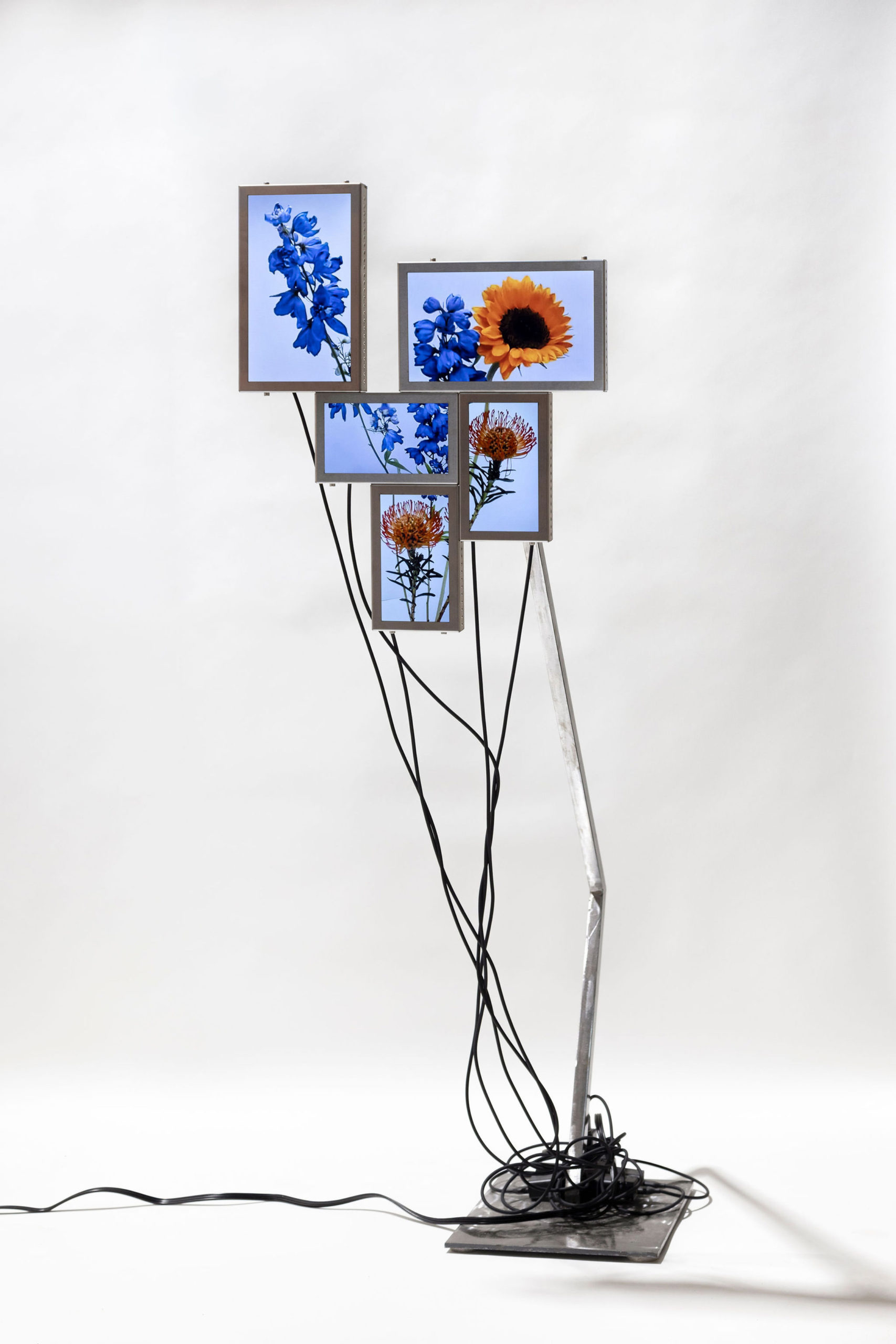 Cada pieza consiste en un mosaico de 4 a 6 pantallas LCD (10” y 7”), estructura de acero inoxidable, cables USB-C a USB y fuente de alimentación.