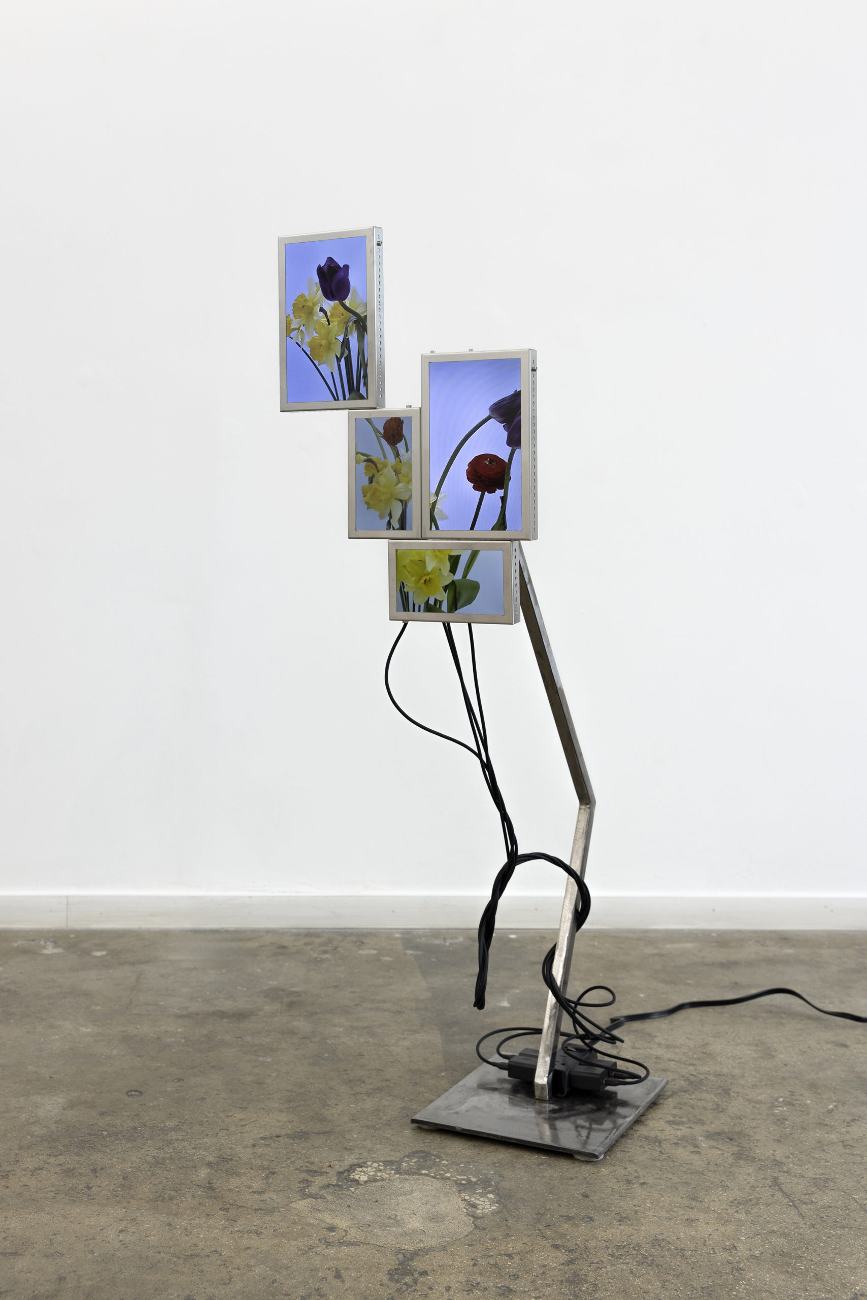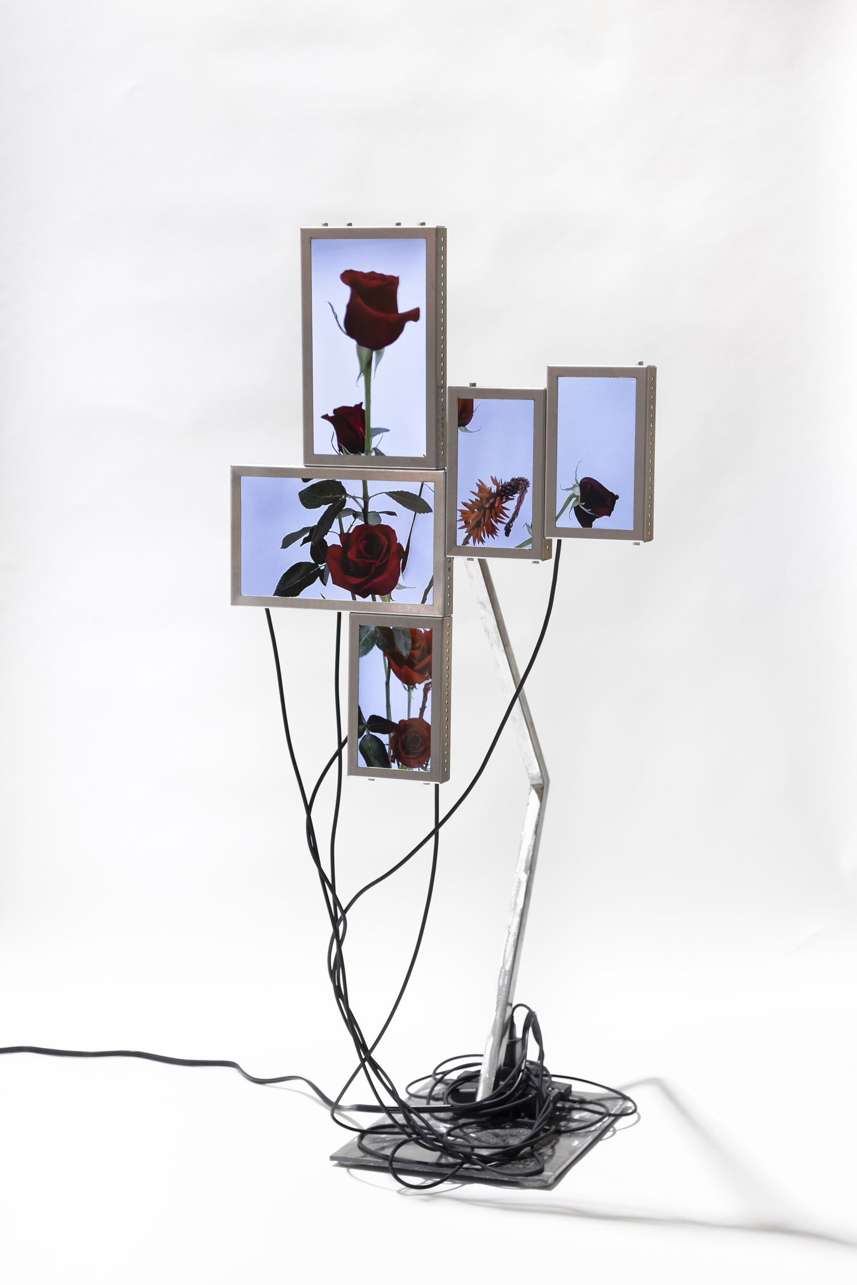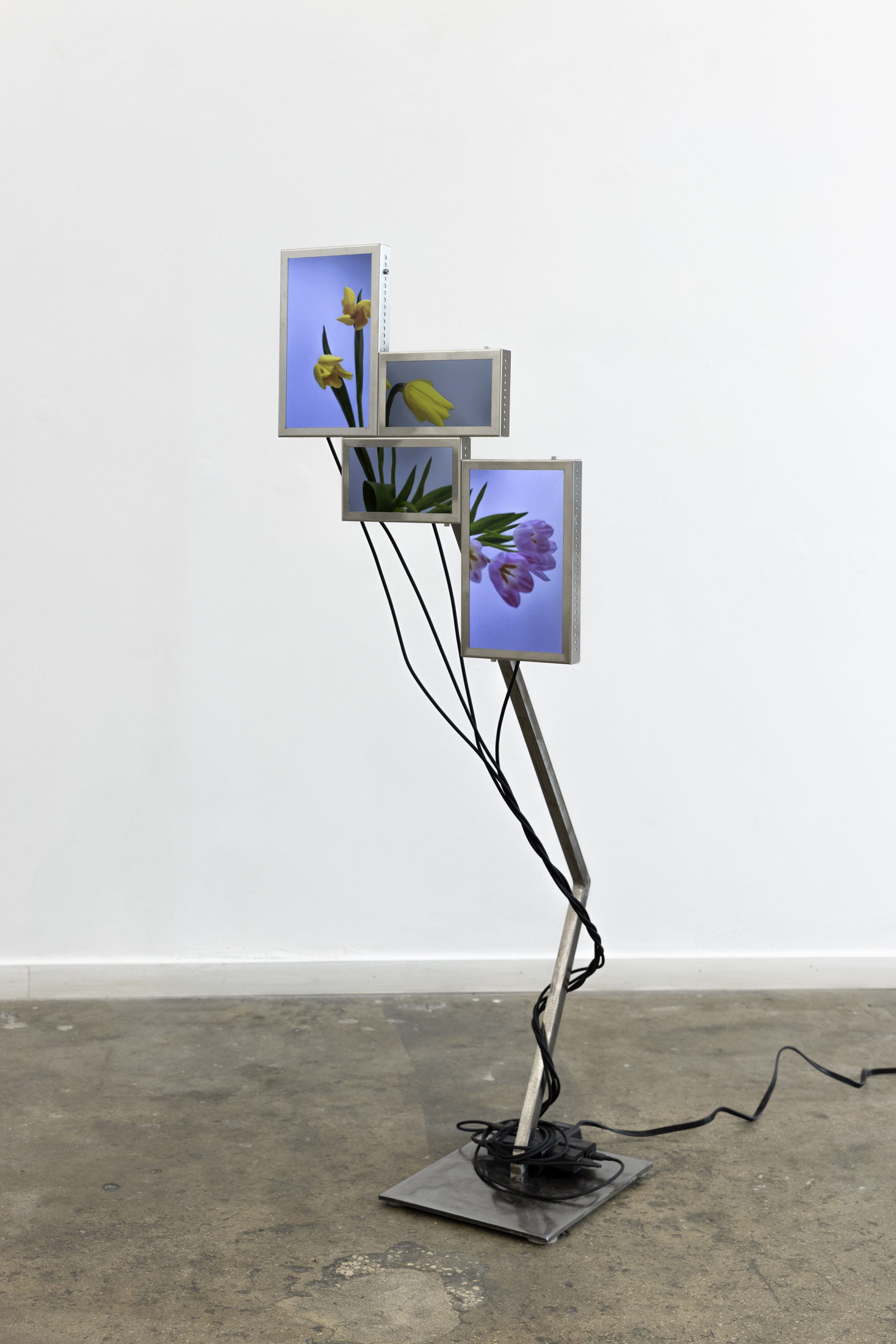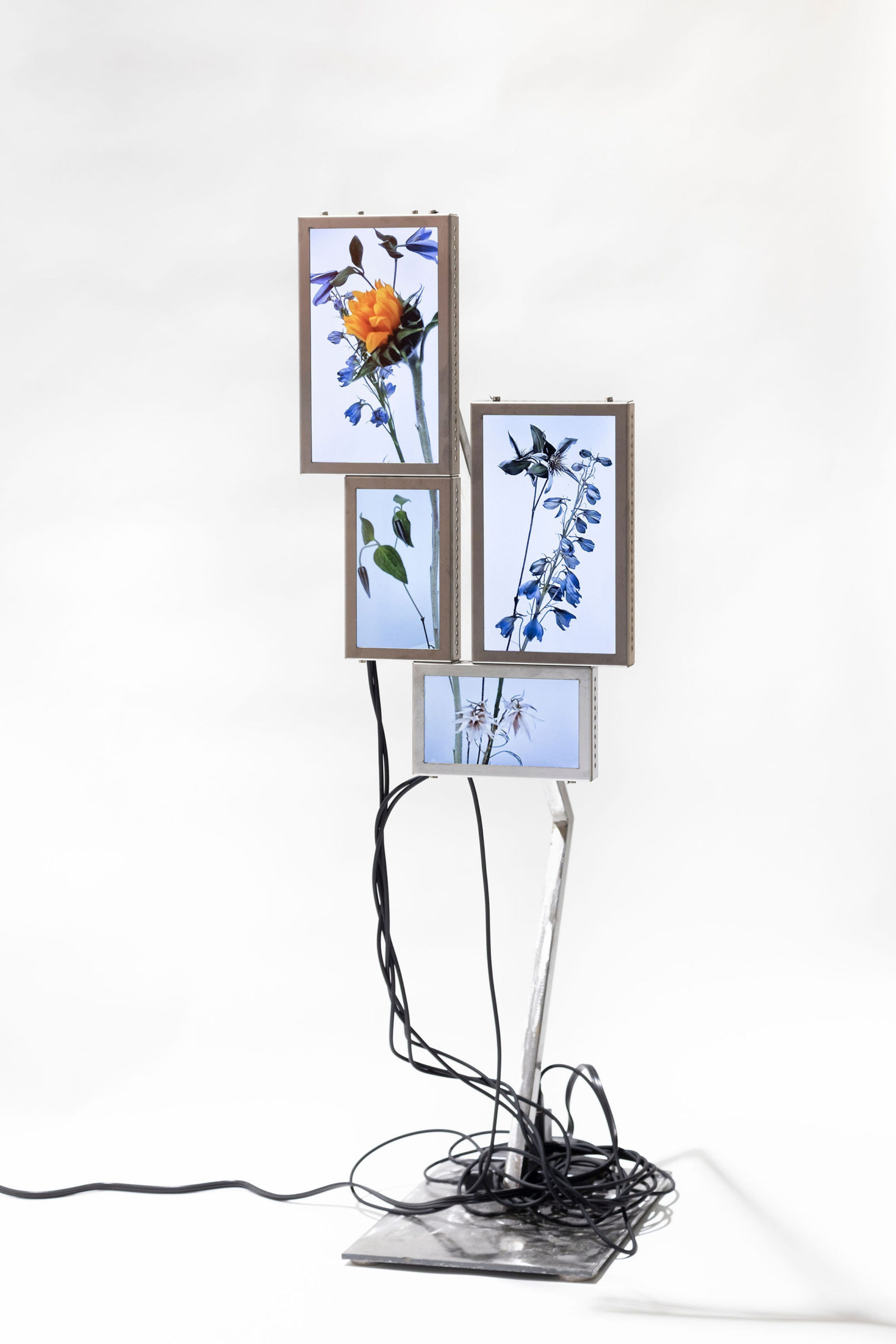 Cada pieza consiste en un mosaico de 4 a 6 pantallas LCD (10” y 7”), estructura de acero inoxidable, cables USB-C a USB y fuente de alimentación.