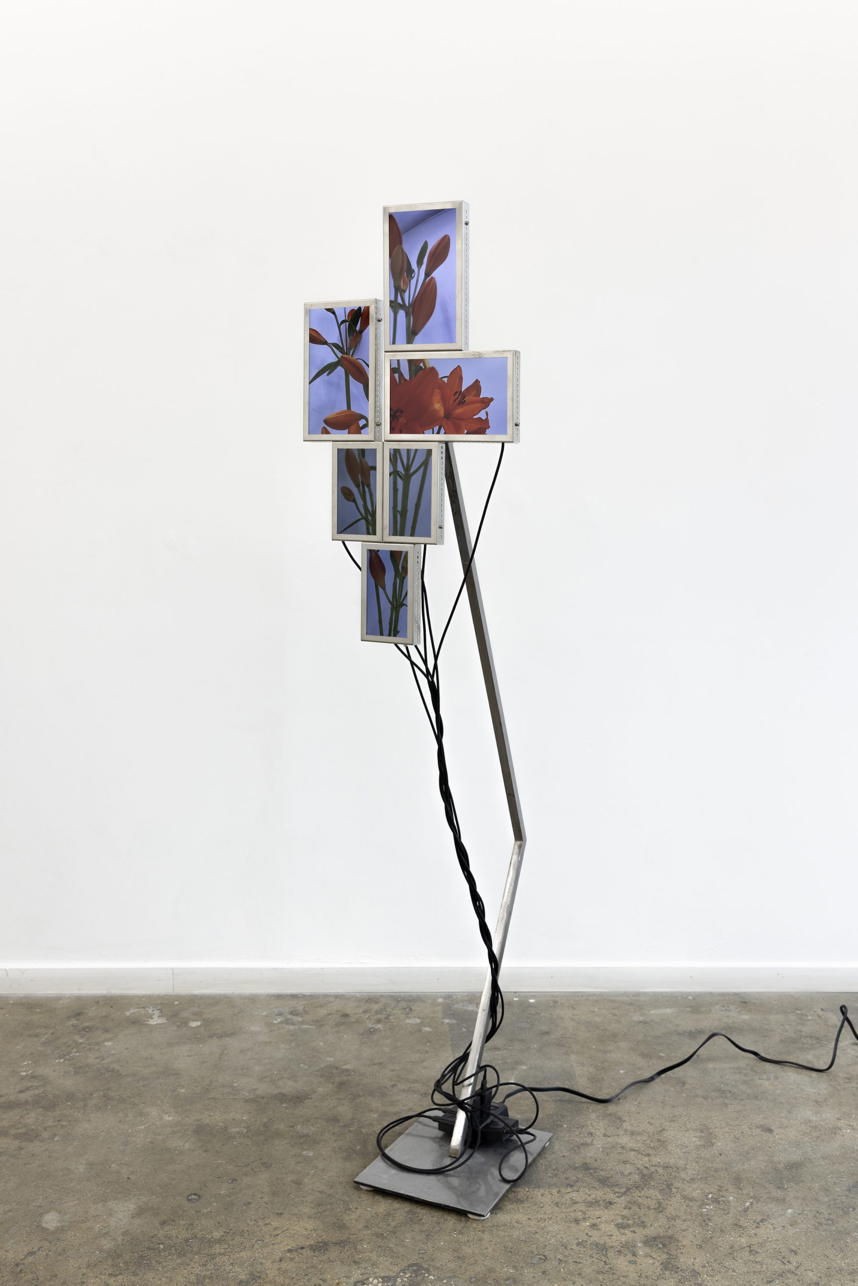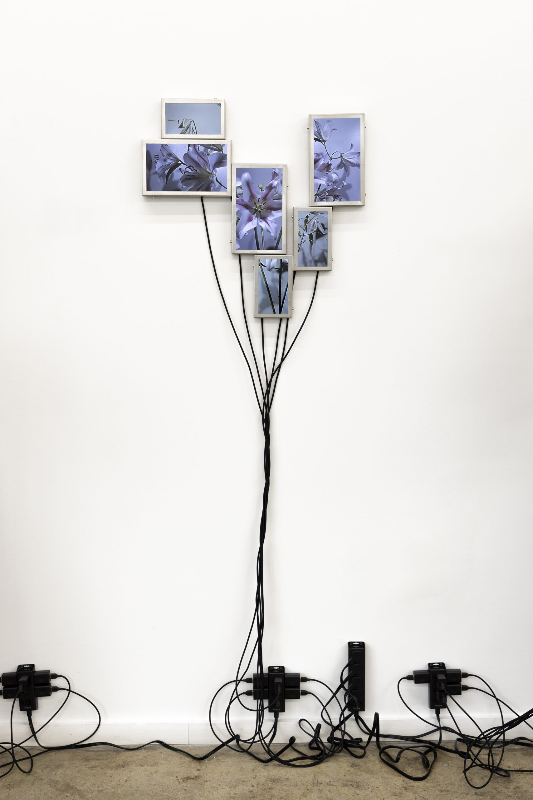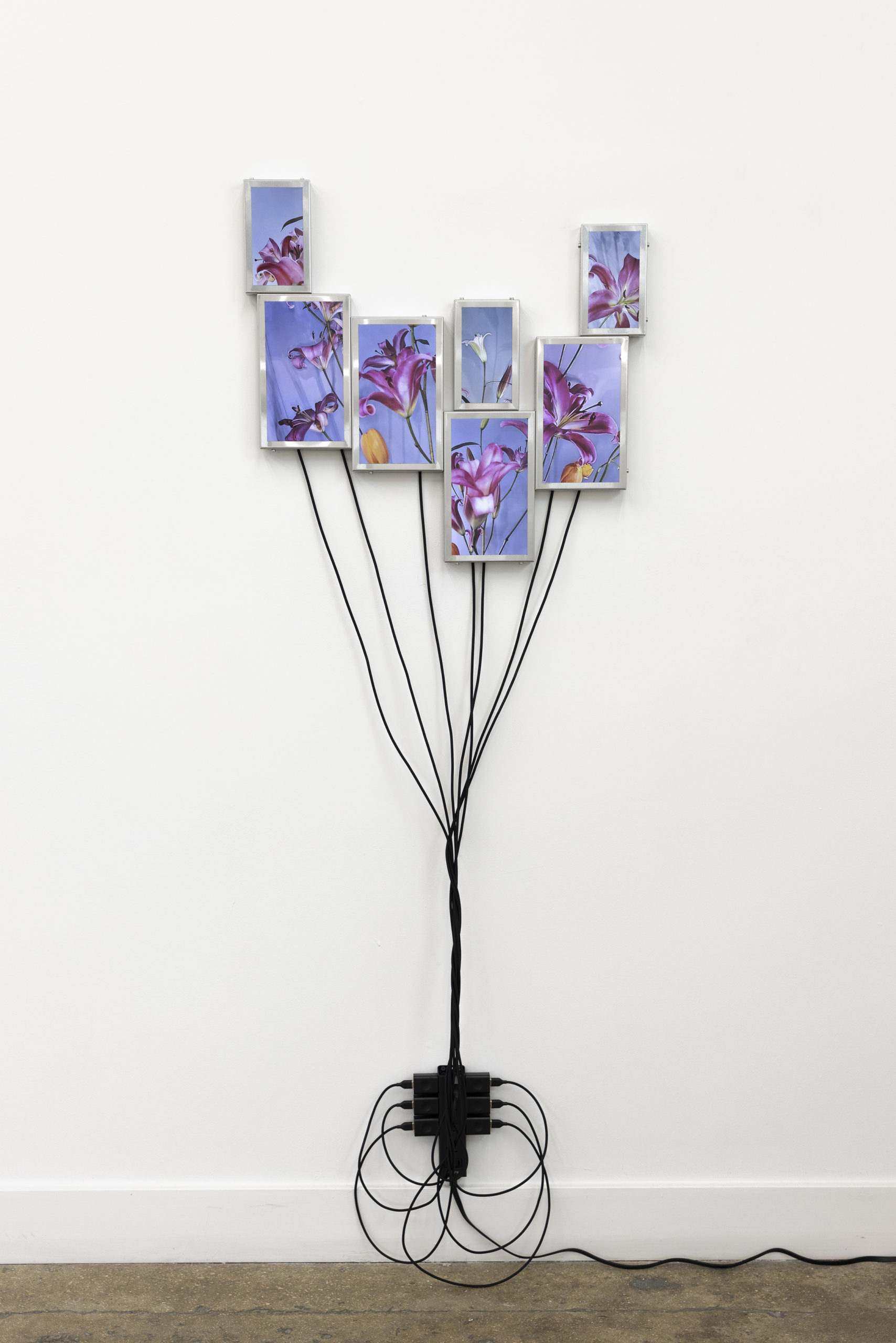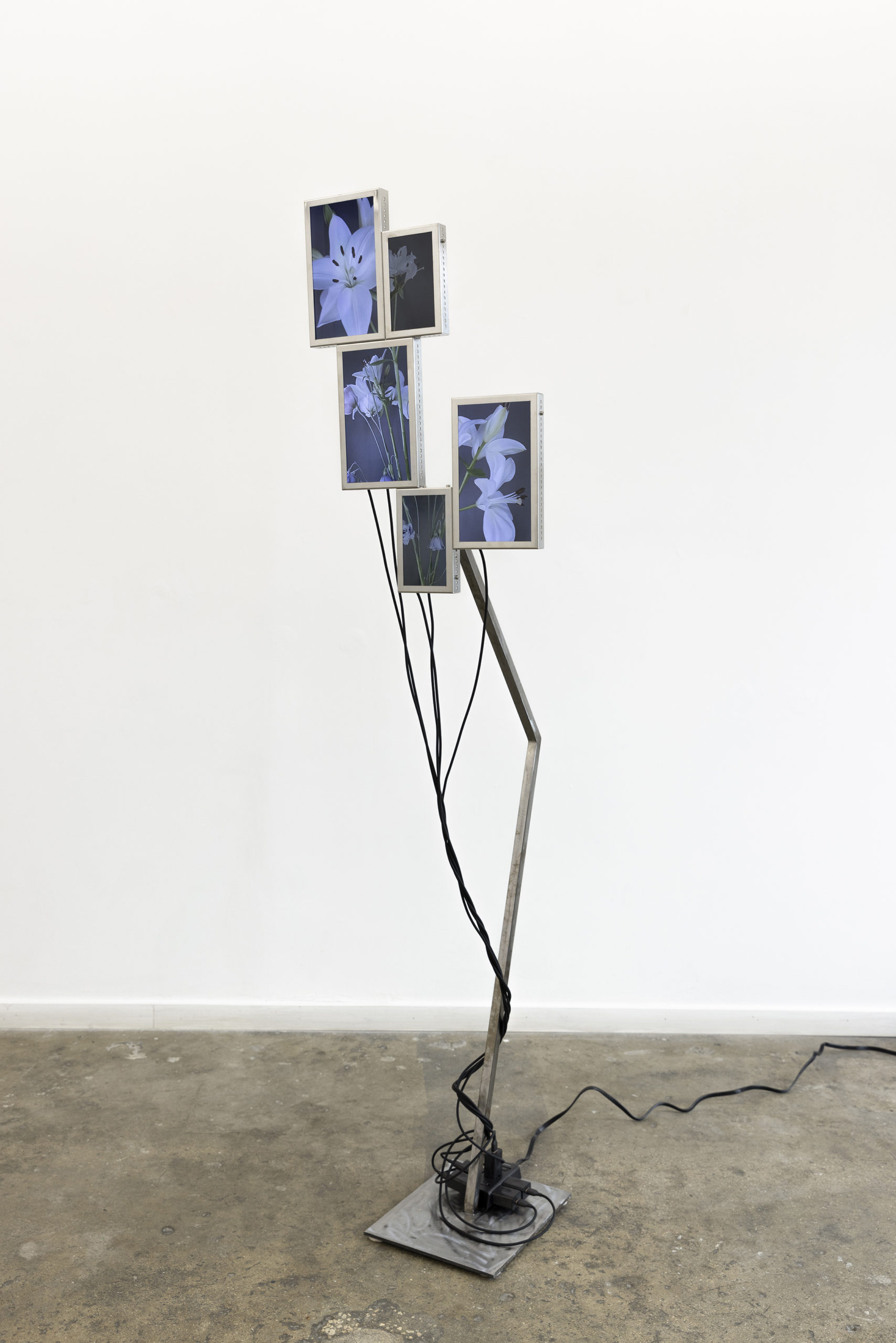 Cada pieza consiste en un mosaico de 4 a 6 pantallas LCD (10” y 7”), estructura de acero inoxidable, cables USB-C a USB y fuente de alimentación.