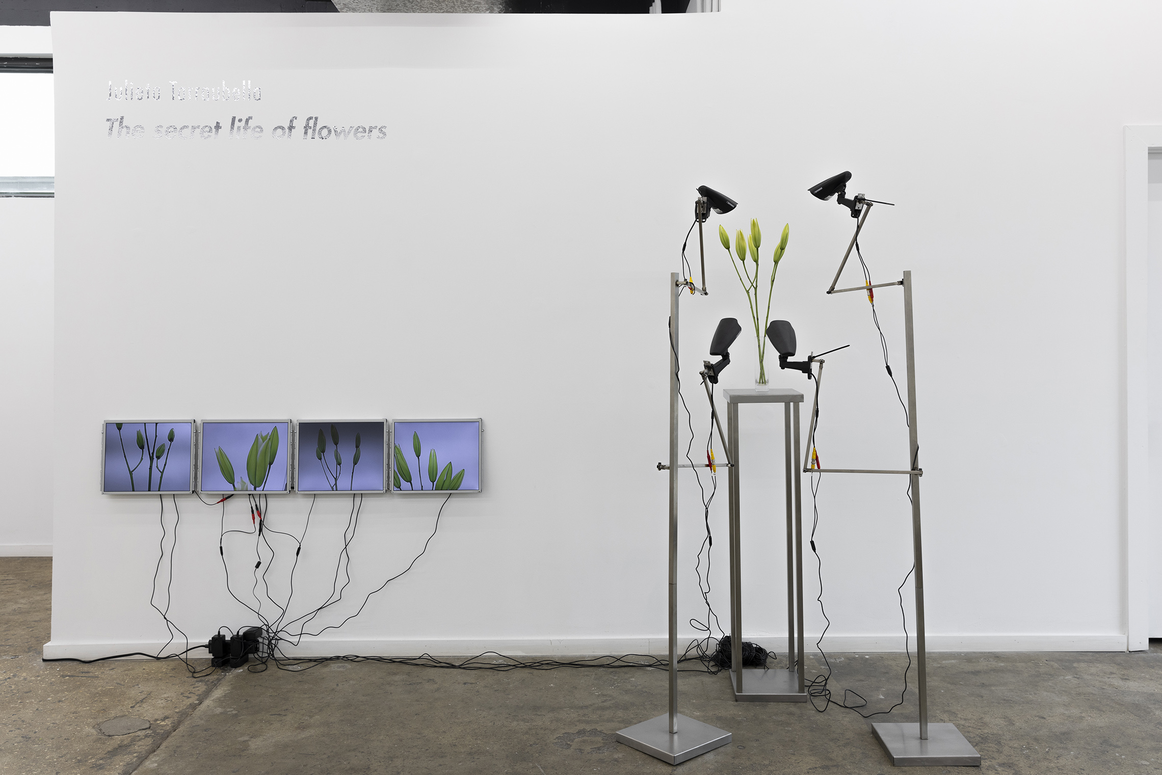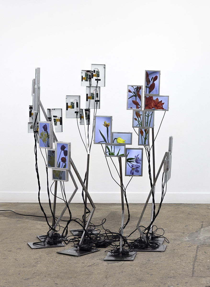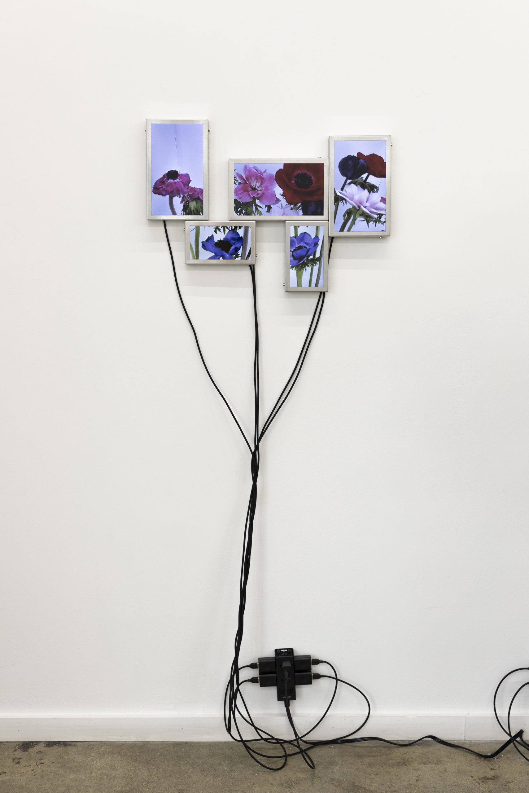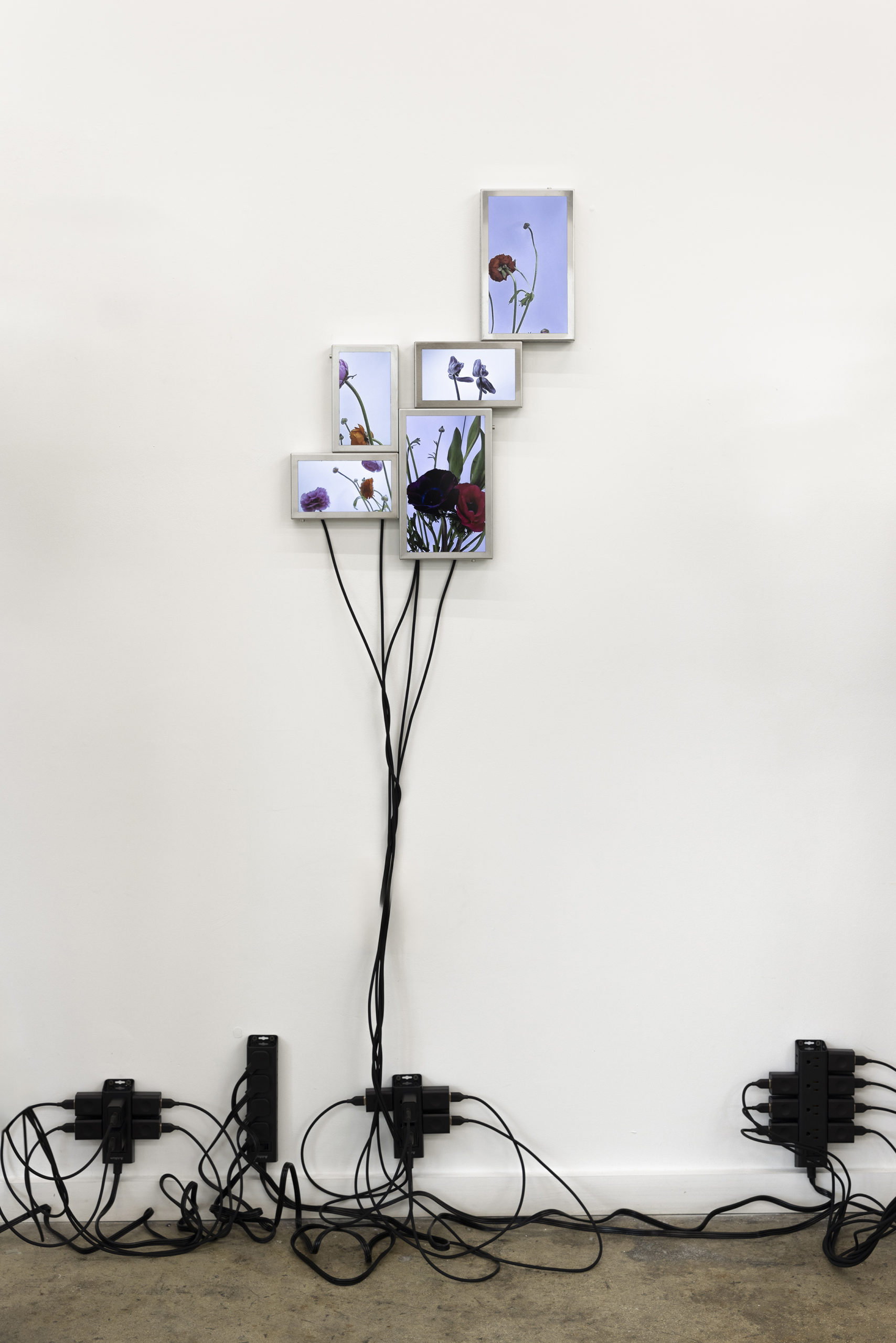 Cada pieza consiste en un mosaico de 4 a 6 pantallas LCD (10” y 7”), estructura de acero inoxidable, cables USB-C a USB y fuente de alimentación.